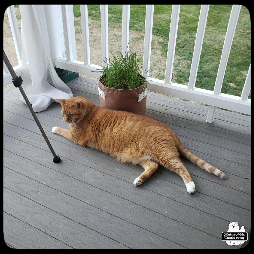 From the balcony, the three of us could hear two blue jays. They had to be close—not farther than Gnome Grove. I took the can of peanuts and tossed a few out. Ollie reached his head through the railing to watch. Gus decided to jump over to the roof. It looked like one of our friends/informants, “Lorry Sheep” Biretta, was in the dying maple tree. I let Oliver do the talking since he has a way with the birds and a softer disposition compared to Gus.