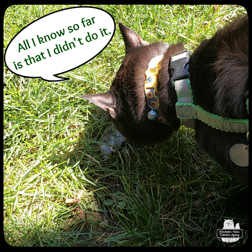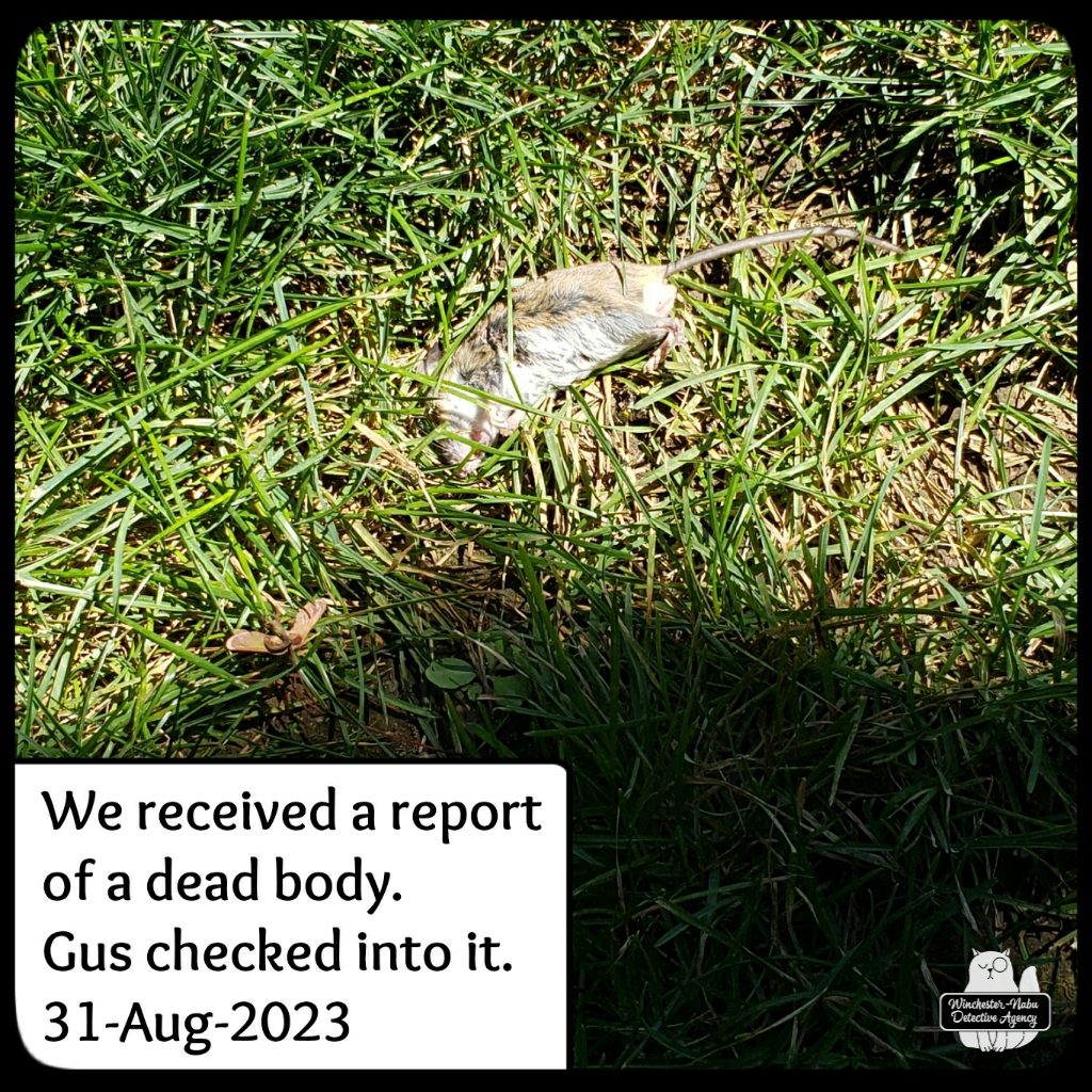The Butler discovered the body of a mouse victim at the end of August. We talked to any critter in the neighborhood willing to answer our questions. The surveillance camera footage was thoroughly studied and it places a likely suspect near the scene of the crime near the time of death. While we don’t have the specific DNA evidence that would officially close this case, we are unofficially considering it solved.