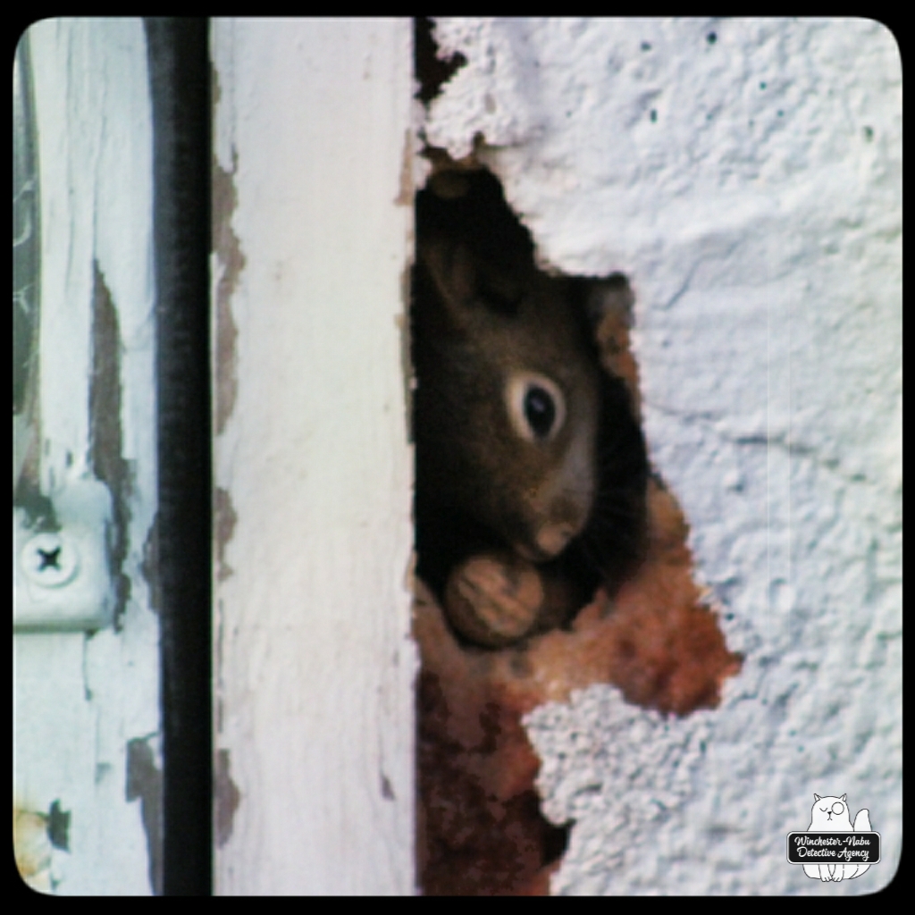 I gently knocked on the front of the building and placed a few peanuts in the entrance hole. I walked around to the back of the building and slid some peanuts under the corrugated roof which seemed to be a back door for the squirrels. Gus waited as patiently as he possibly could with the scent of critters tingling his Super Smeller. Ollie and I moved back a few feet so that whichever squirrel came to the door wouldn’t be overwhelmed.