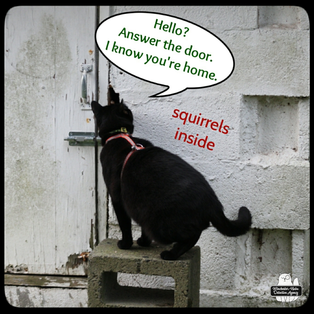 We could hear the scratching sounds of claws navigating through the walls. The hole in the front of the building was mostly shadowy darkness. I had a hard time seeing what was moving around back there, but no doubt, the extraordinary sight of the cats allowed them to see more. All I saw was a peanut sliding into that shadow and disappearing. Three peanuts disappeared and I hadn’t seen anything more than a blur. Gus hopped up on the cinder block next to the well house door and spoke to someone on the other side.