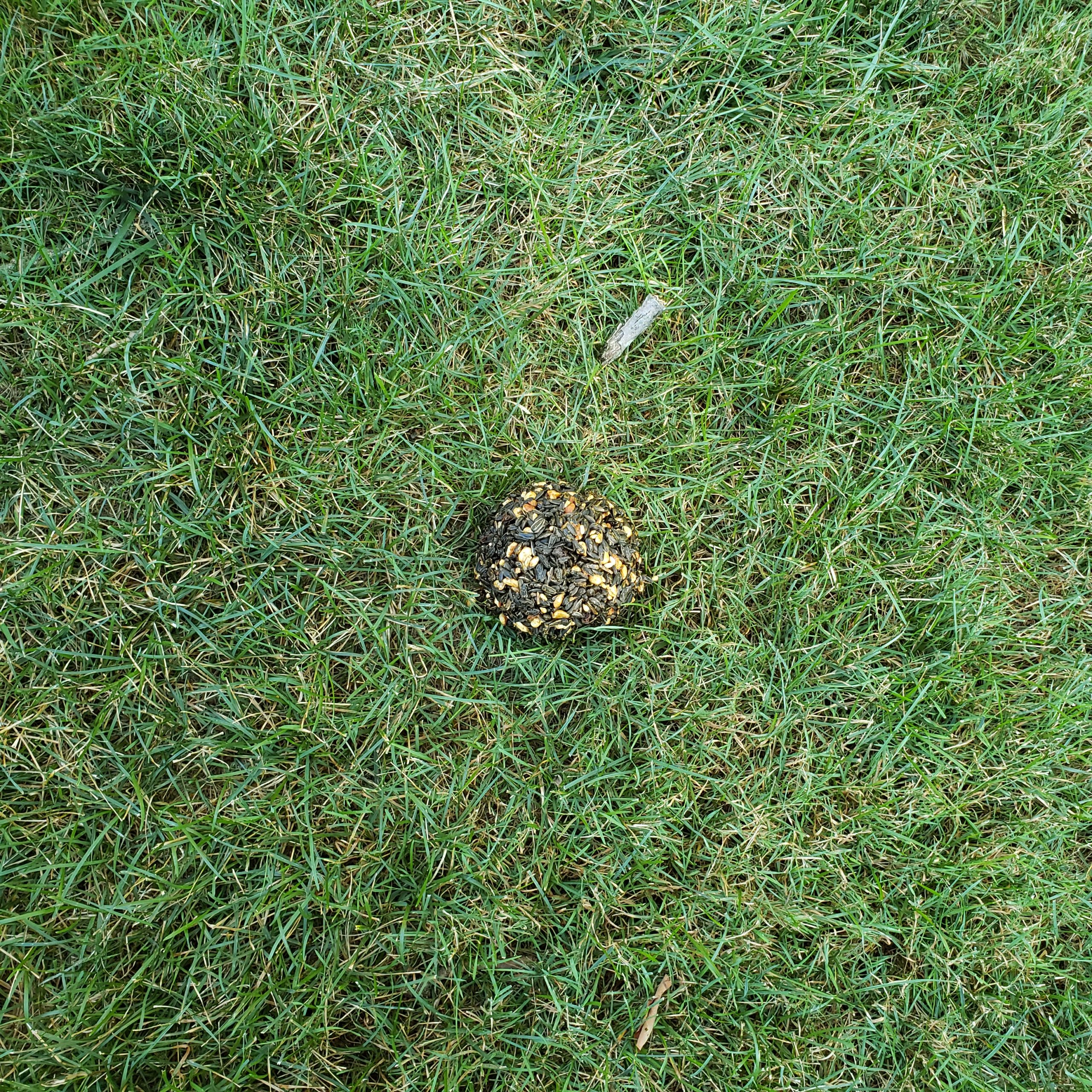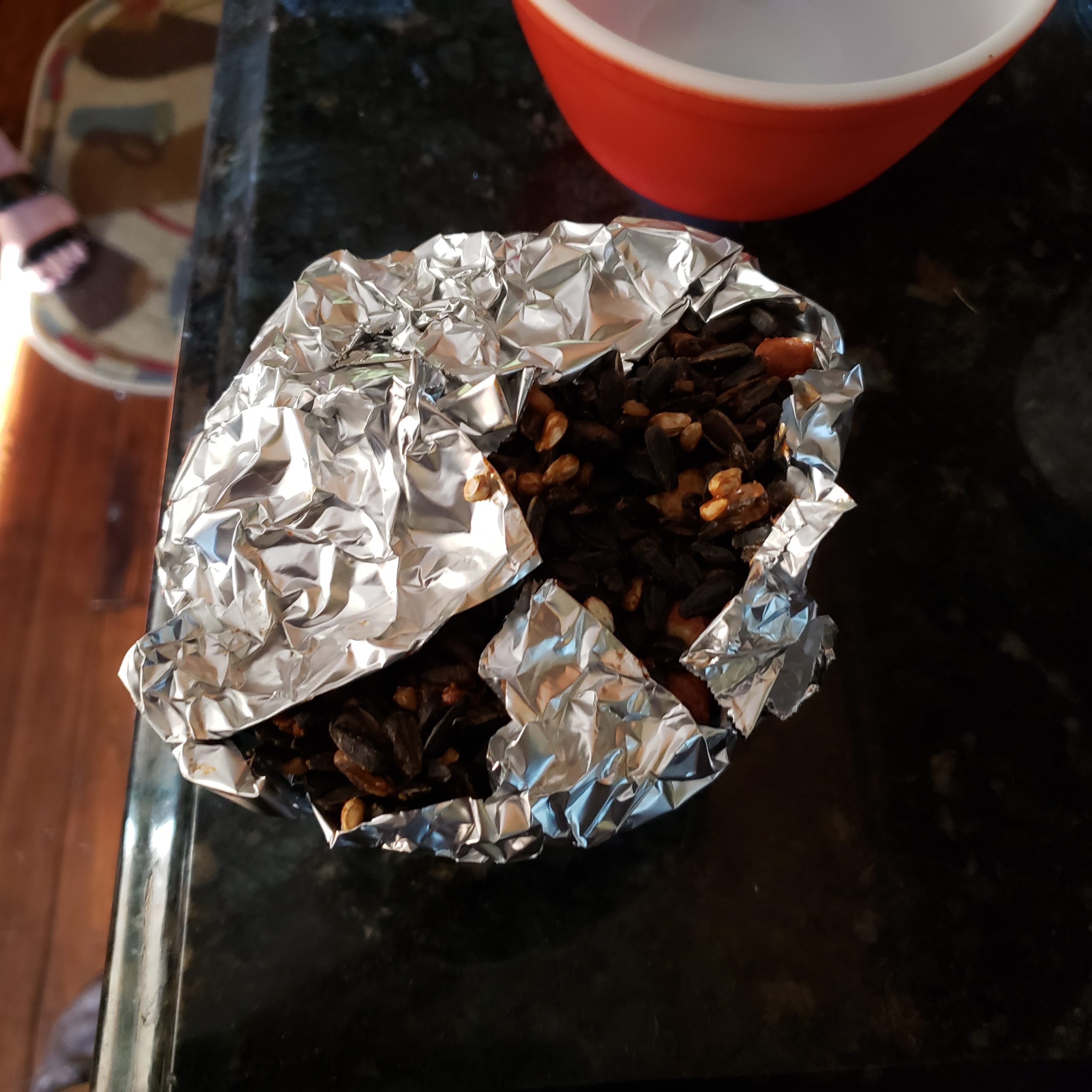 I took a large mixing bowl, the PB powder, the bird seeds and some water and mixed it up in no specific measurements. It was gooey enough that the PB was hydrated and there were enough seeds to make it more than a giant bowl of PB. I lined a smaller bowl with foil and dumped the mixture into that. I guess there’s really no point to that step if you’re going to do what I did and put the mixture onto the ground in a blob. Having it in foil made it a bit safer for carrying through the yard—no worries about dropping a nice mixing bowl.