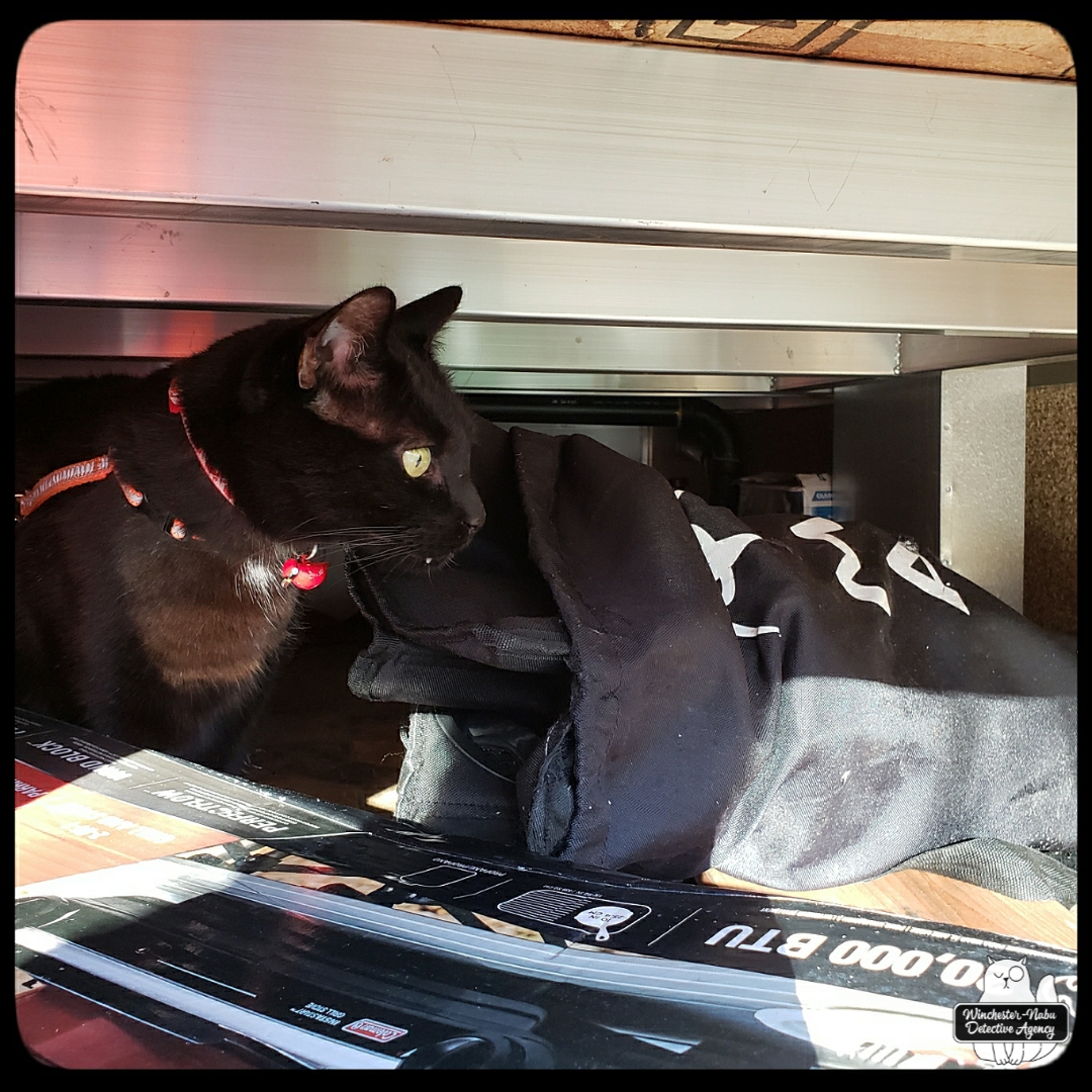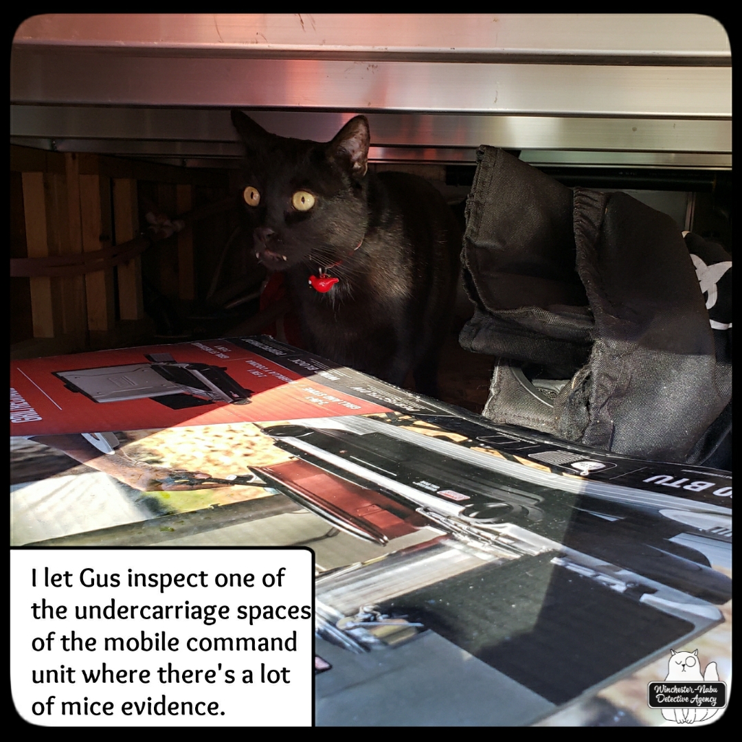 In the videos, you probably can’t hear the clattering of tiny claws, but Gus and I were listening to them. You can see how alert Gus gets when he knows the mice are right overhead somewhere in that ceiling. I never know what Gus has on his agenda. We often don’t get to the inspections portion of our patrols until we’ve already been out for over an hour (and I’m tired). If I knew where some of the gadgets in the garage were kept, I could come up with other ways to make our inspection more efficient. For instance, I know that The Grumpy Old Man has a type of camera that’s on a flexible wire to fit through engines. If I could find that and thread it up into the ceiling of the MCU, I wonder if we’d catch the intruders on camera.