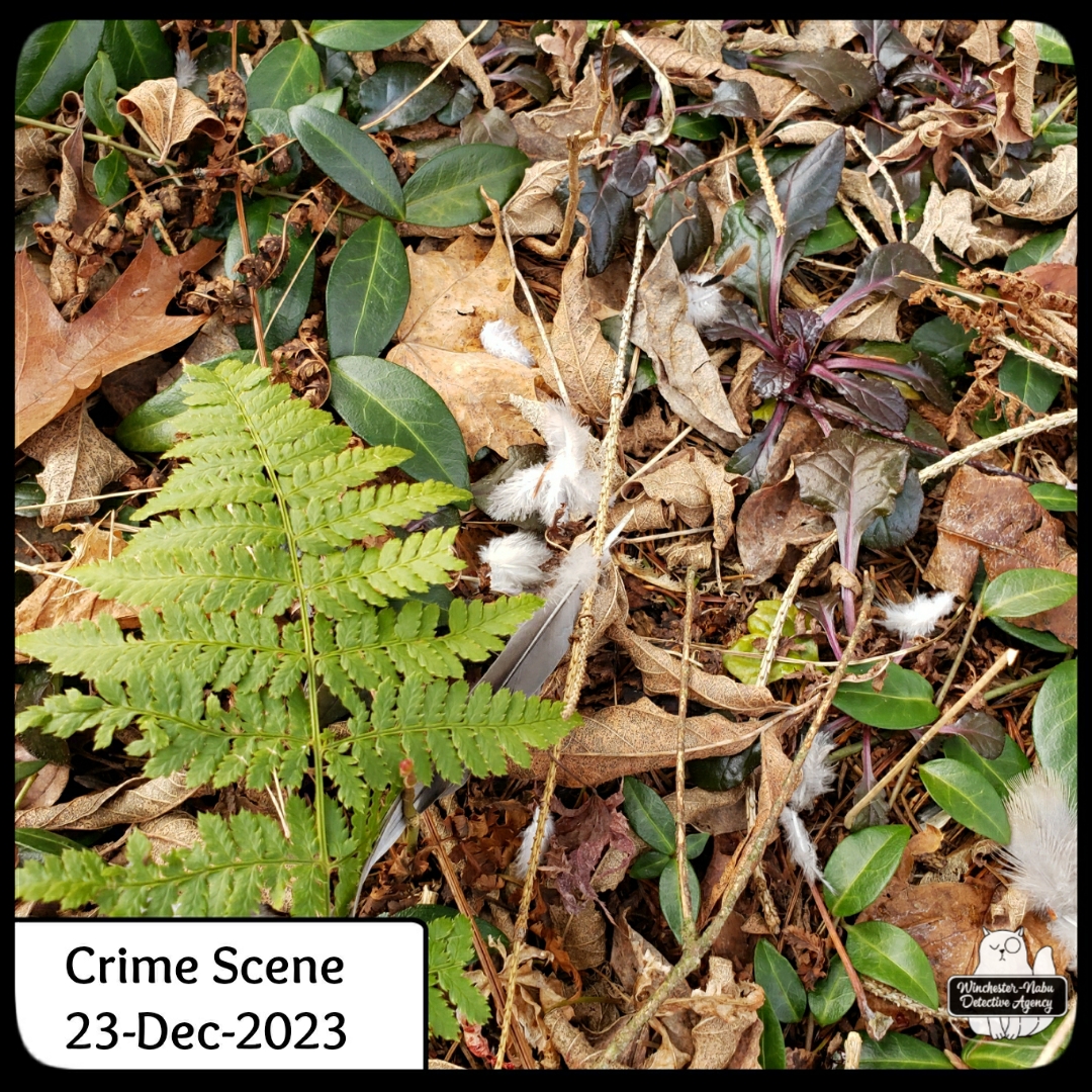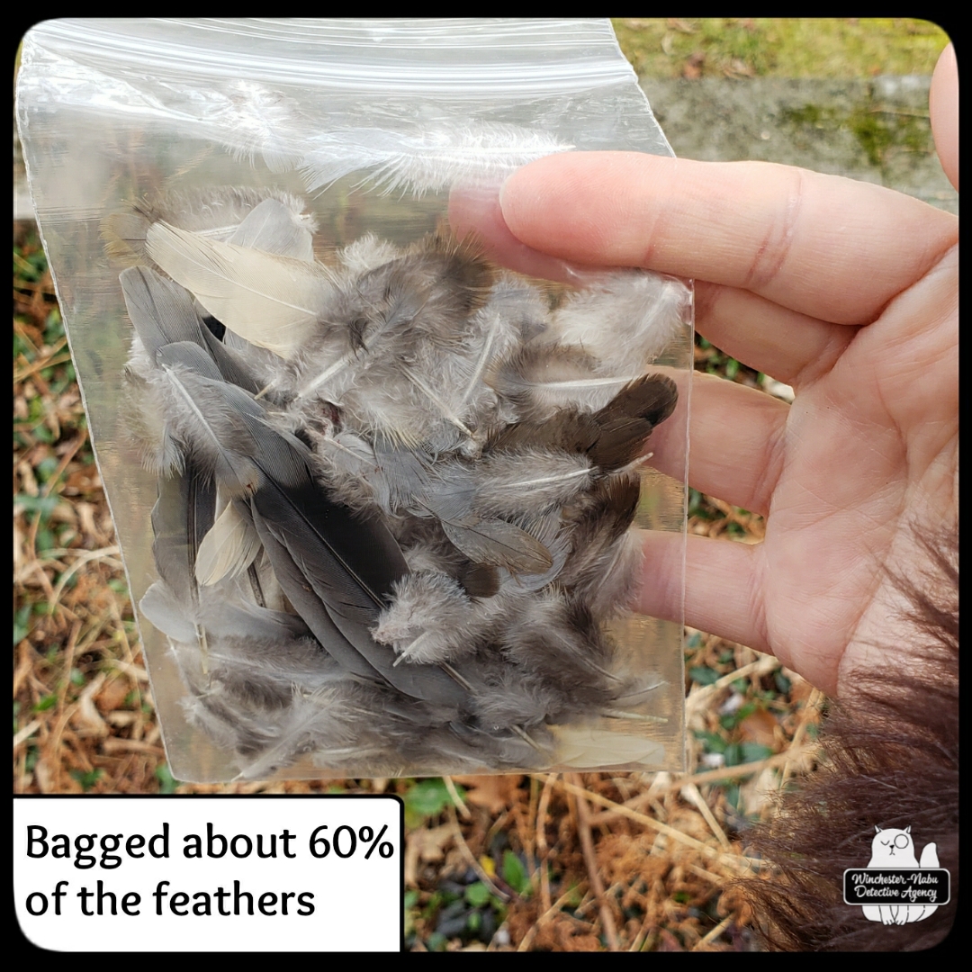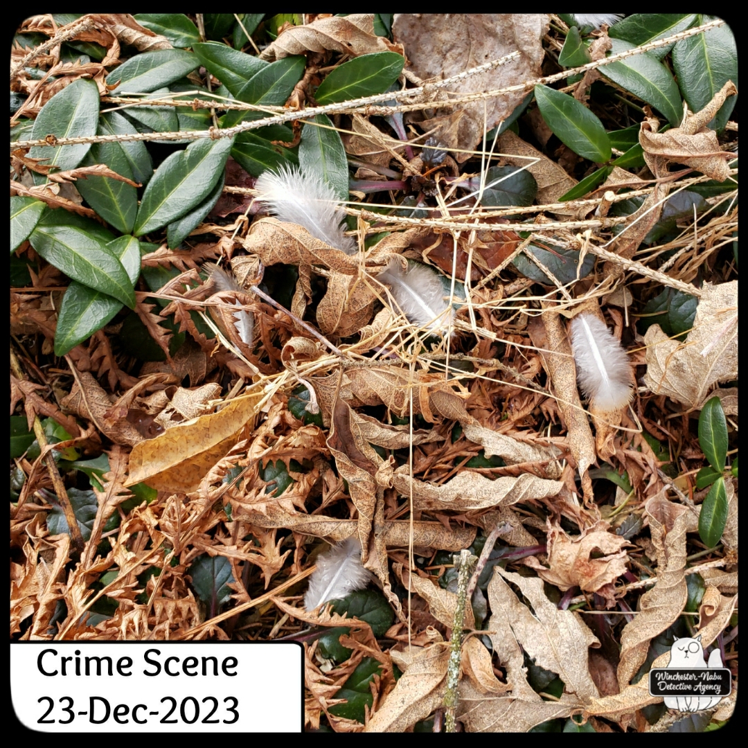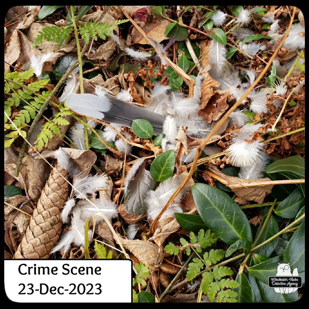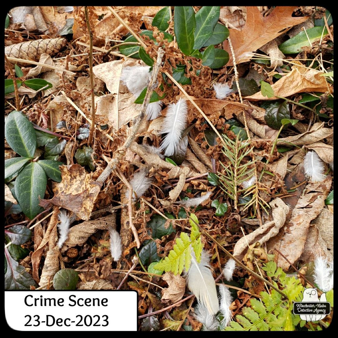 mourning dove feathers on the ground; crime scene 23-Dec-2023