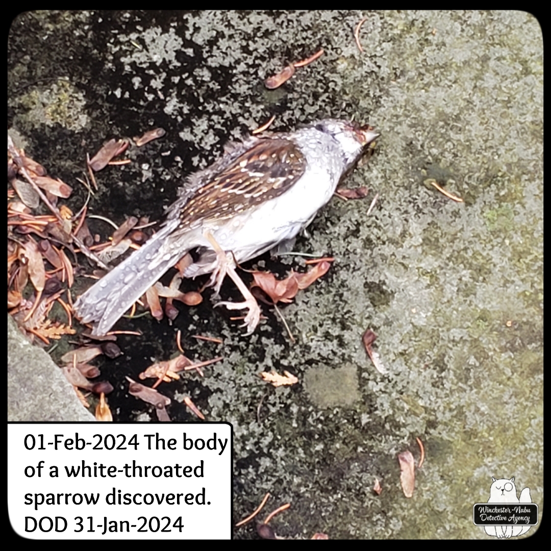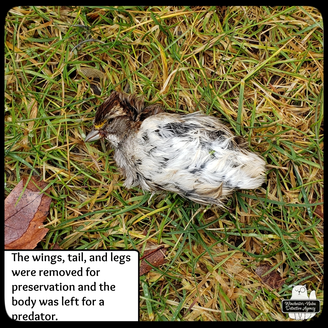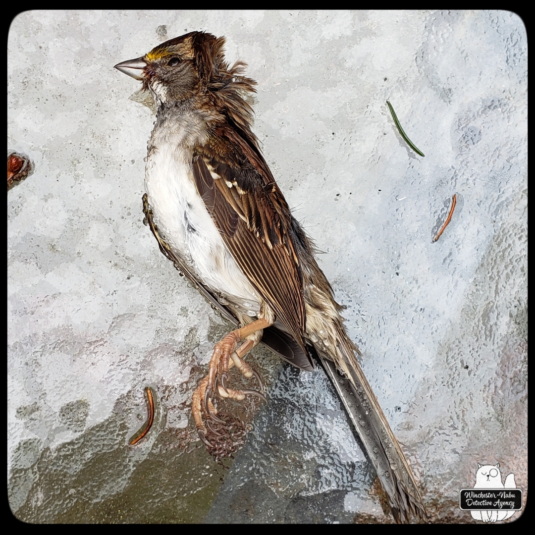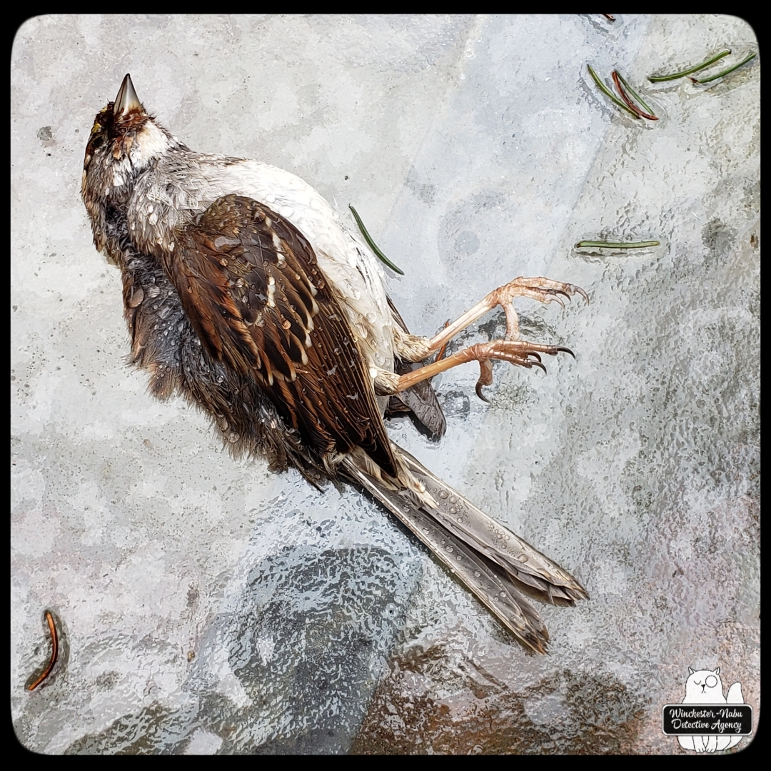 In our case of this white-throated sparrow, there was no apparent cause visible with external examination. I was not about to perform a necropsy on one of the patio tables without a lot of prior research and proper tools. I did a rough job of removing some bits for preservation and put them in desiccant sand. This meant that Gus and I had to take in all the possible clues from the crime scene.