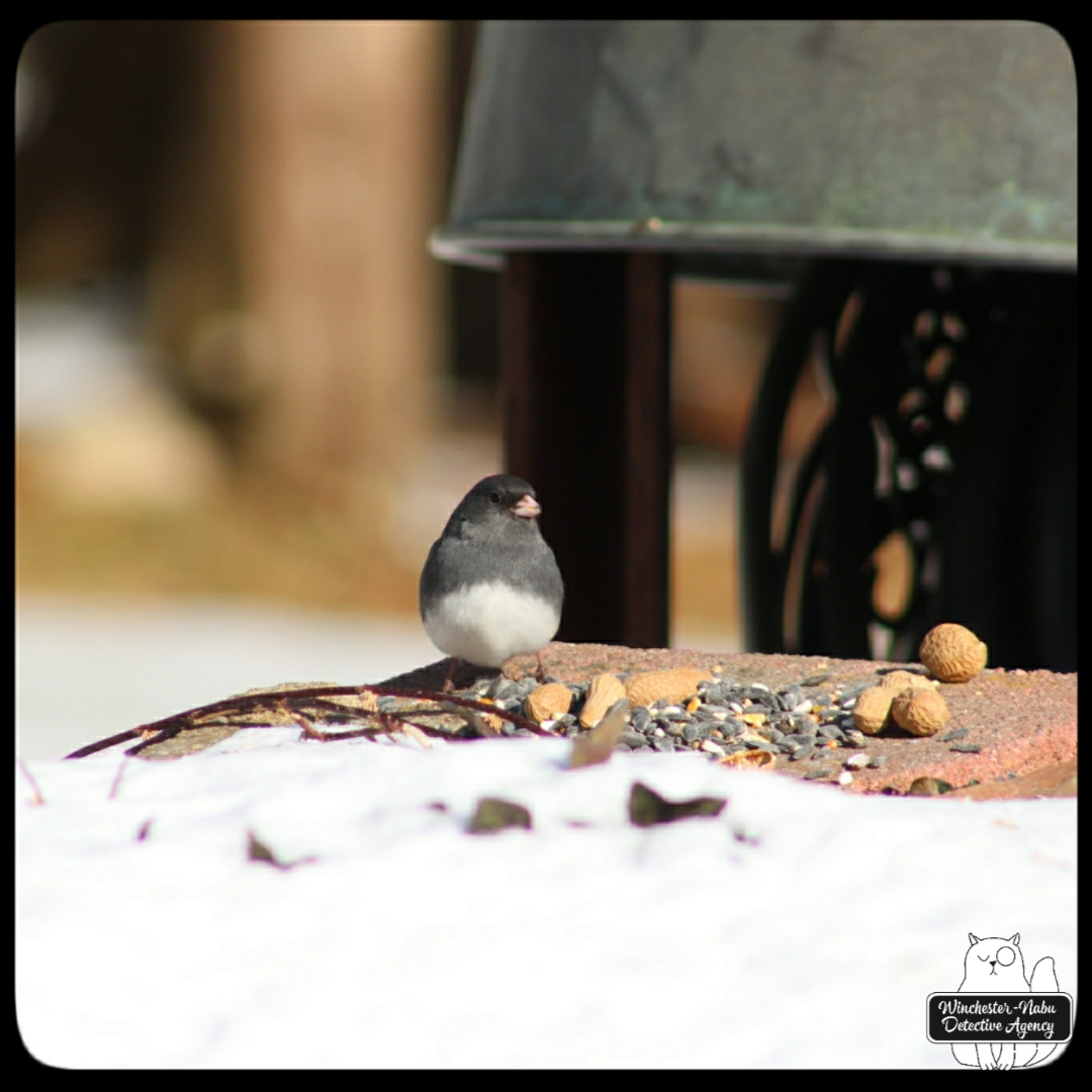 The feathers at the crime scene definitely belonged to a dark-eyed junco. The condition of the feathers indicated a violent attack. The body was not found—presumably eaten by a predator. If it wasn’t Lokai, the black and white cat, the murderer is either another domestic cat or a large bird. The murderer had help in this crime. El Diablo was hired to disable the security cameras. This case did not present any signs of magical activity.