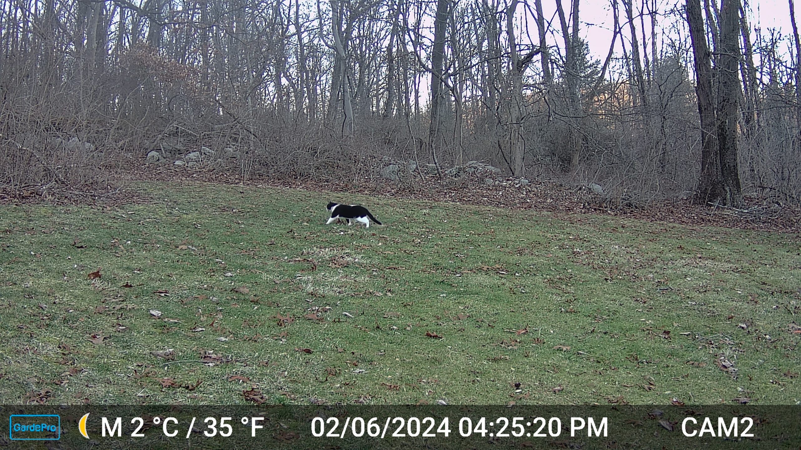 Most recently, the trailcams have a black cat and a black and white cat we’ve code named Lokai because we don’t know their real name. We’re pretty sure Lokai was responsible for a dark-eyed junco murder that I wrote about in December. I’ve reviewed footage from the past two months, and Lokai is the stranger who shows up the most frequently. To be honest, we only deduced through evidence we found that Lokai could be a killer and didn’t have any solid proof like security cam images. Lokai also looks rather well fed. Could we be making a terrible mistake blaming an innocent cat?