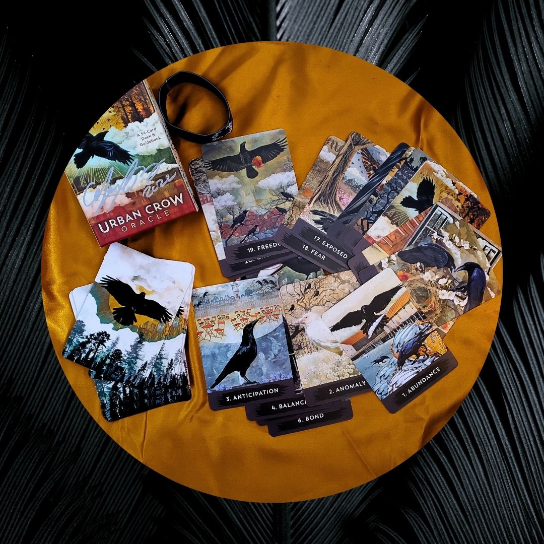black cat Gus standing over a card and the Urban Crow oracle deck