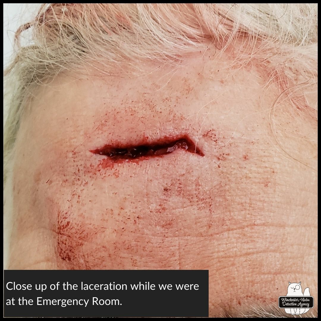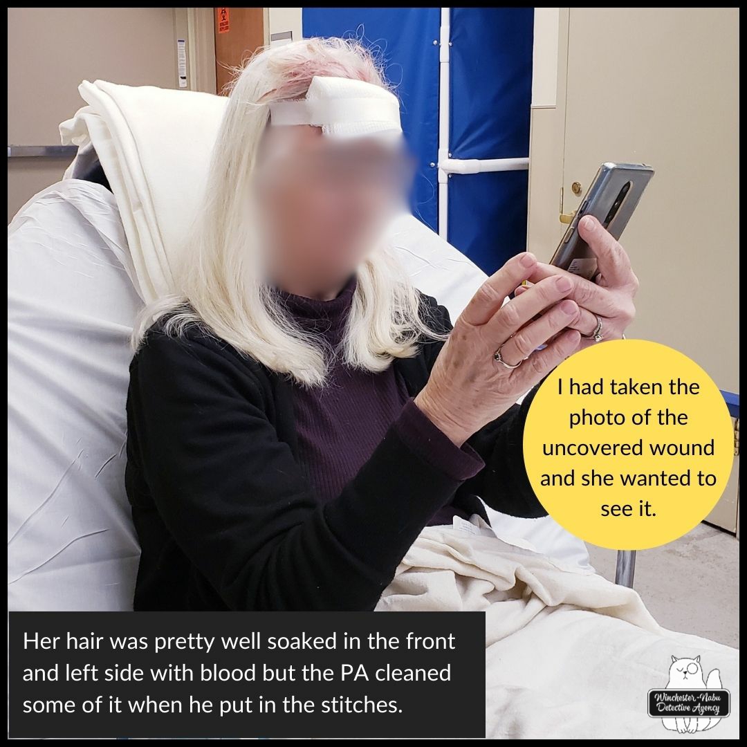 After all the panic, anxiety, frustration, stitches, worry, anger, embarrassment, more anxiety—The Cook still insisted on cleaning up the kitchen and starting a load of laundry to clean the bloody clothes and towels. I had already put away the uncooked food, but seriously, a few dishes left out (clean ones, btw) did not make a tragedy that required tidying up at that moment. She had her head wrapped and some stains of blood still streaking her white hair where the Physician’s Assistant, Jared missed spots. He was kind and gentle to her trying hard not to remove any of her hair (I guess a lot of women worry about that). I said she can wear a babushka for a while.