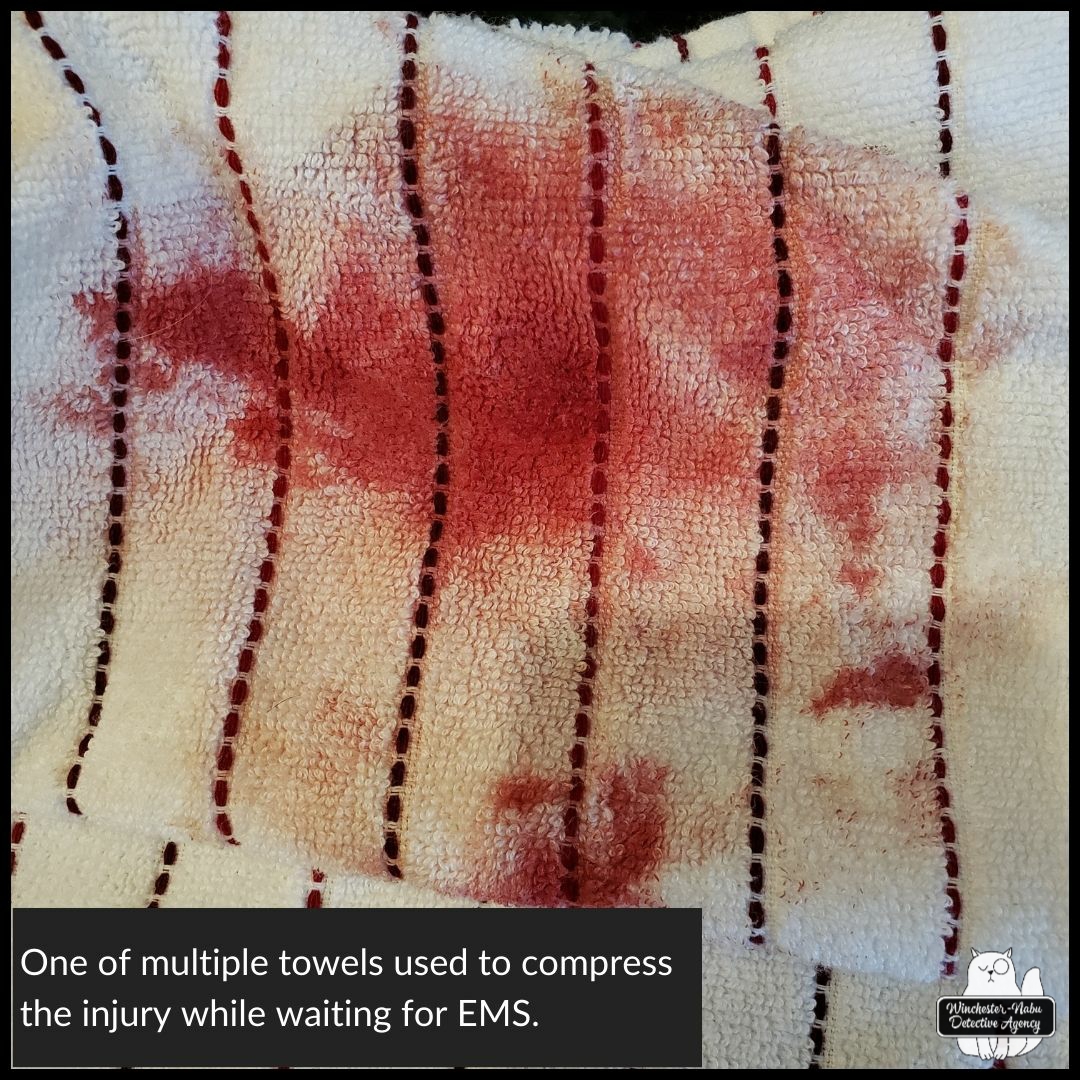 We waited around 20 minutes or more for an ambulance because the EMS service in our town was disbanded and the closest station called was redirected to a higher priority case—a little baby girl, about a year and a half, was having a seizure. At least the cop was there to give us those updates and he did more First Aid. We had the bleeding under control and she was conscious, alert, able to speak, knew her name etc. She was aware enough to yell at me when I gave the wrong age to the dispatcher. I said, “female senior citizen age seventy-fine…” and from the other room, I hear, “SEVENTY-EIGHT!” She was shaking a lot from the adrenaline and that took hours to subside. We made small talk until an ambulance finally arrived.