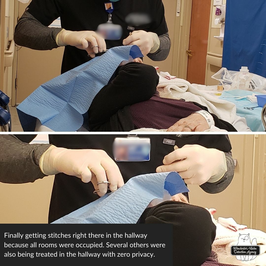 Yet the woman who takes admissions info in order to make sure to bill patients was wheeling around with her cart between stressed out patients and staff. She also kept coughing into her arm but wasn’t wearing a mask. Only a few people were masked besides myself.