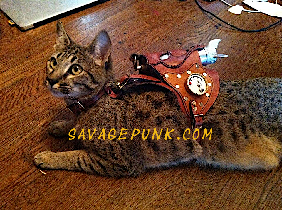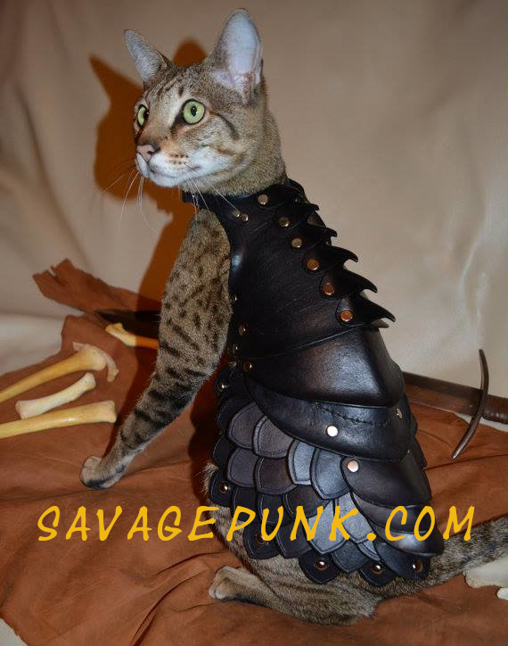 In the realm of cat armor, you might have seen an uncredited tabby wearing medieval style leather body armor. A little sleuthing brought us to Savage Punk Studio, creators of fine leather accessories.