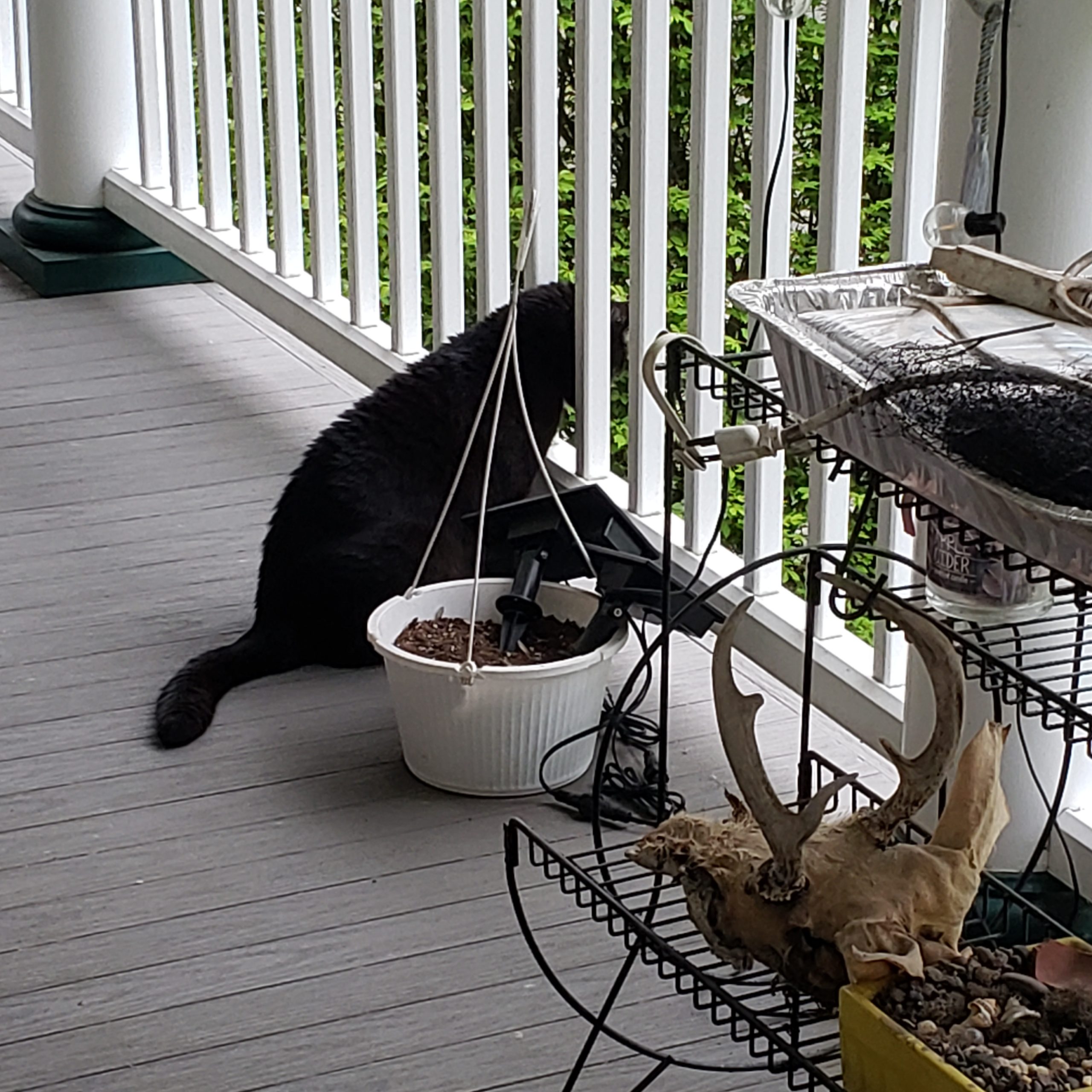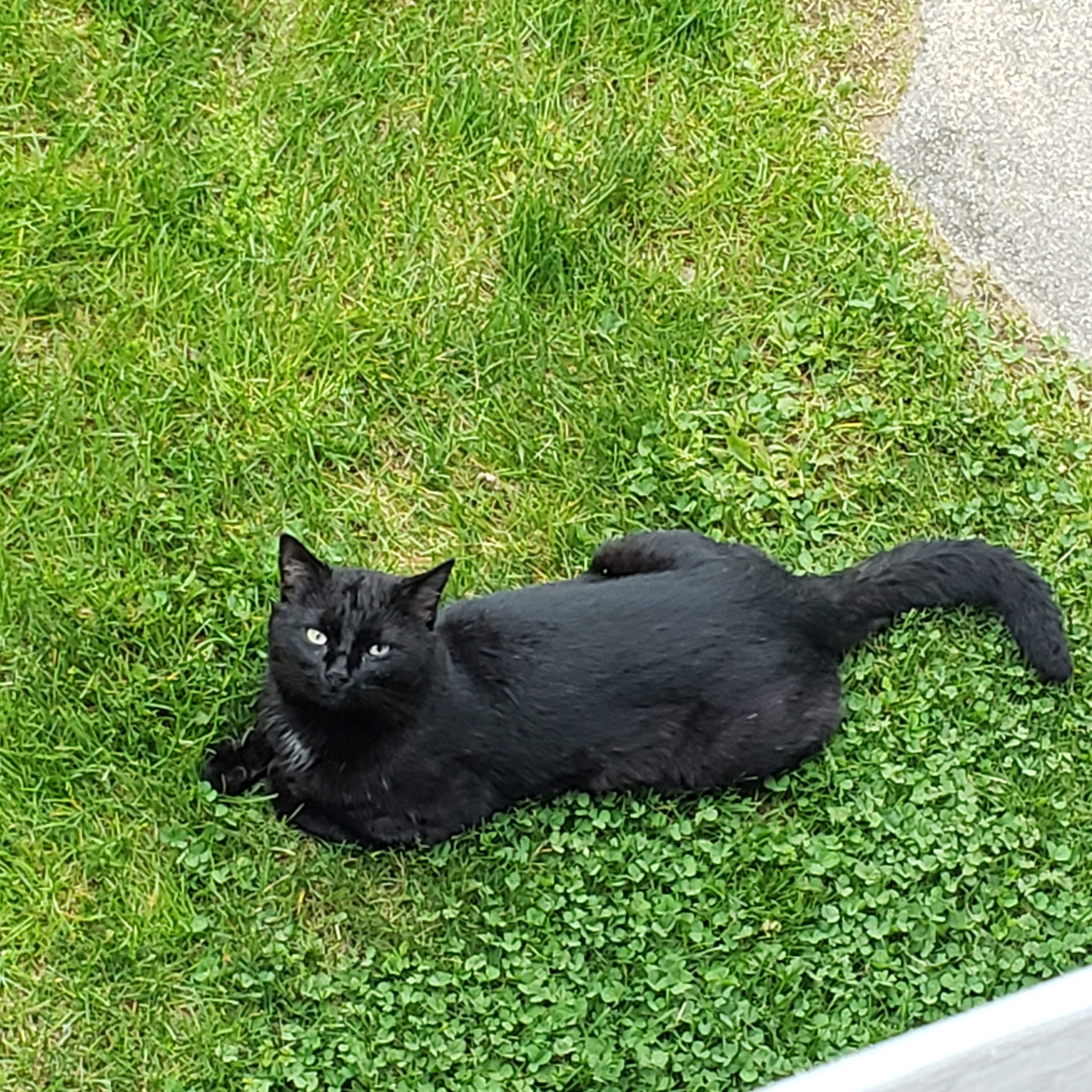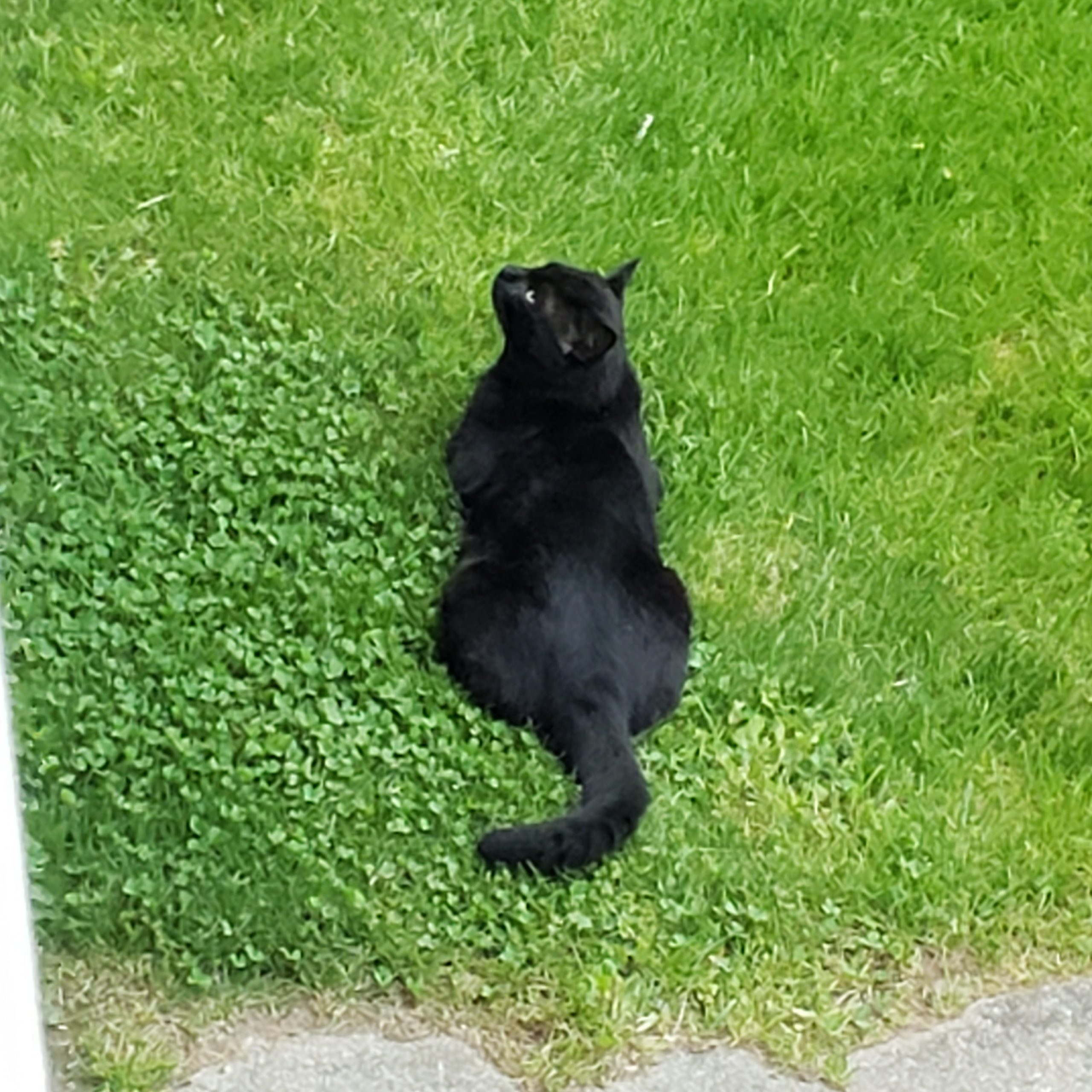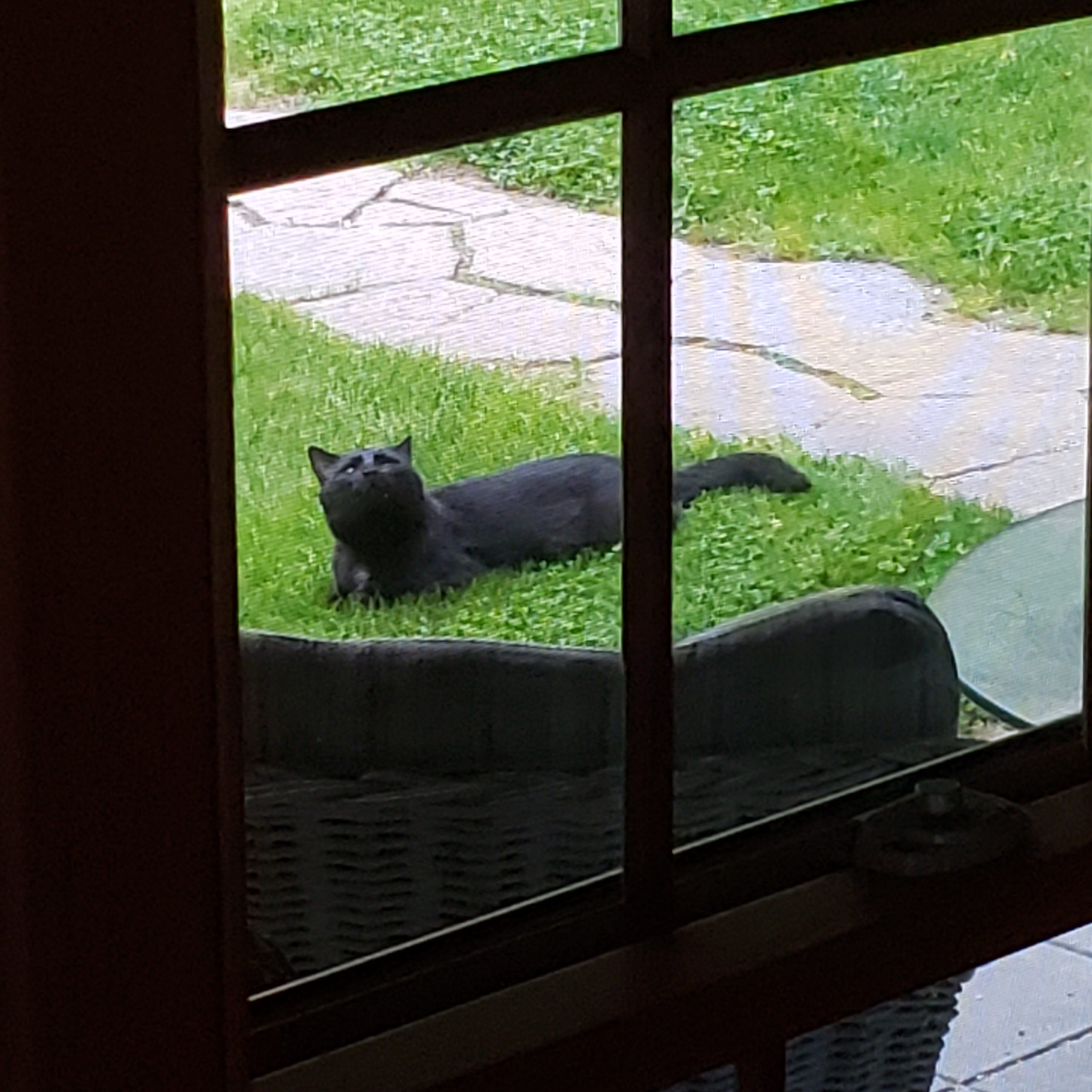 Then I leaned over the railing while still continuing my charade of being so casual. Don’t mind me. Nothing to see here. As I snapped photos and then video. To my surprise, our visitor seemed perfectly content lying in the grass by the back porch. They even gave me sweet kitty blinks. Awwwww.