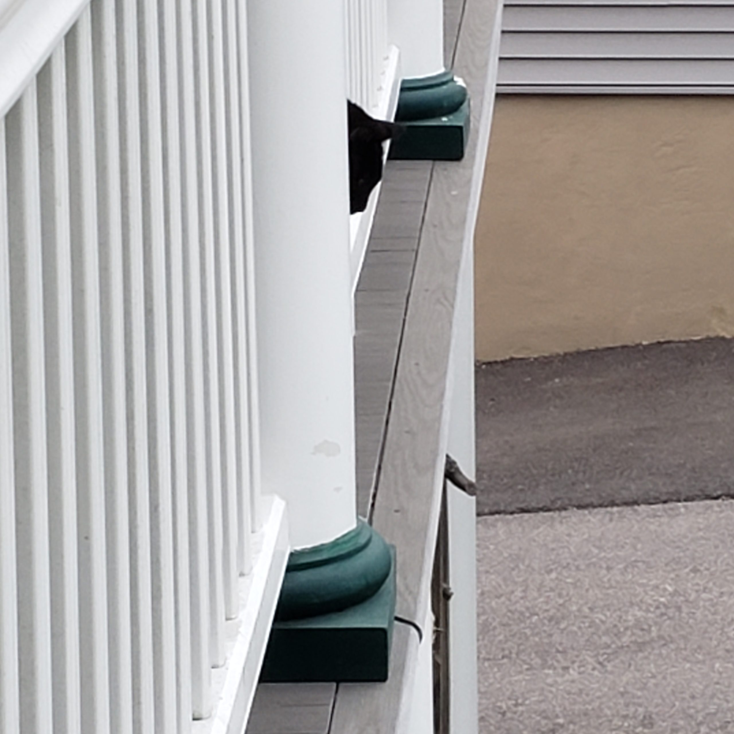 Grabbing the coffee mug in one hand and the camera in the other, I rushed back up the stairs and through the rooms to the balcony. I took a few breaths to calm down before blasting through the door like the Kool-Aid Man. Instead, I did find some composure. I casually talked to Guster. I kept pretended everything was totally normal. His hackles were still on end. I gave him some soft, top of head pets hoping to calm him down.