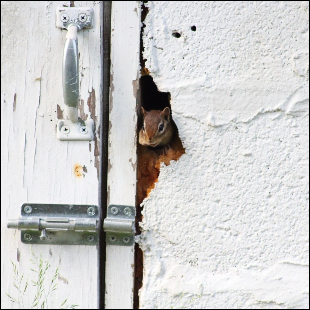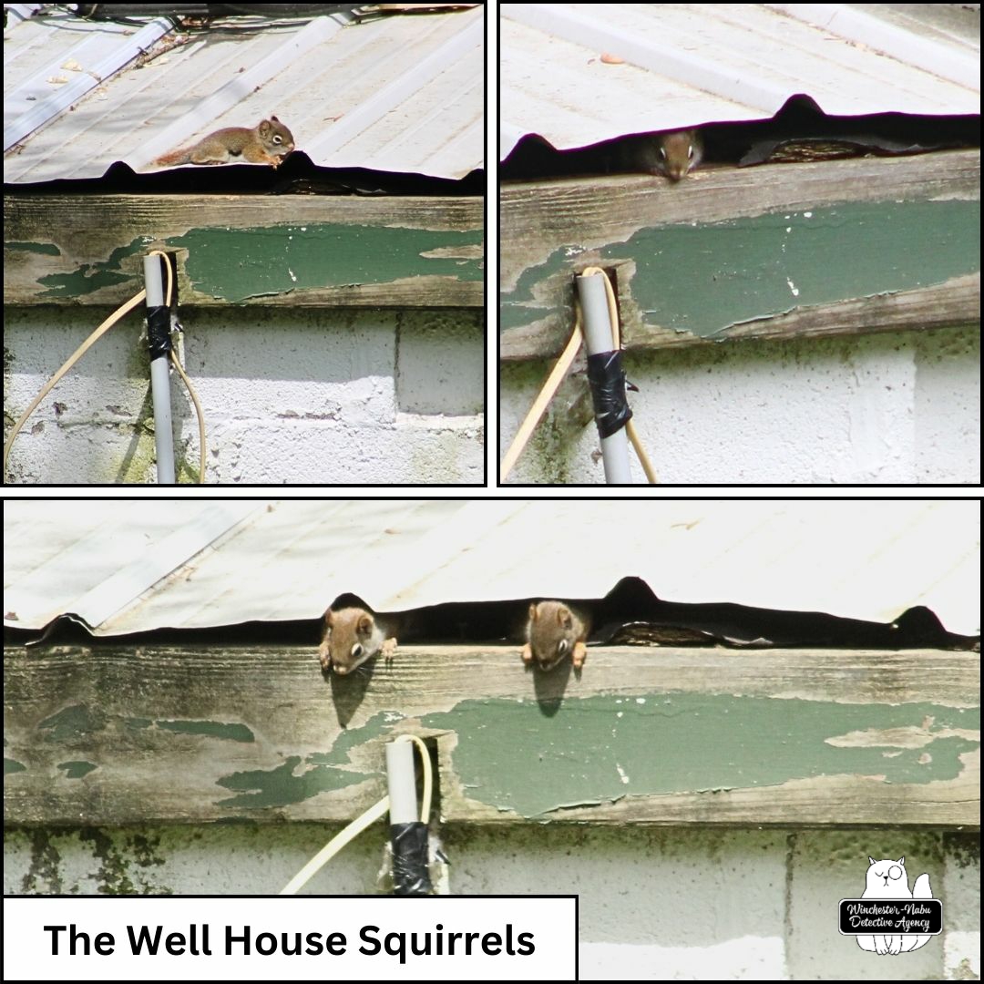 Revisiting this incident is breaking my heart all over again. It’s even worse than the previous case when I discovered the corpse of Benny Squint, one of my favorite chipmunk friends. On May 20, 2024, Gus and I were outside making our rounds to put out seeds, nuts, and fruit at the snack bars for the critters. For weeks, I had been placing a couple of peanuts in the haunted Old Well House at the hole in the door and the gap underneath the corrugated metal roof.
