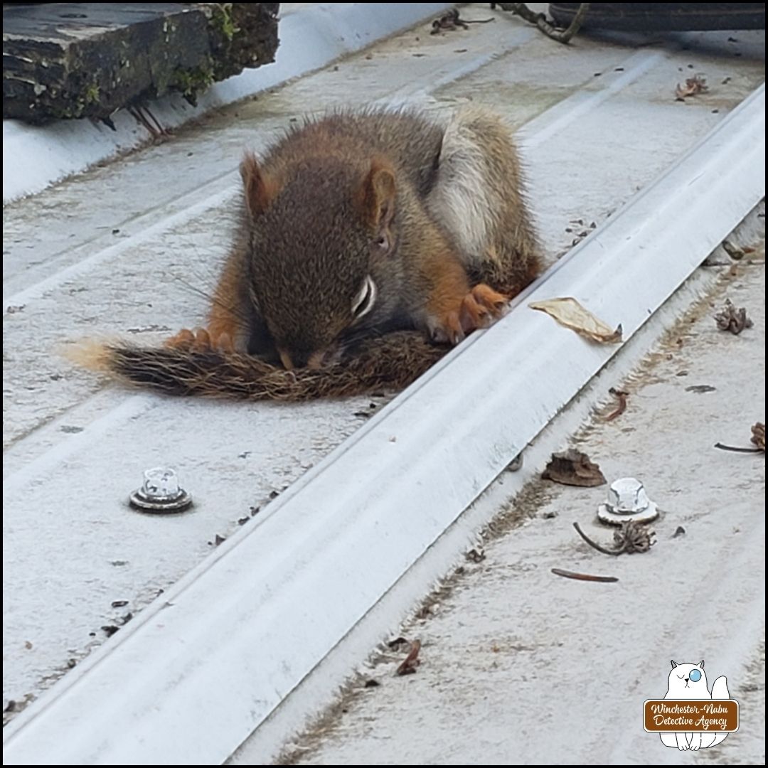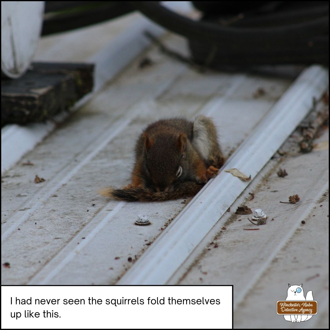 I glanced in that direction and noticed that the perpetual “junk” was still there: a wire brush; some kind of bottle of cleaning solution; a broken bird house; and, an orange extension cord. Something else was there and appeared only as a blob that was out of place. I assumed it was some debris from the trees since the high winds had been making a mess of branches and bark all over. A few steps closer and I thought I might have been seeing one of the red squirrels. It wasn’t unusual for it to be on the roof, but it was strange how it appeared to be lying in a posture that almost resembled a yoga pose. Could that be one of the squirrels, Squirla Moon or Henry Hudsonicus?