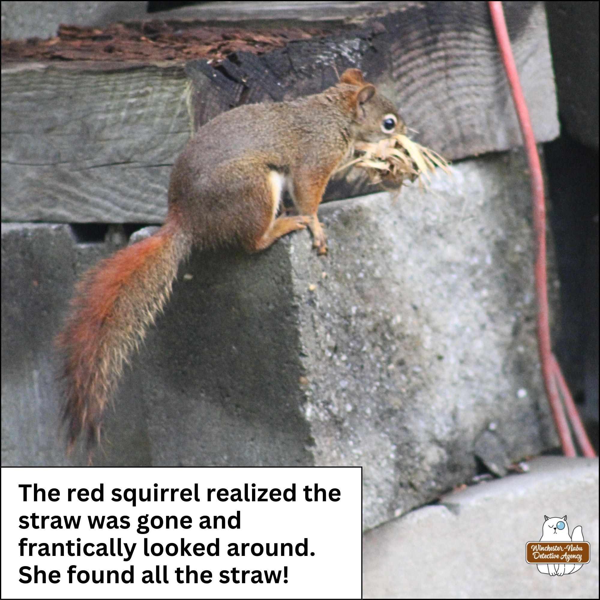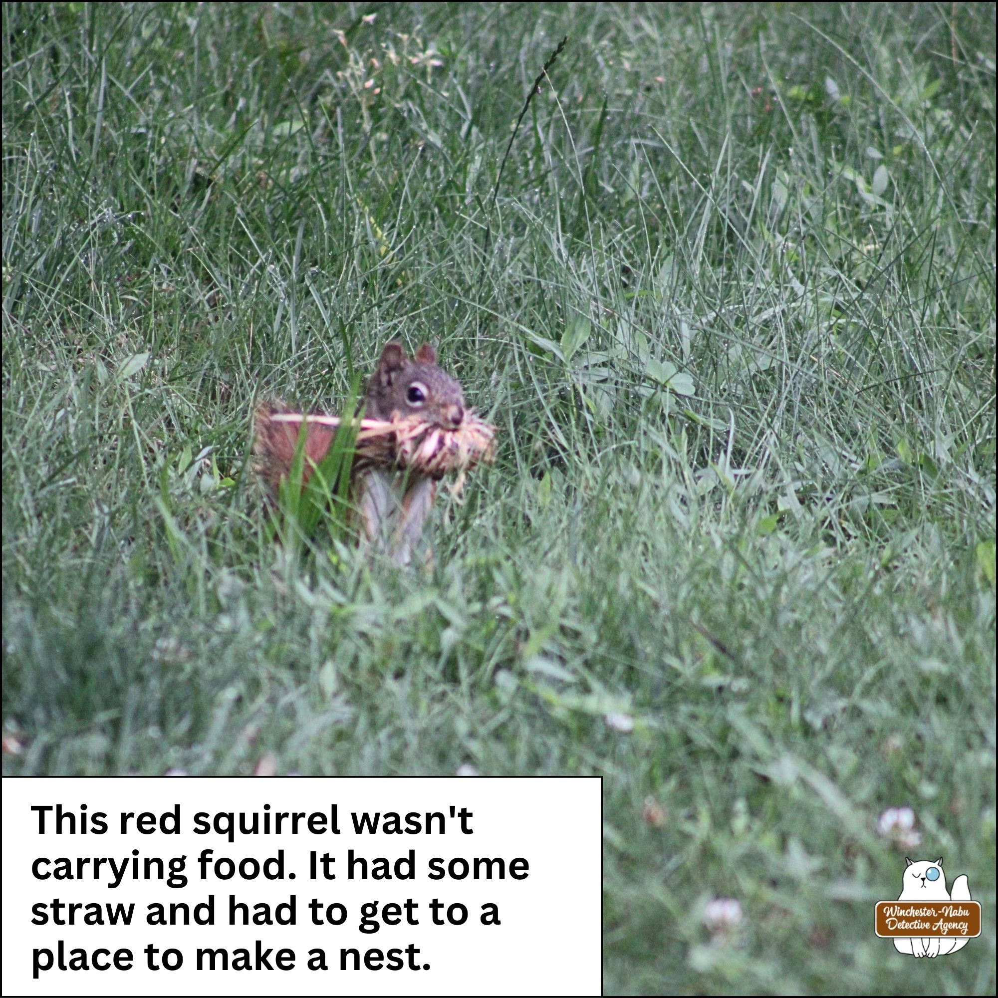 After meeting Tamia Richardson, the little red squirrel on a mission, the Winchester-Nabu Detective Agency accepted her arguments that building a nest inside the hangar would be a better place for her family than risking building it in one of the trees since so many have fallen and others are dying. There are no plans to evict her. We support her efforts if she can cooperatively build shelter for other animals outside. Technically, as long as the Supreme Court of Squirrels doesn’t find any fault in Tamia’s plans, the cats and I will try to keep it a secret from The Grumpy Old Man.