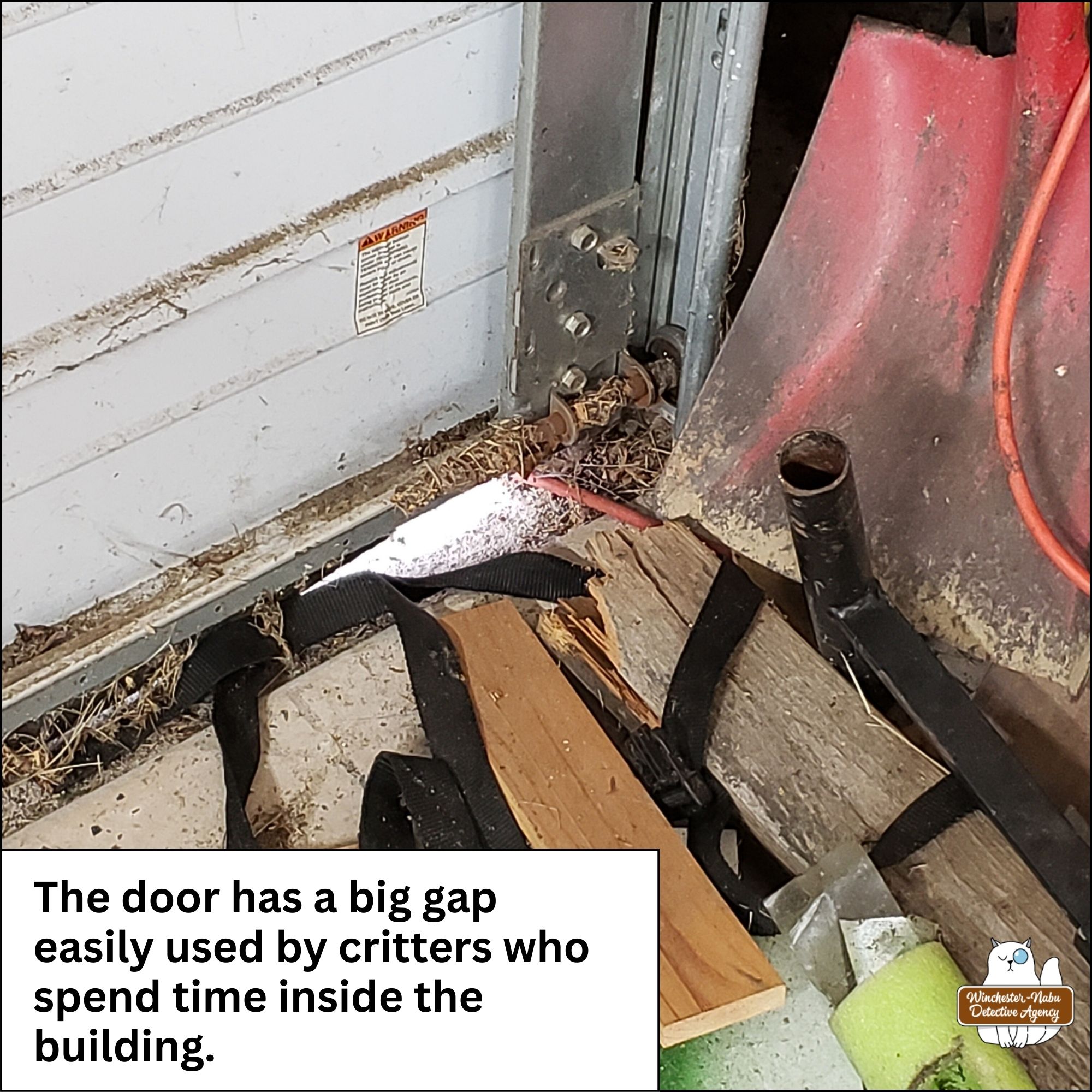 As we walked to the door, I reminded Gus that she was not a suspect and he should approach his inquiry with less hostility. I bent down to unhook his leash from his harness so he could navigate through the hoarding nightmare inside that building. I looked around too, but I could not see nor hear any indication that the little red squirrel was even in there. We always hear scratching and scurrying, but that moment? Nothing.
