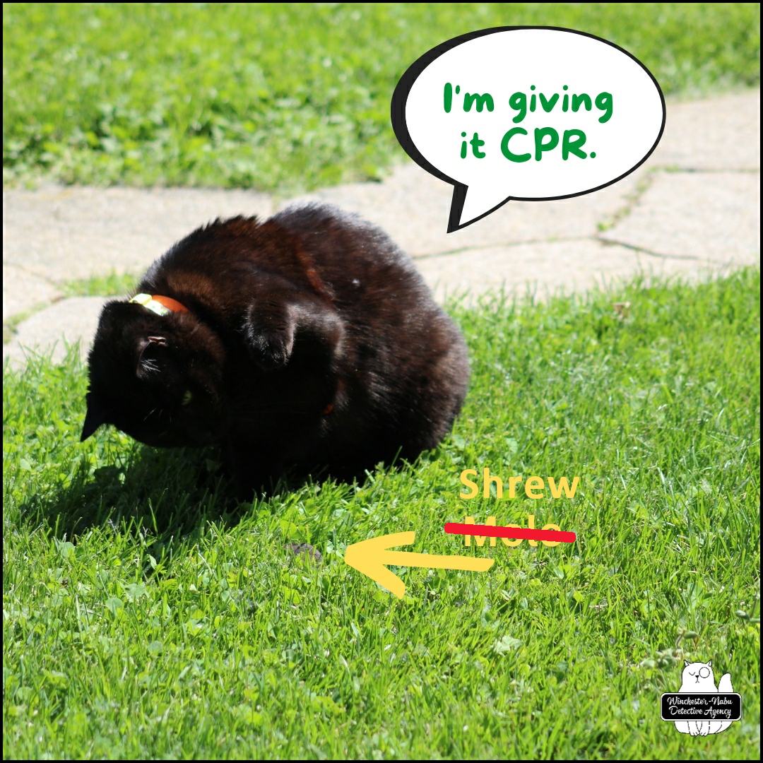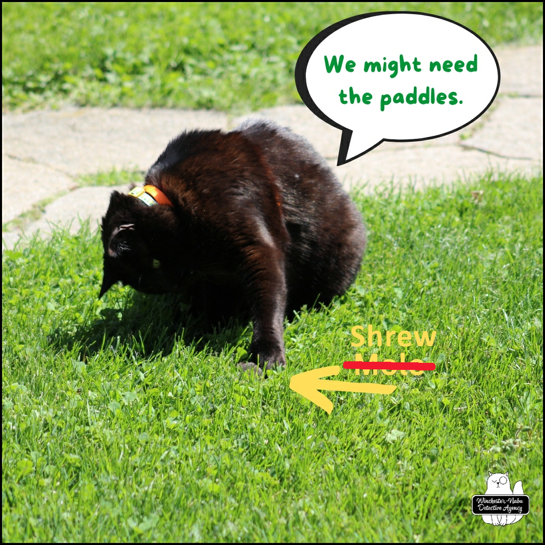 I approached (out of breath) and saw that Gus had his victim close by with his paws and fangs ready. I heard the shrieking shrill and that meant, his victim was likely a shrew, mole, or vole. I haven’t seen a vole in a long time. I think all of them were turned into volepyres and left. In the video, I kept calling the victim a mole, but it was in fact a shrew. No doubts now.
