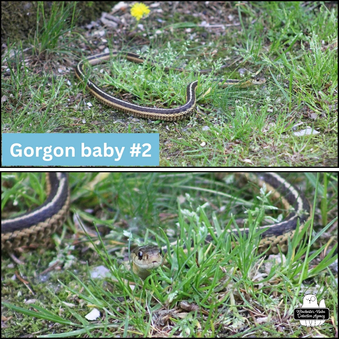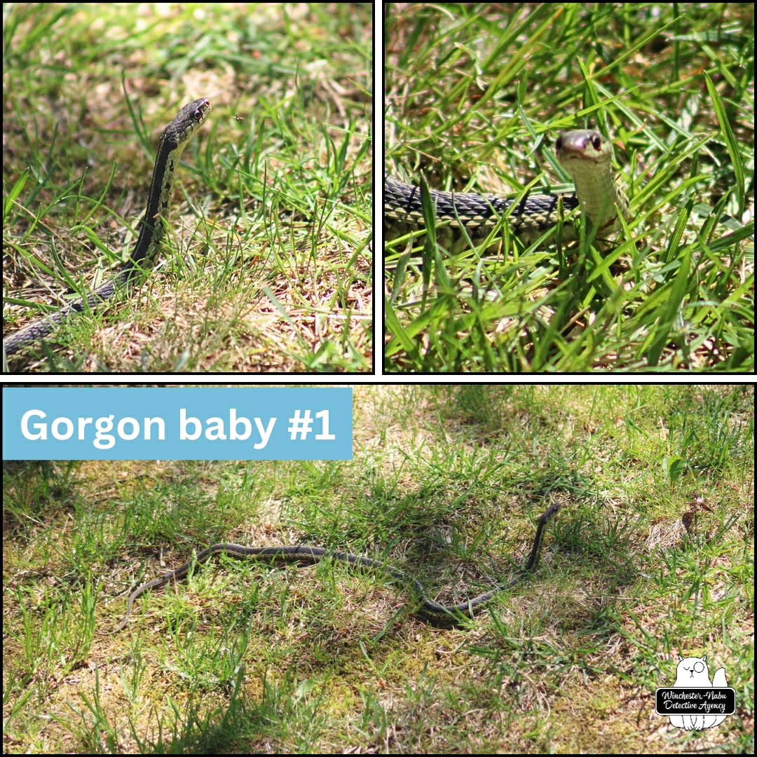 According to my records, there was only one unusual thing that happened on May 7th and it involved Gus. He was sitting quietly while observing the critter activity. When it seems like he isn’t going to get into any trouble, I walk away to distribute the snacks, check the trail cameras, and attempt to take photos. At that specific moment, I was distracted by TWO baby Gorgons approaching the fern garden. I don’t know if they were in a race or intentionally synchronized.