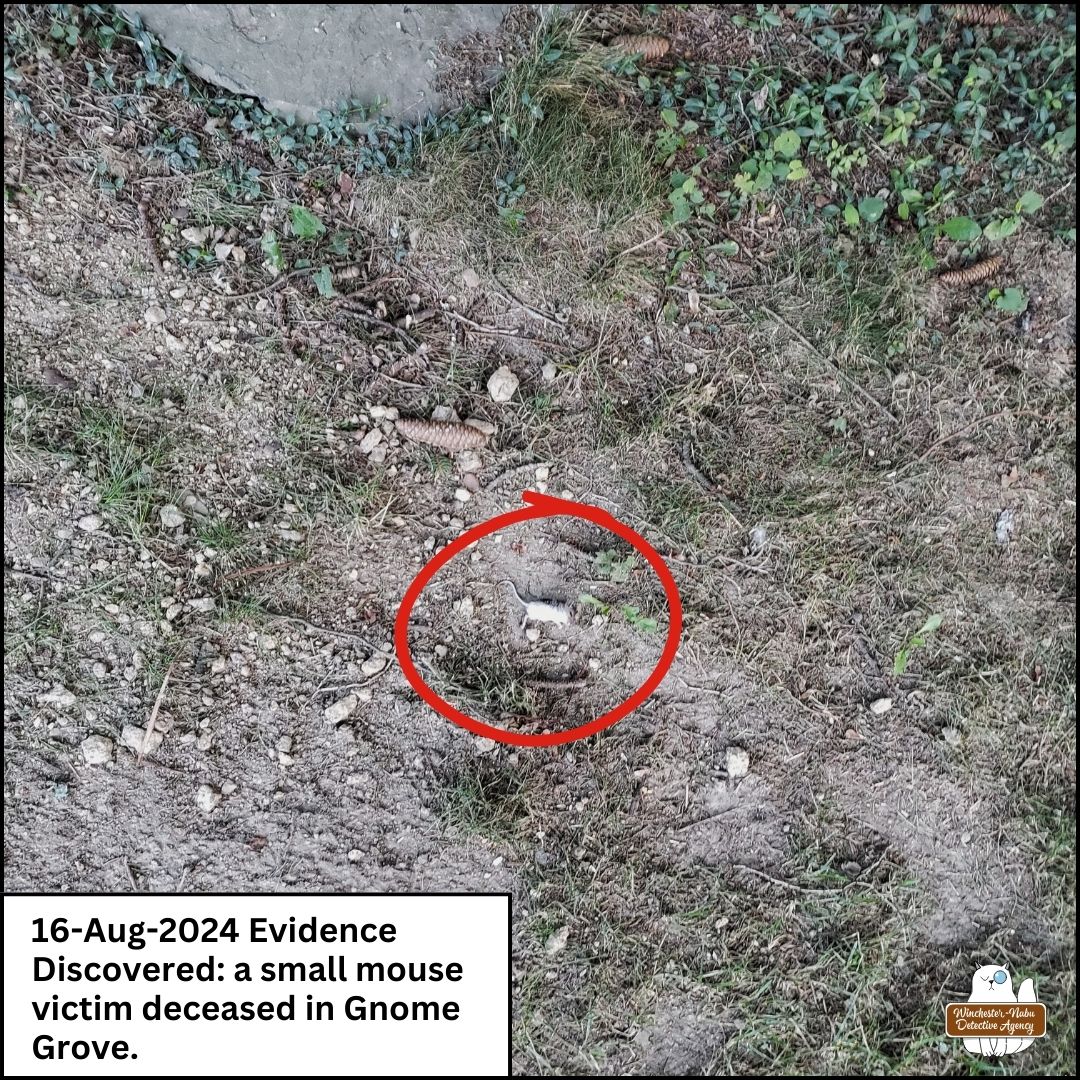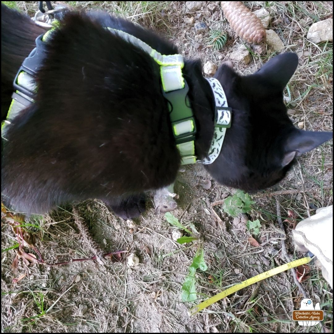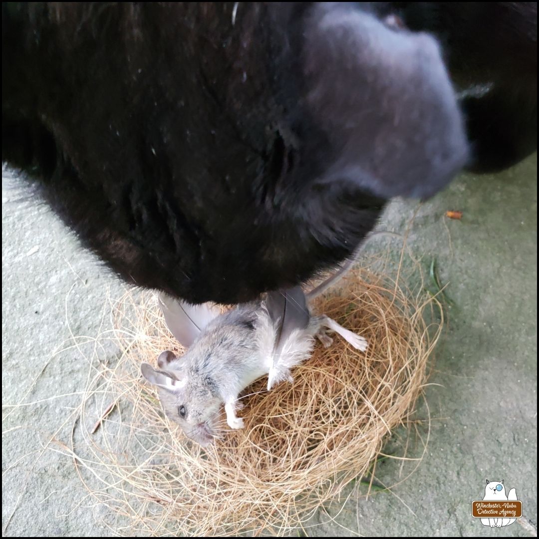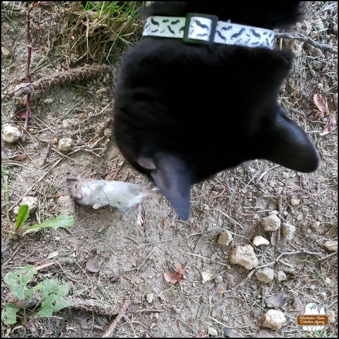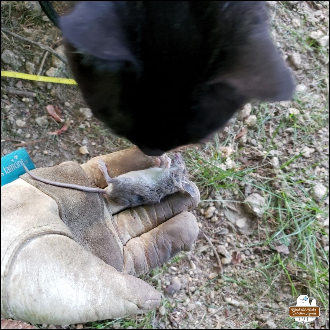 “This one is fresh.” Gus sniffed the dead mouse and picked up the corpse in his mouth. He only moved it a couple feet away. Nonetheless, he had tampered with the crime scene. Fortunately, I had already taken some of the photos required before he did that.