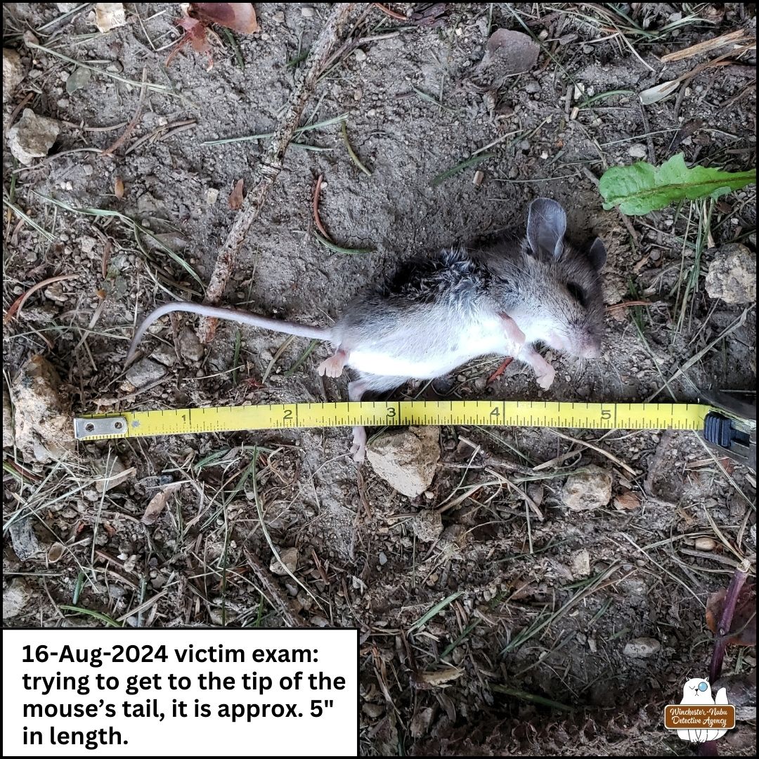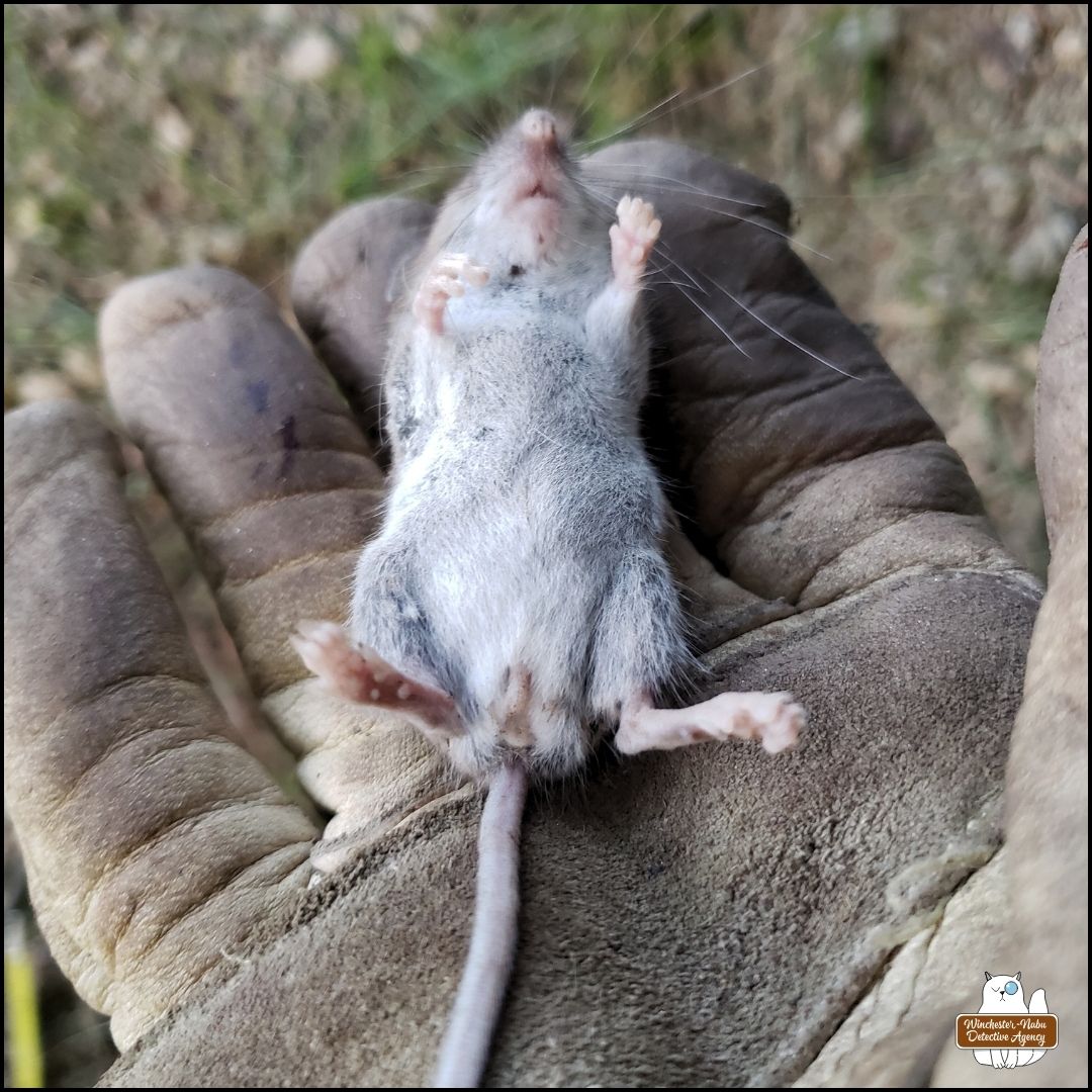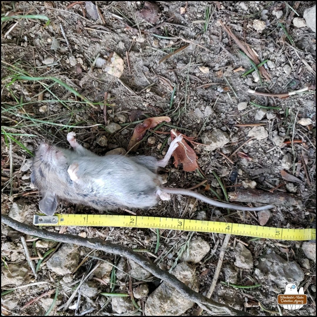 Once we were back in the Winchester-Nabu Detective Agency offices, I uploaded the photos to iNaturalist to confirm whether the species (Genus Peromyscus). I received confirmation that the victim was a North American Deer Mouse.