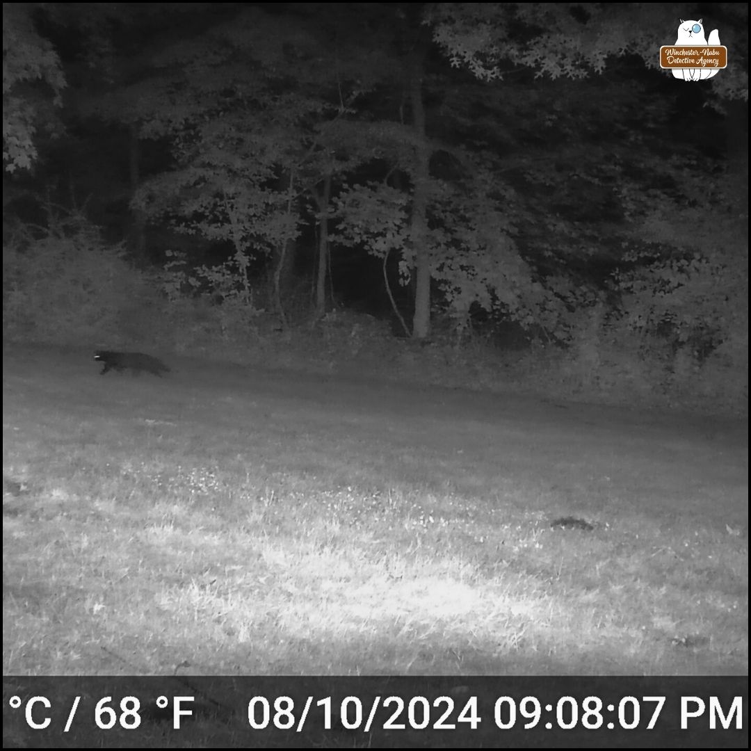 On August 16, 2024, Gus and I went on patrol. I usually start at Oliver’s patio while Gus waits for me on a path (when he’s mischievous he leaves without me). We had a thorough adventure walking around to leave snacks for critters all over. Gus even spent some time inside the hangar, workshop, and loft to look for squatters. That day we were out early enough to do some bat watching too.