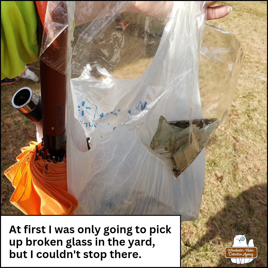 It all began when I realized Gus was fine with multiple humans to watch him which allowed me to pick up glass shards where he spends time—around the Old Haunted Well House. Next to the well house is the remaining foundation from a shed that was there 40 years ago. I’m not sure if it fell down or was torn down. The shed was made out of old windows. That meant there were glass shards still around all these years later. There’s even some roof shingling and a whole bunch of crap from so long ago that The Grumpy Old Man doesn’t even remember what it is—automobile fluid bottles filled with mystery fluids now which are probably toxic. Cleaning up that space will make it safer for Gus and the wildlife (and the humans). It’ll have to be part of a larger project for the future, but on this day, the glass was picked up.