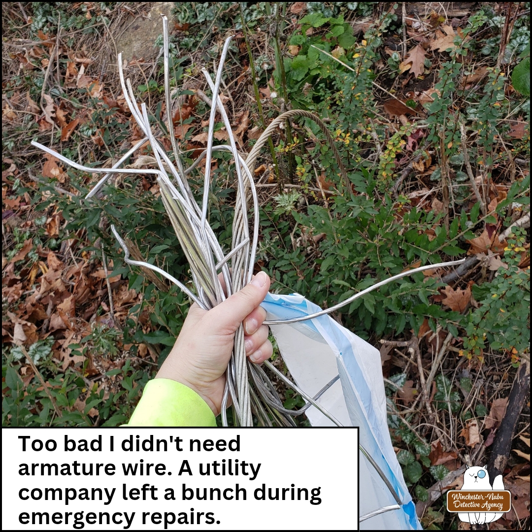 Then I remembered that in one corner of the yard where I noticed a lilac bush come back to life this year after decades of showing no sign of it, there was assorted and mysterious trash. I found a shopping bag in my adventuring bag and headed to that spot. A utility pole is embedded there which explains some of the items like all the snippets of steel wiring. I came across a bunch of Ball mason jars and lids which didn’t seem like something the utility companies would need nor dump.