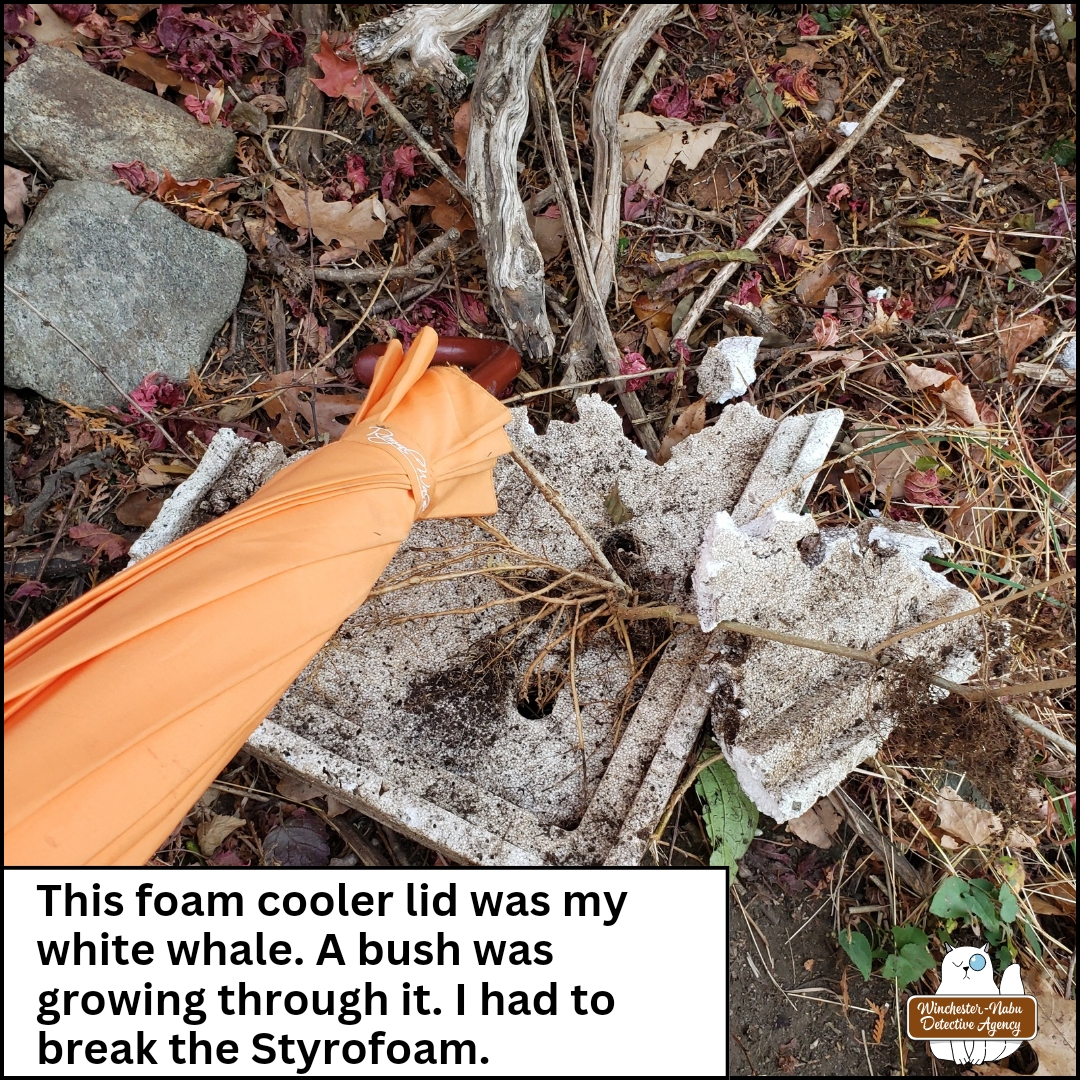 The hardest thing to pick up wasn’t the sharp glass. It was a styrofoam cooler lid. I worked my ass off trying to get that cooler lid unstuck. Eventually I realized it wasn’t merely “stuck” under the thorny wild raspberry bushes with their dagger-like branches. The bushes had impenetrated the lid! I don’t understand why a plant would grow around an object like that. Why would it punch through? There are easier ways to reach sunlight. I am still perplexed. Anyway, I fought with that chunk of styrofoam. I kept sliding down the embankment at the same time. It started to feel like a Herculean task.
