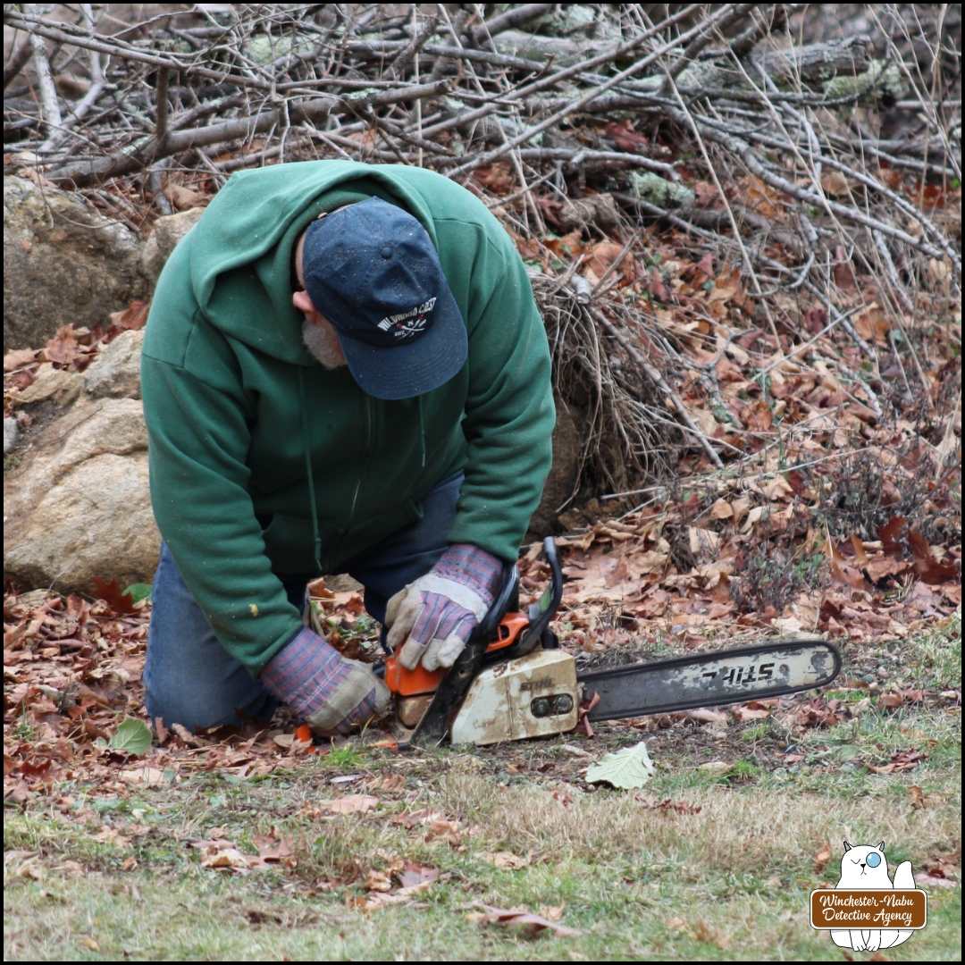 We headed to the workshop instead where it was still freaking cold. The Grumpy Old Man was at his bench sharpening the chain of a chainsaw. He had plans to take down more of the dead trees. It’s a controversial move that did not go unnoticed by the local birds and mammals.
