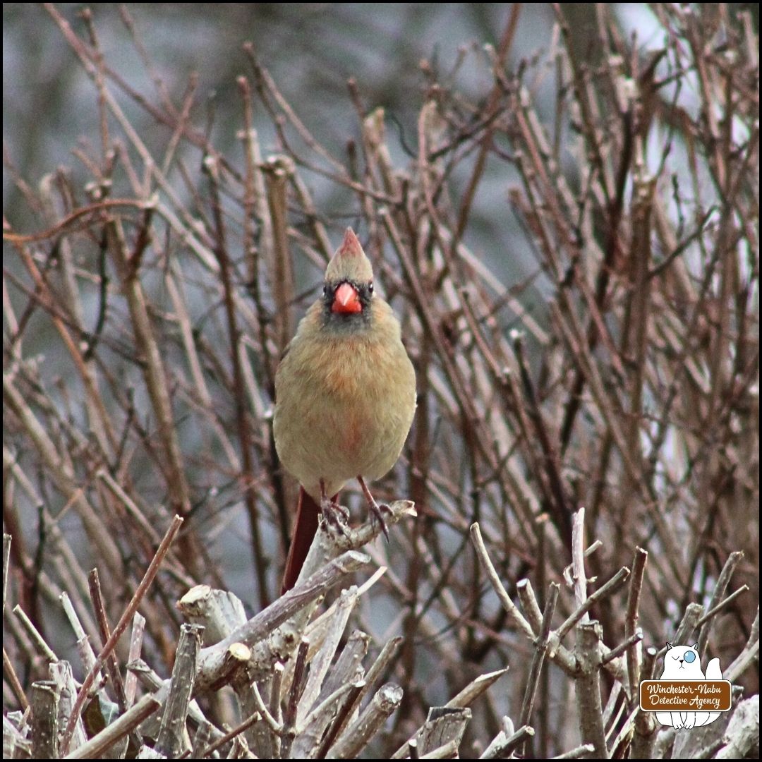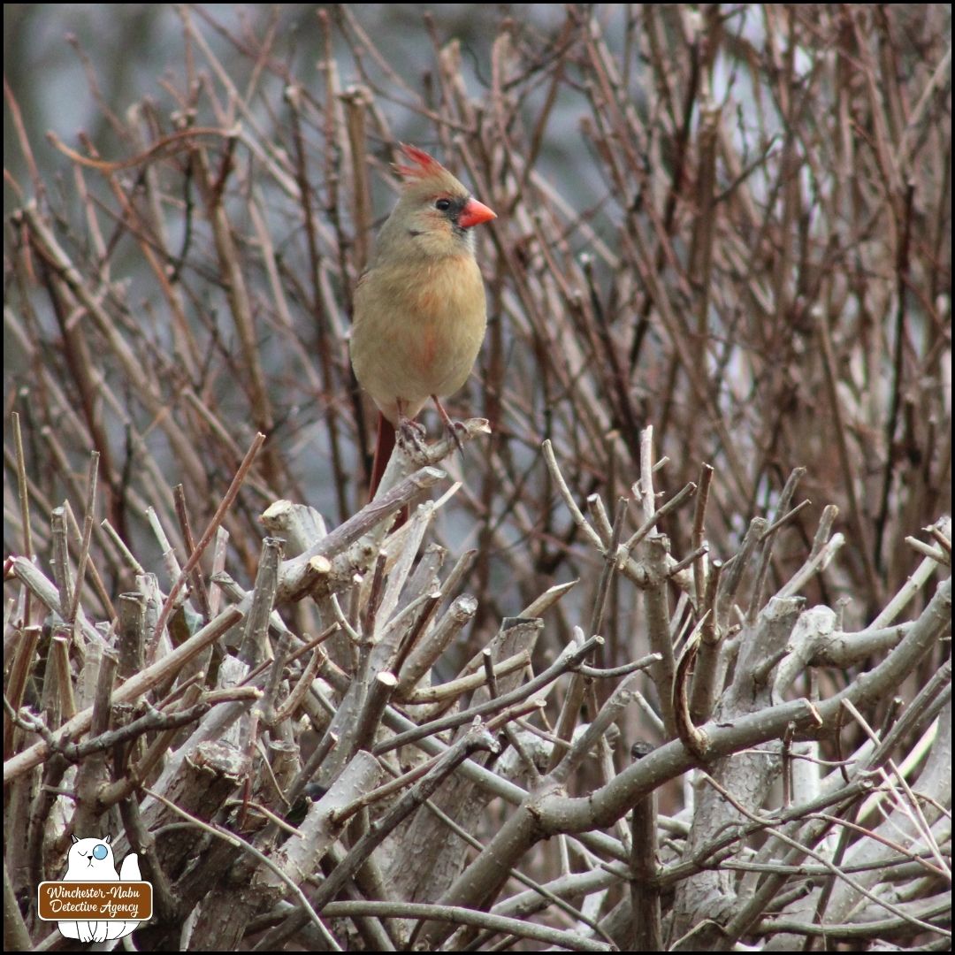 female cardinal perched on a bare bush in winter