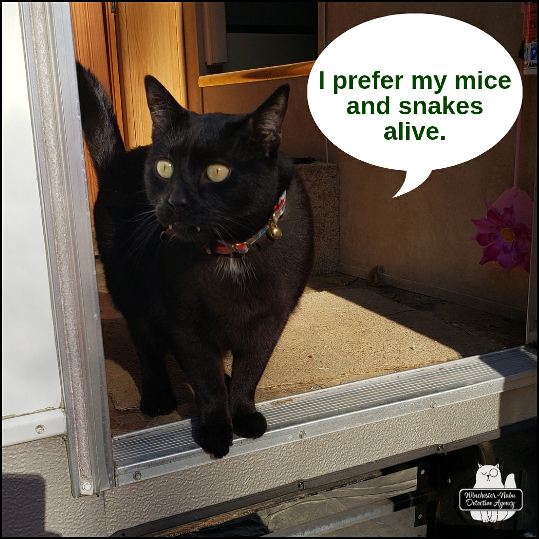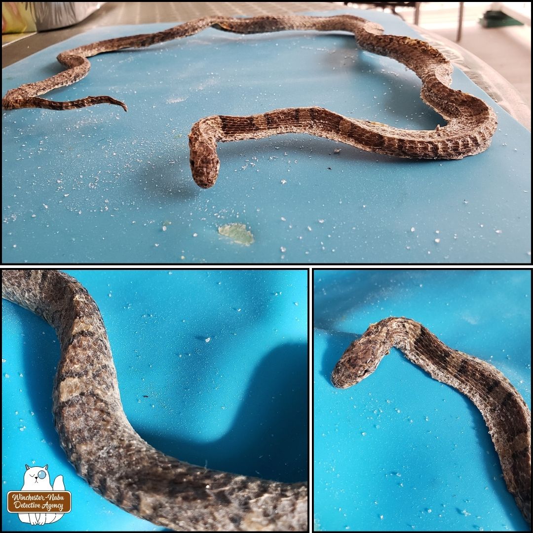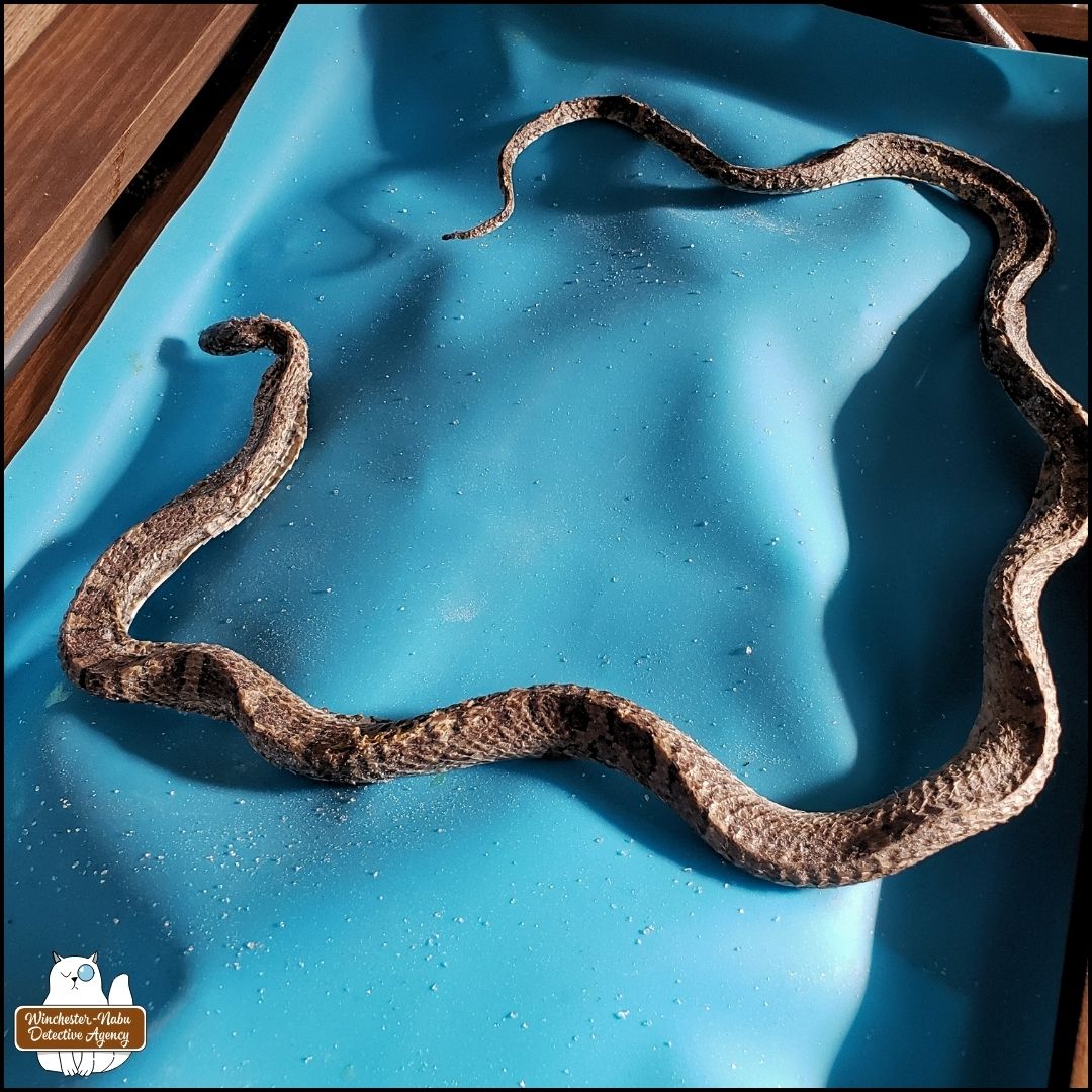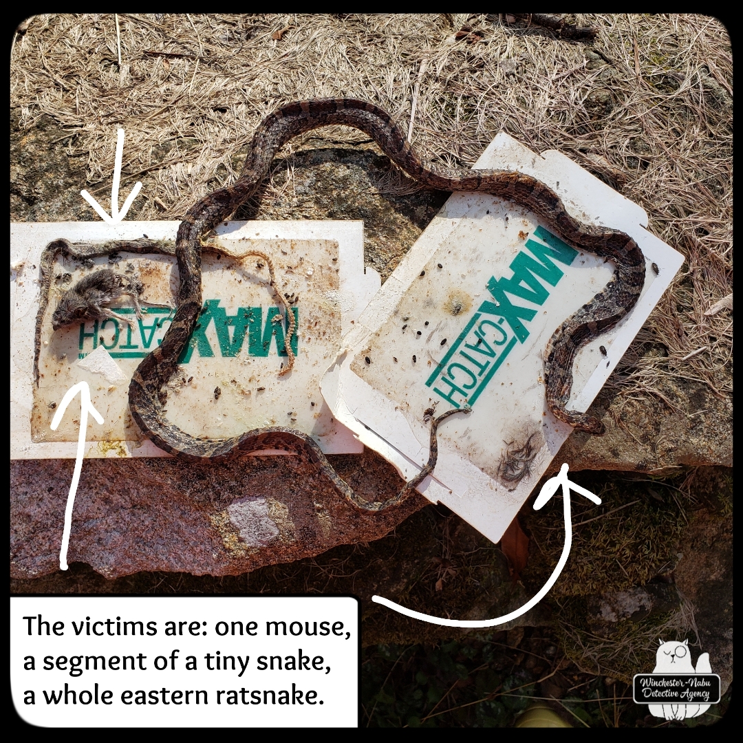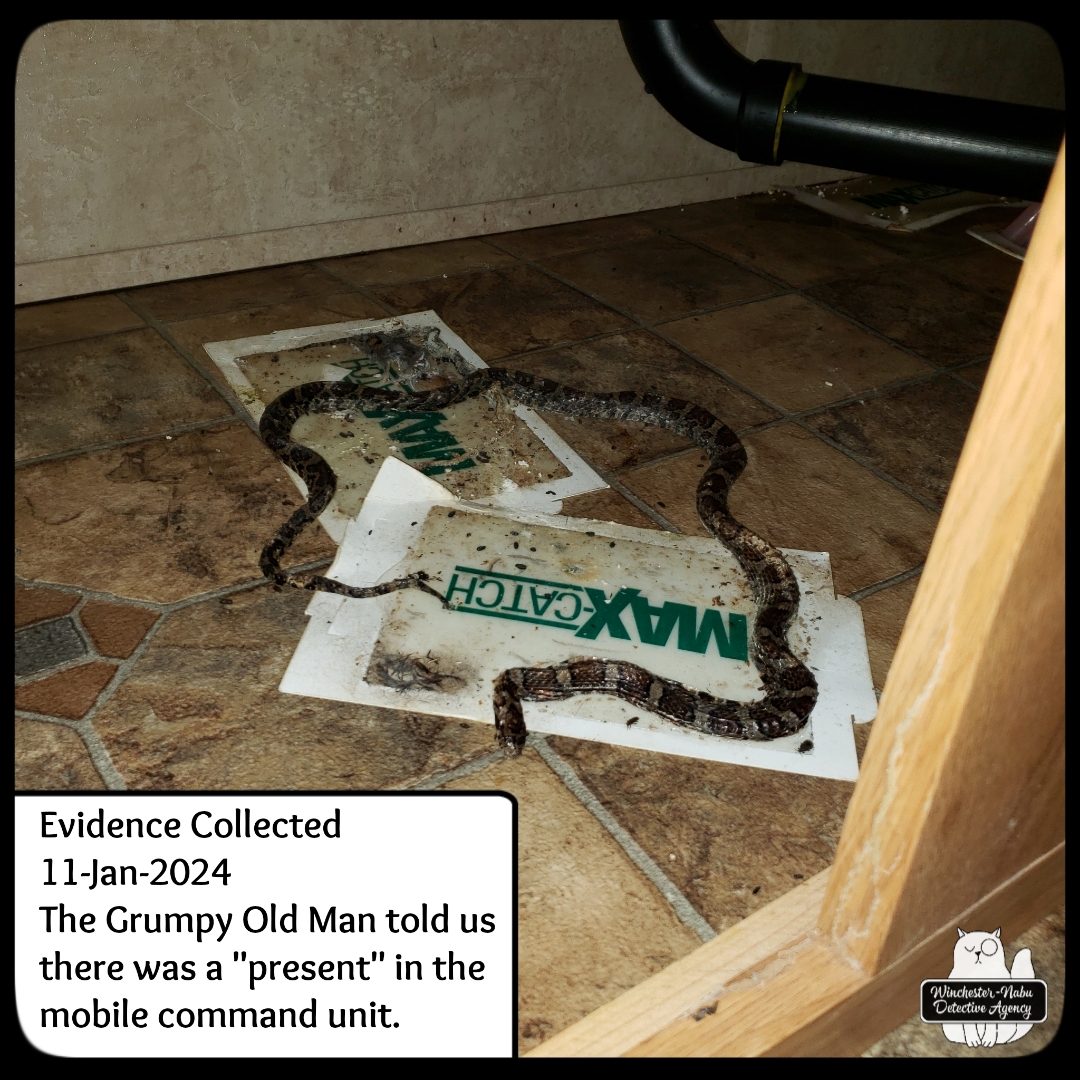 The other things that follow after mice cleverly snuck into the mobile command unit are their predators. One type of predator is the often misunderstood and maligned snake. On January 11, 2024, Gus and I discovered two snakes and one mouse long dead in a (vile) glue trap. Glue traps don’t discriminate—anything moving over it while get caught. Gus could have gotten stuck in one. I’ve discussed how much I hate those traps before so I won’t spend the energy on that again.