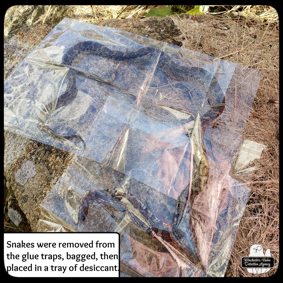 The first issue was to try carefully separating the animals from the glue trap. I was only able to get the largest, one of the snakes, and put it in a plastic bag. When Gus finished his part of the investigation inside the mobile command unit, we went home.