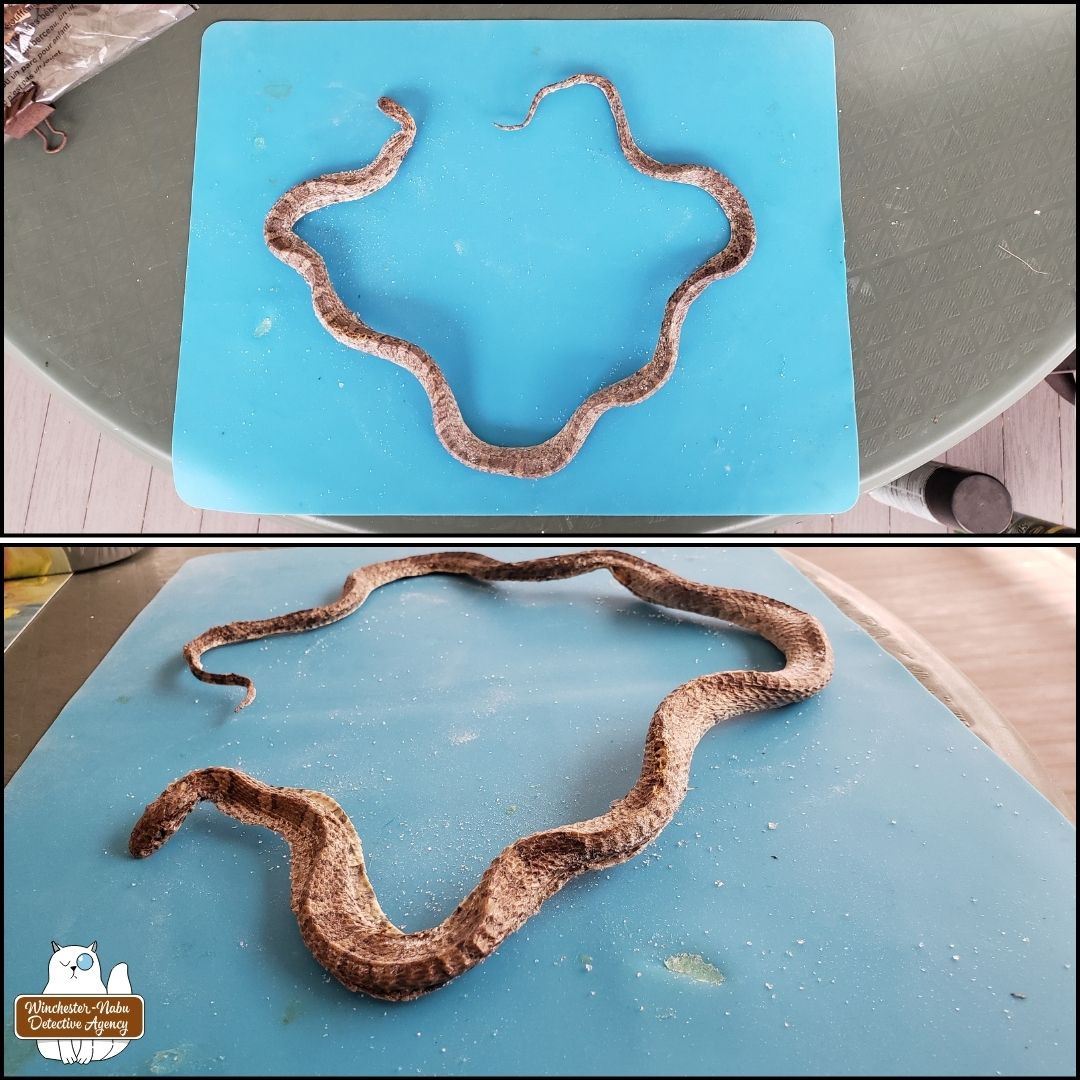 I had a bag of silica sand which I’ve used to try to preserve / dehydrate flowers, leaves, and some other organic material to practice using them in epoxy resin. The silica wasn’t enough to fill the entire foil tray I had and was barely enough to cover the snake.
