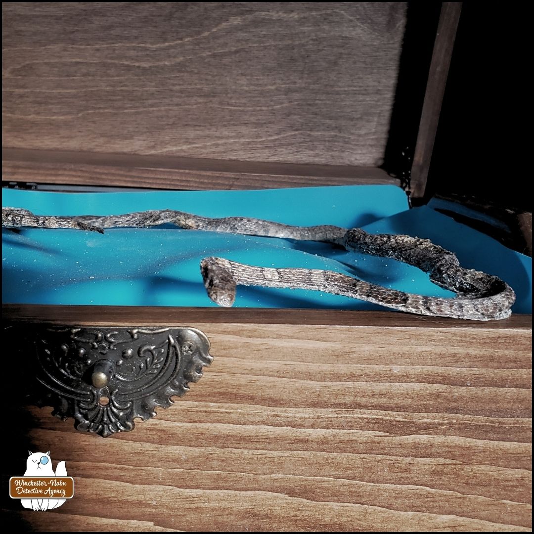 dehydrated garter snake in a circular position, laid on top of a silicone mat inside a wooden chest.