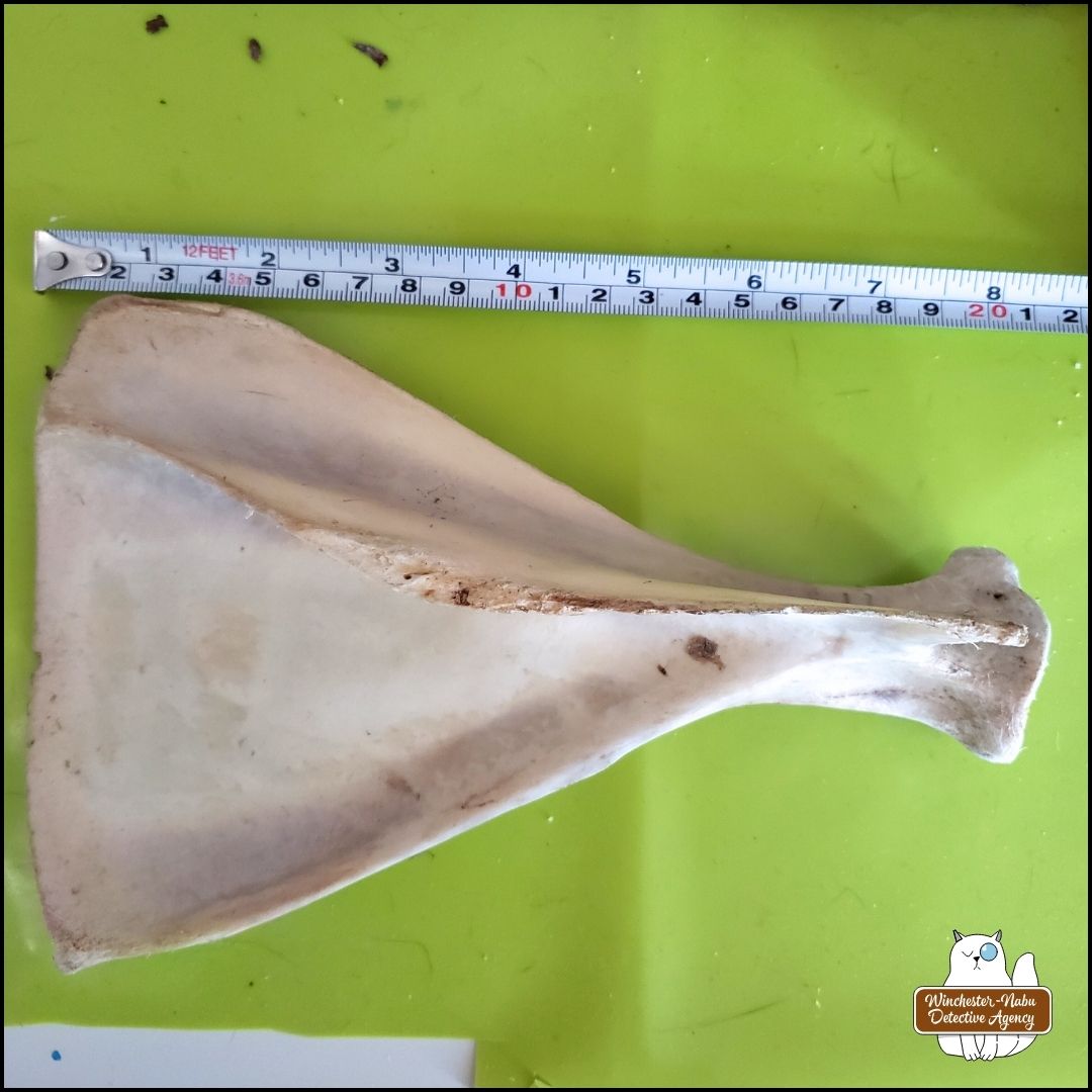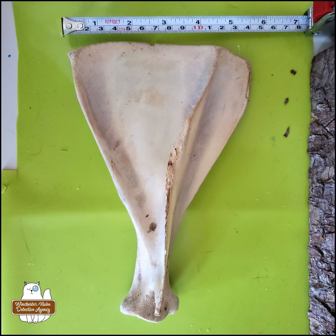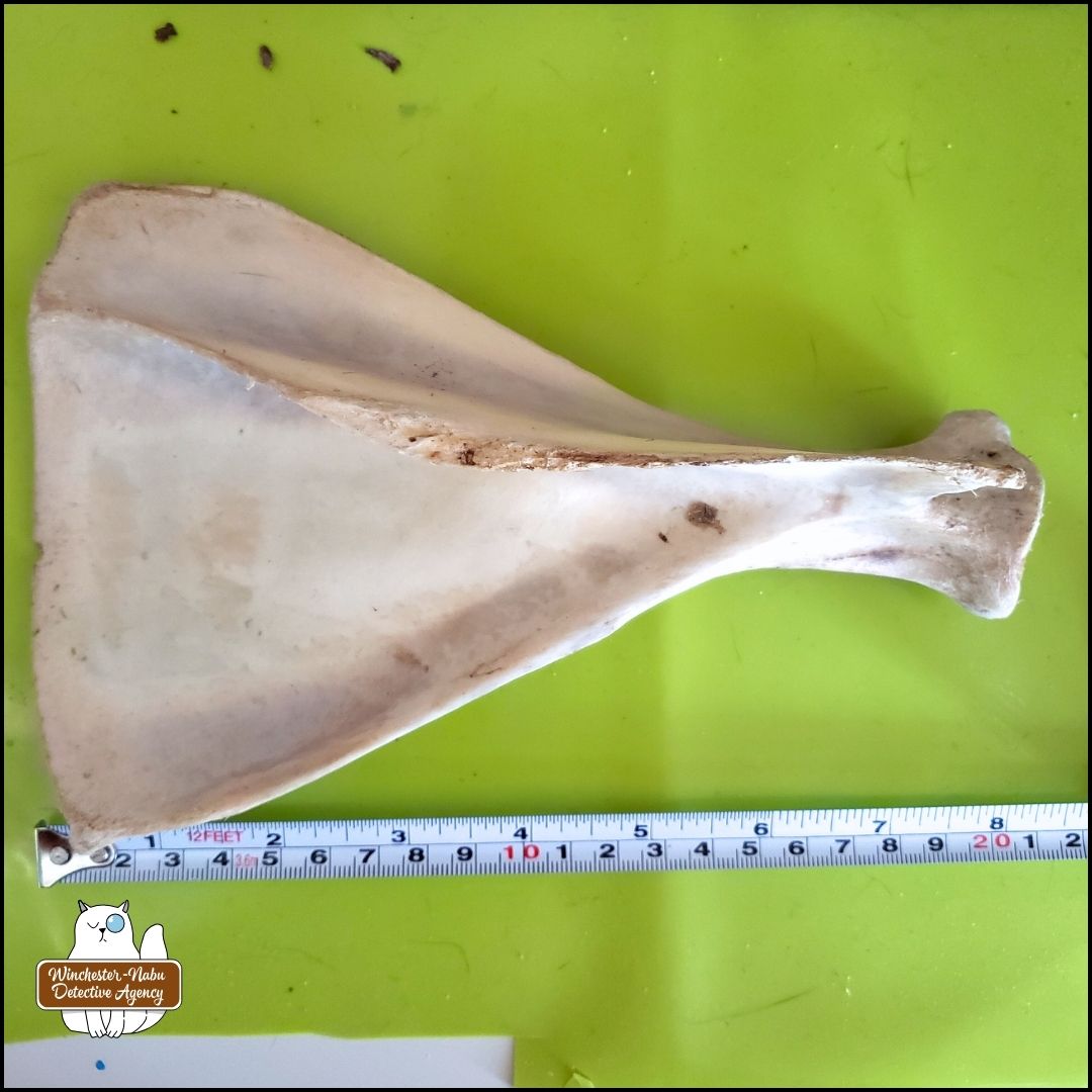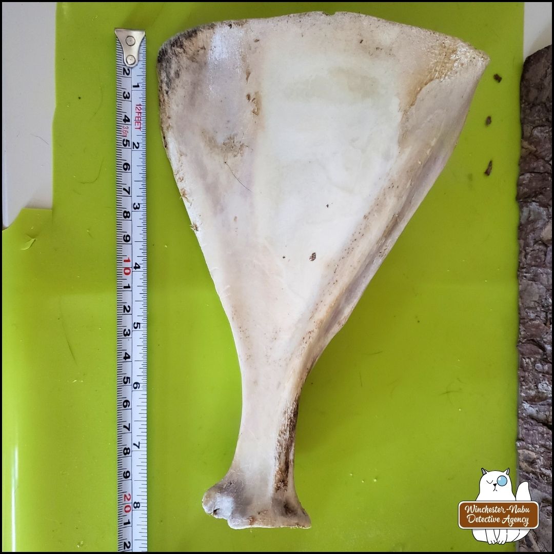 We had no identification of this victim. Our victim was undocumented. This bone is significantly larger than the one on BoneID.net which could mean the victim was a large male buck. I found another resource, BoneIdentification.com which has a specimen that closely resembles ours.