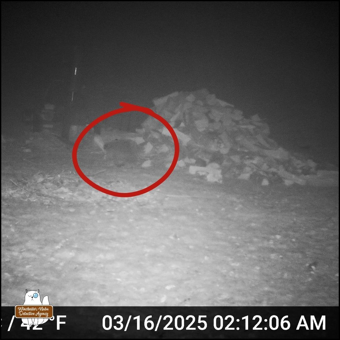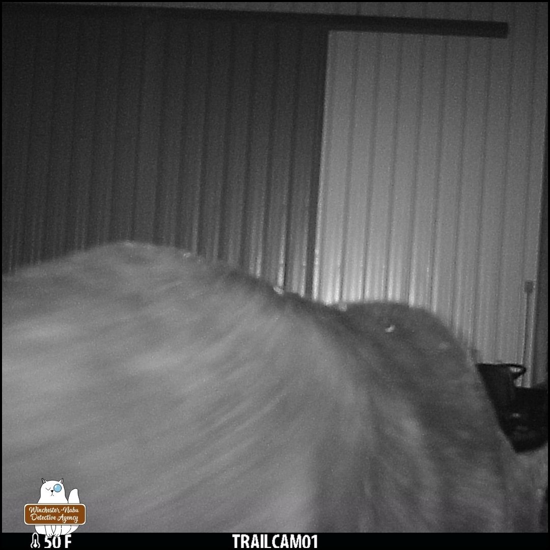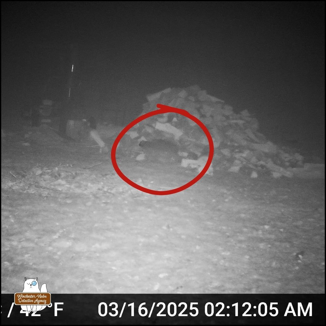 After reviewing more camera footage, it became questionable whether March 28th was the first sighting. There are some new photos retrieved from a different camera. It was a foggy night and that makes it nearly impossible to even see the creature in front of the woodpile.