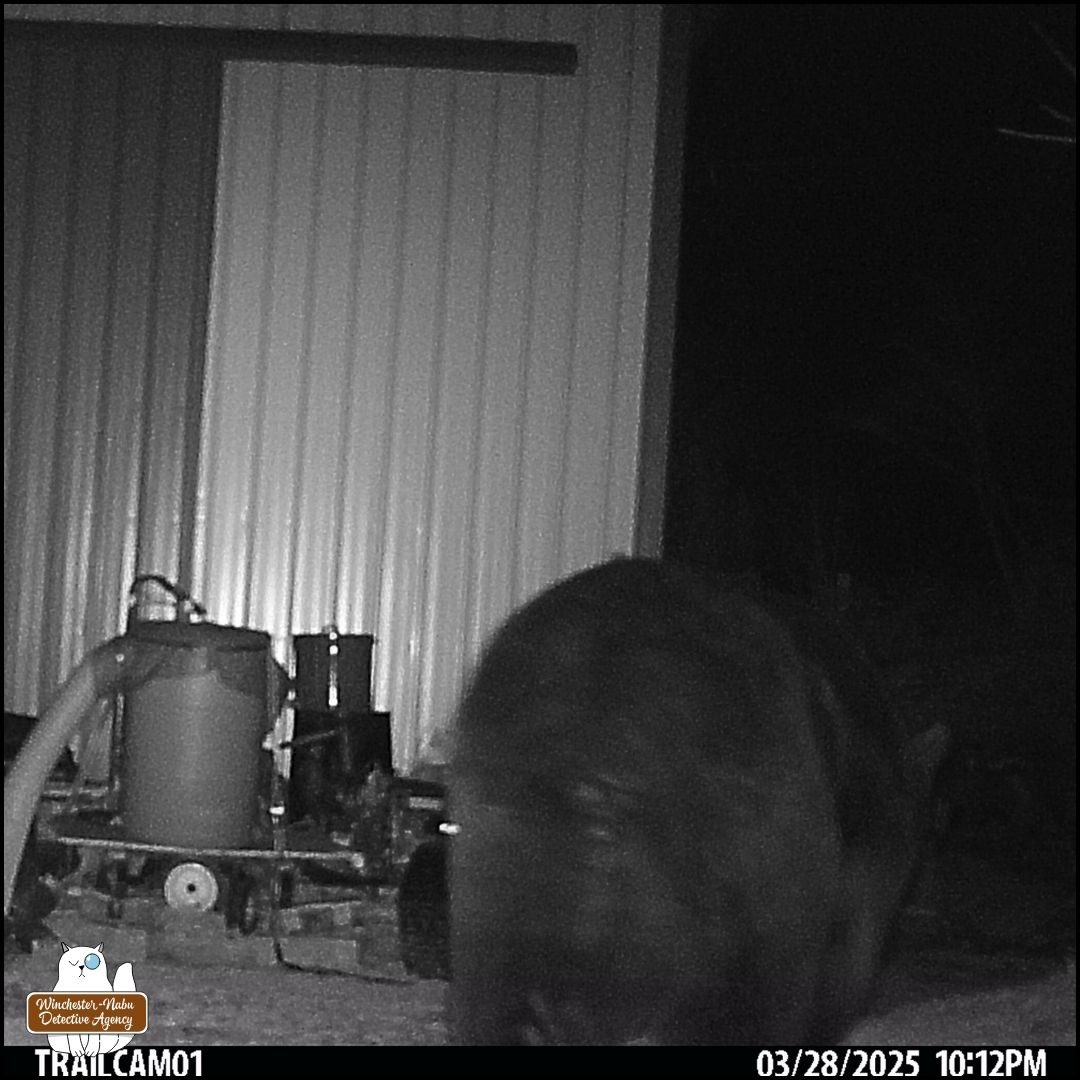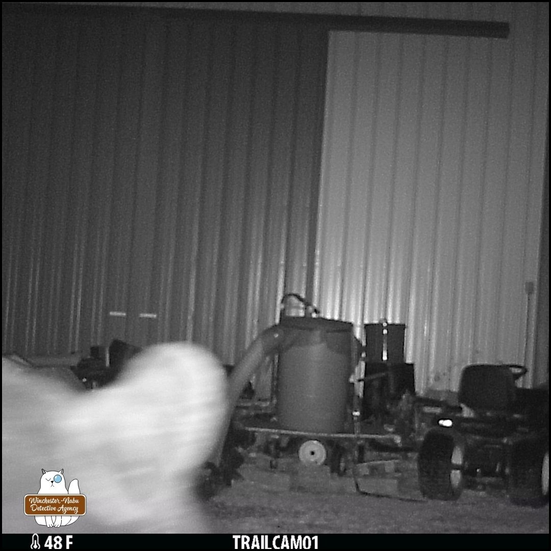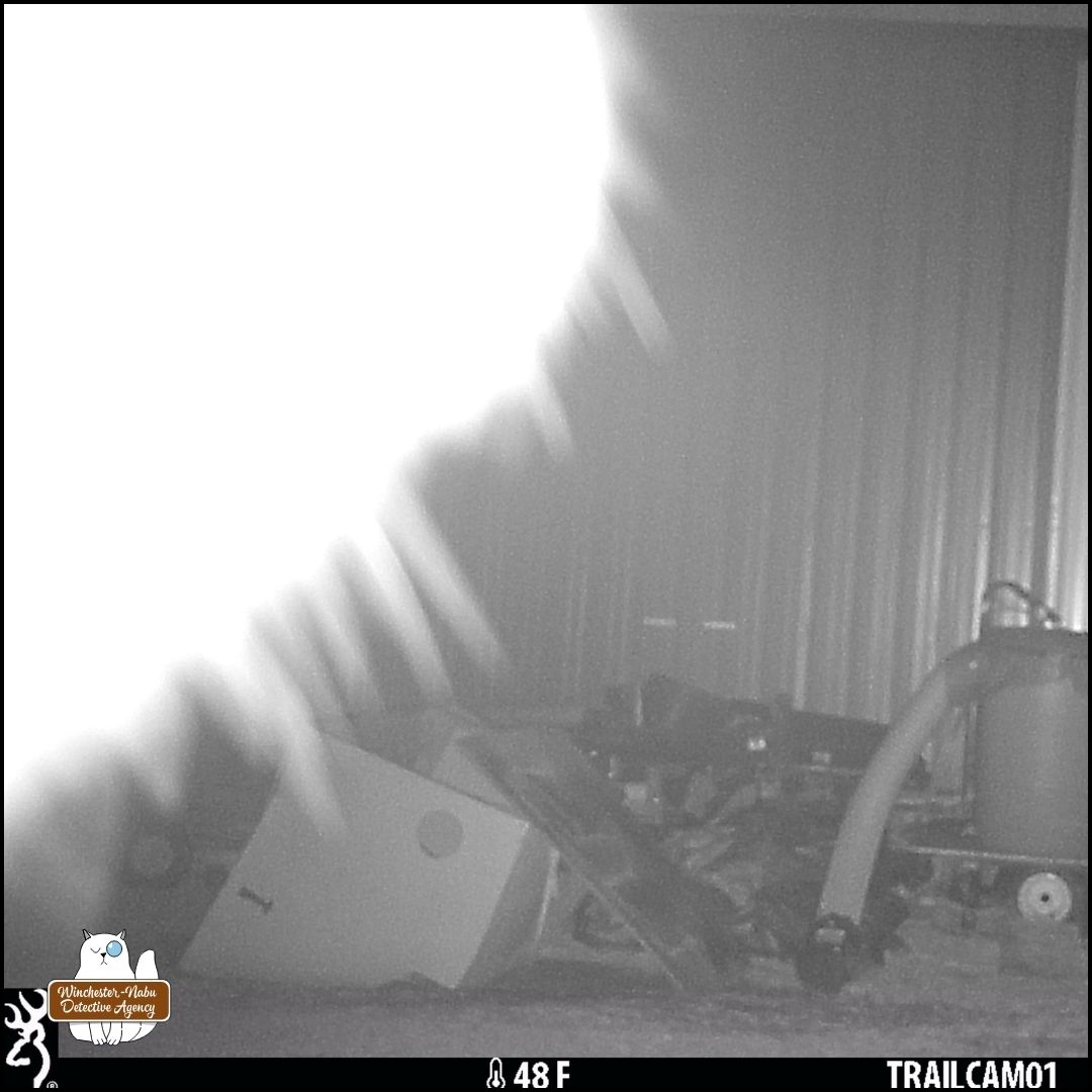 After reviewing more camera footage, it became questionable whether March 28th was the first sighting. There are some new photos retrieved from a different camera. It was a foggy night and that makes it nearly impossible to even see the creature in front of the woodpile.