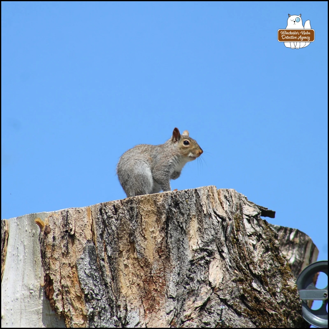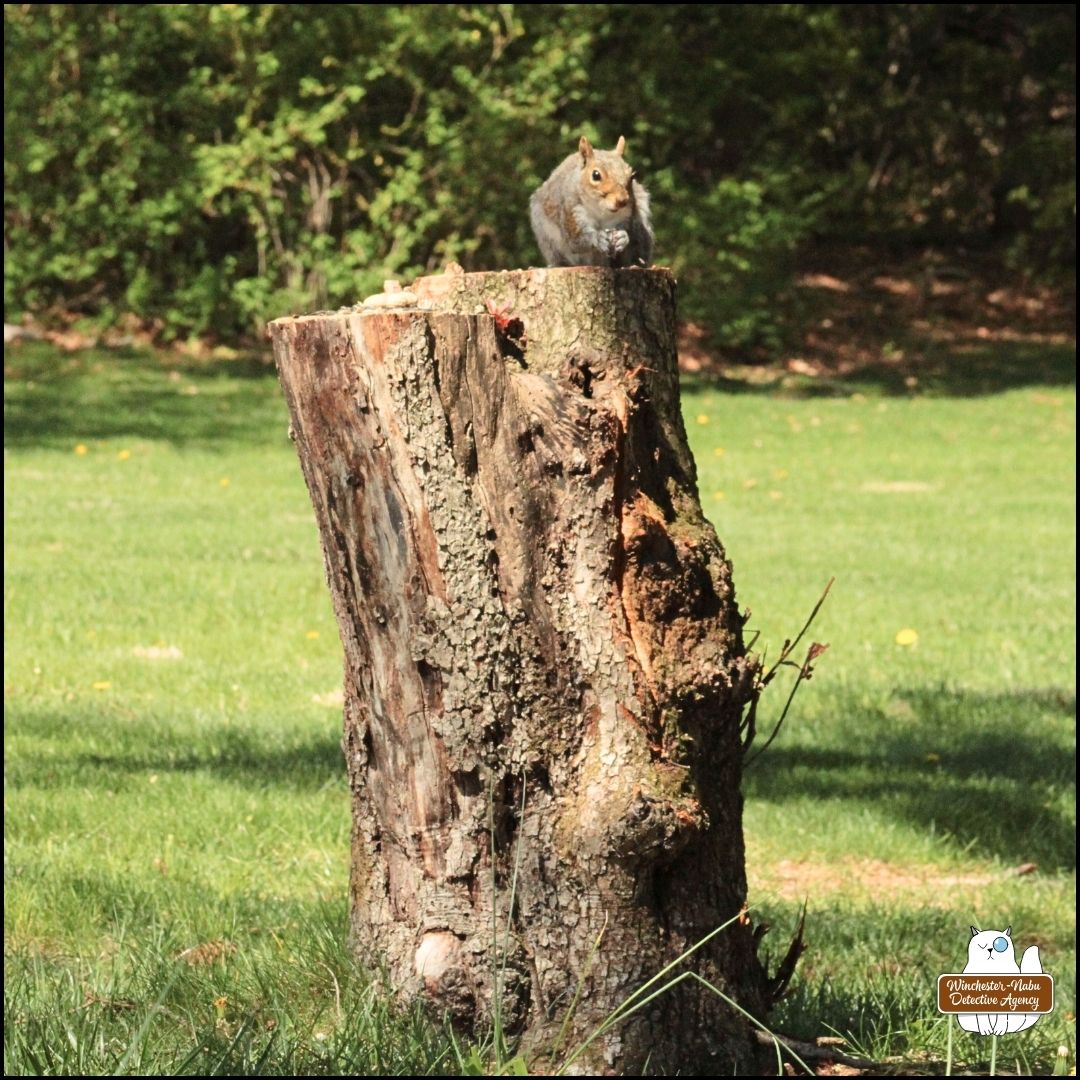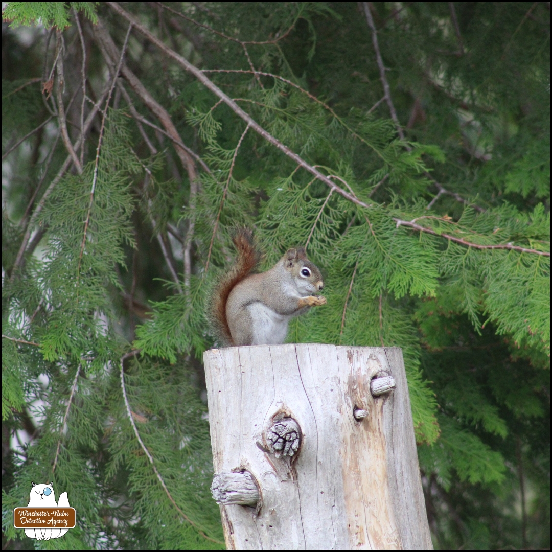 Both the Grey and Red squirrels have their own essential lookout towers as well. They share space on every tree stump: the tallest is the chopped, dead maple that had been a huge part of the landscape; the medium cedar stump where I’ve been giving them snacks for many years; and, the newest, a small tree stump from a dead ornamental tree. What I find curious and fascinating is that Gus has no interest in trying to climb those tree trunks, no even when a ladder was against the tallest one for months.