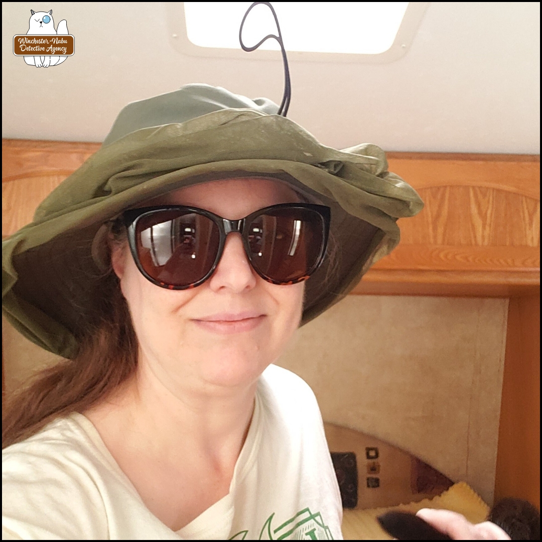 I sifted through the properties of my photos and videos from that day. My last photo of Gus was taken at 10:37 AM on the 29th. We could narrow down our suspect list to anyone who wasn’t caught on CAM3 in that 48-hour period. On April 28th, The Cook did most of the escorting for Guster’s time outside. I was in the shop with The Grumpy Old Man working on my car! I only met up with Gus at the end of his adventure and we spent the whole time inside the desicrated mobile command unit. The Cook and Gus walked the Invisible Wildlife Path on the 28th at 11:28 AM and again at 11:38 AM. Gus stopped only to watch living creatures, but never found the fur on the ground.