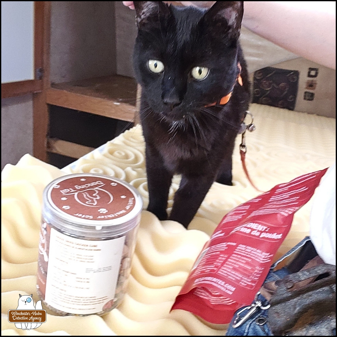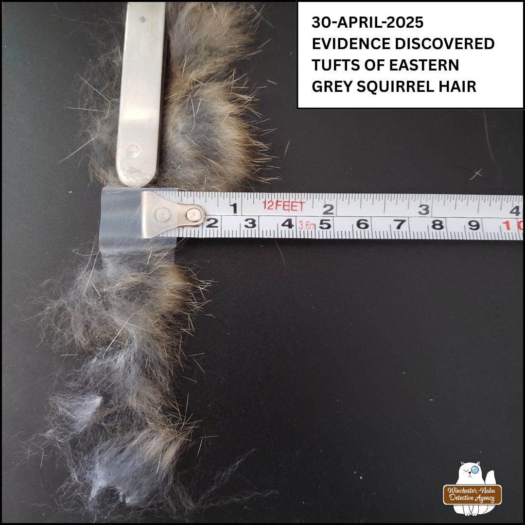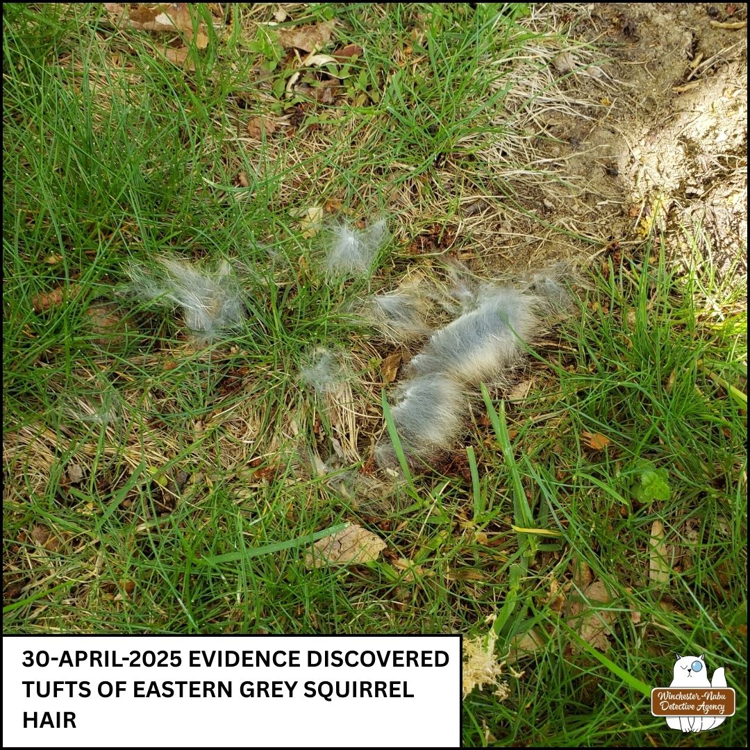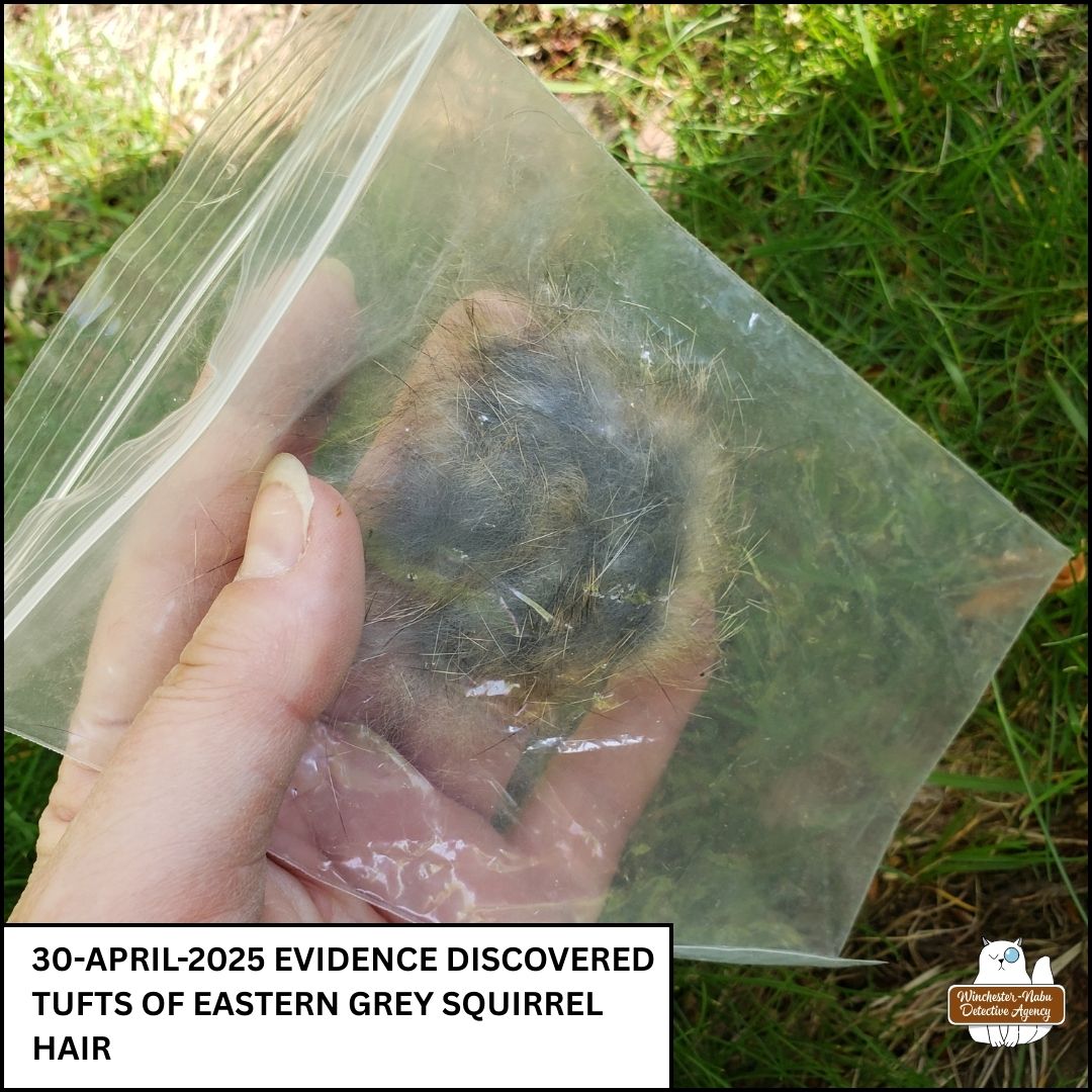 Gus has slowed down with his age, but he keeps a close eye on the critters of all sizes. He absolutely loves the pet door so he can go onto the roof and have Batman Time whenever he wants. That doesn’t stop him from crying to go outside on adventures though. On April 20, 2025, Gus and I made an alarming discovery on the “invisible” wildlife path that runs along the northern border of the Forbidden Forest. Gus began questioning the blue jays, chipmunks, and squirrels to see if anyone had relevant information about what was clearly a small mammal murder.