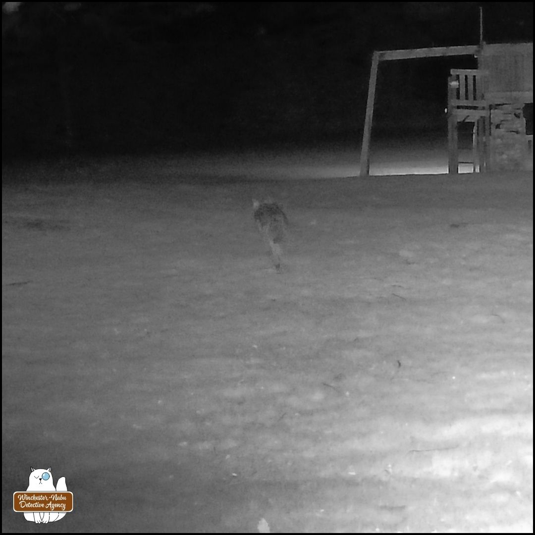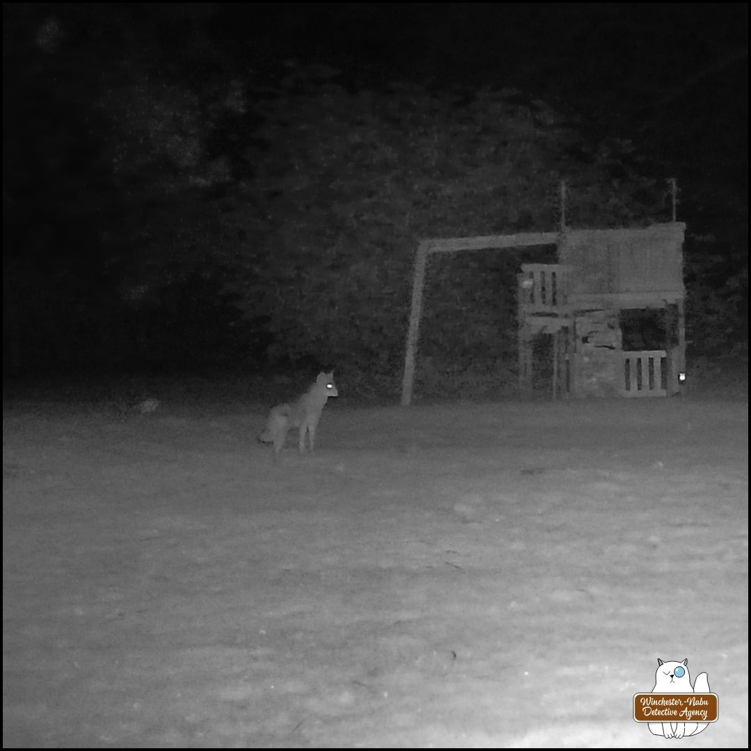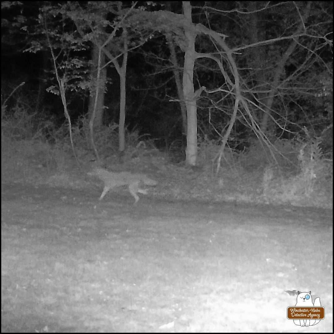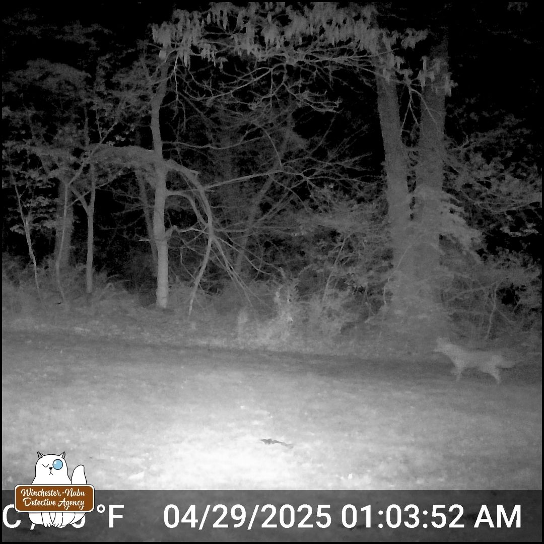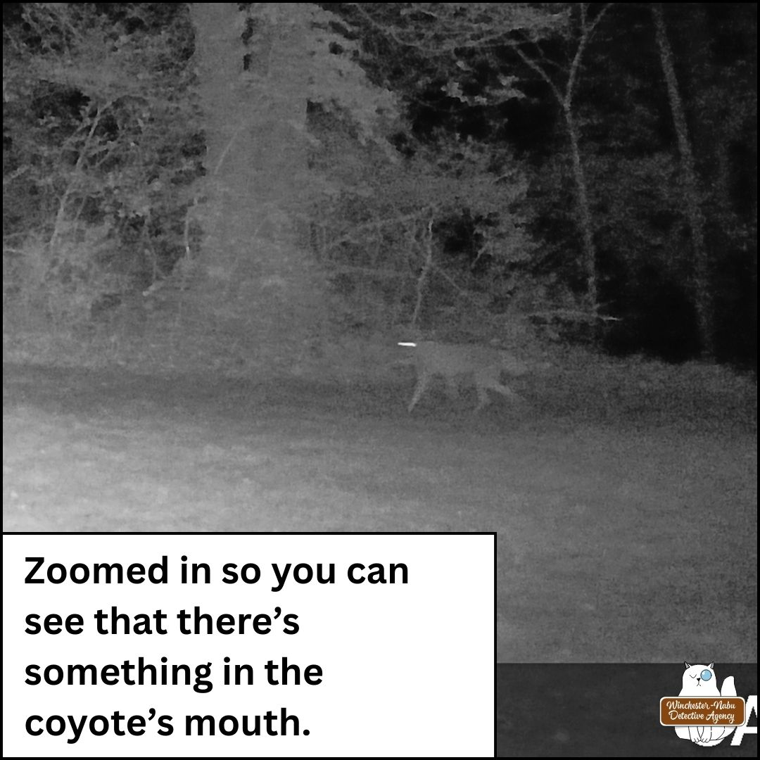 After finding the crime scene, Oliver and Gus worked with their human biographer to narrow down the window of time (opportunity). Then the surveillance footage helped elimate suspects who would prey on the victim species (eastern grey squirrel). This eliminated everyone except the coyote who could be seen with something in its mouth at 1:10 AM on April 29, 2025.