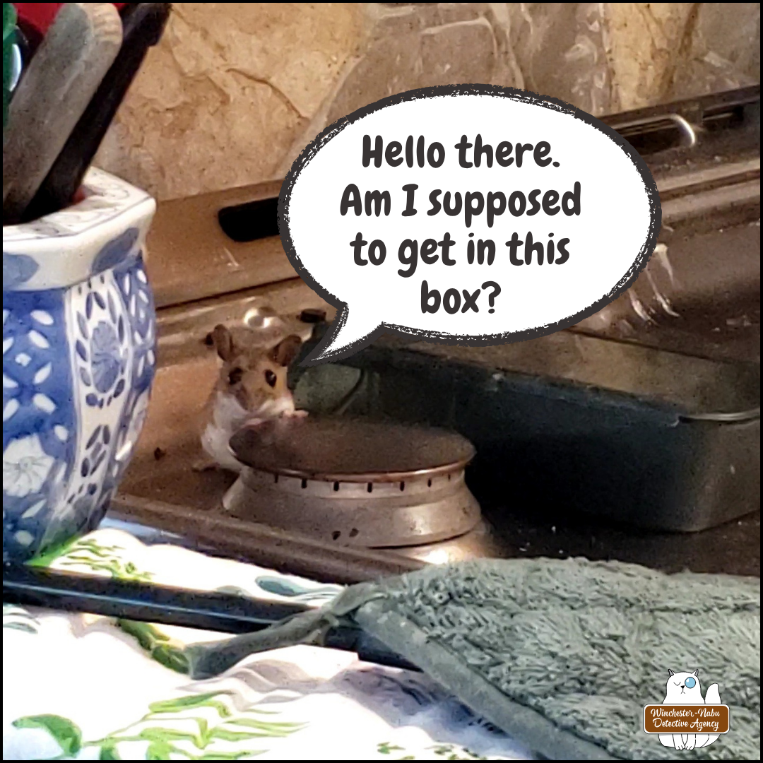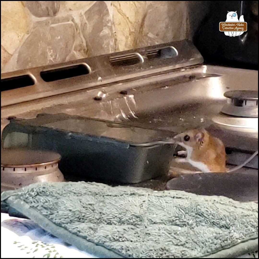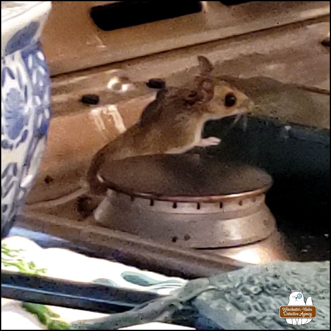 Some house mice (technically in this case Lenier Peró is in the genus, Peromyscus) are not looking to cause any problems. They want what Maslow’s Hierarchy of Needs says: shelter, food and water, and mates to reproduce. All that can be found inside the spaces of the Winchester-Nabu Detective Agency residence, outdoors spaces, vehicles, and buildings. Even if they have to leave to fetch food and water, critters of all kinds are known to find warmth deep within the cars and lawn mowers. In this case, the mouse was captured and relocated safely. Bon voyage!