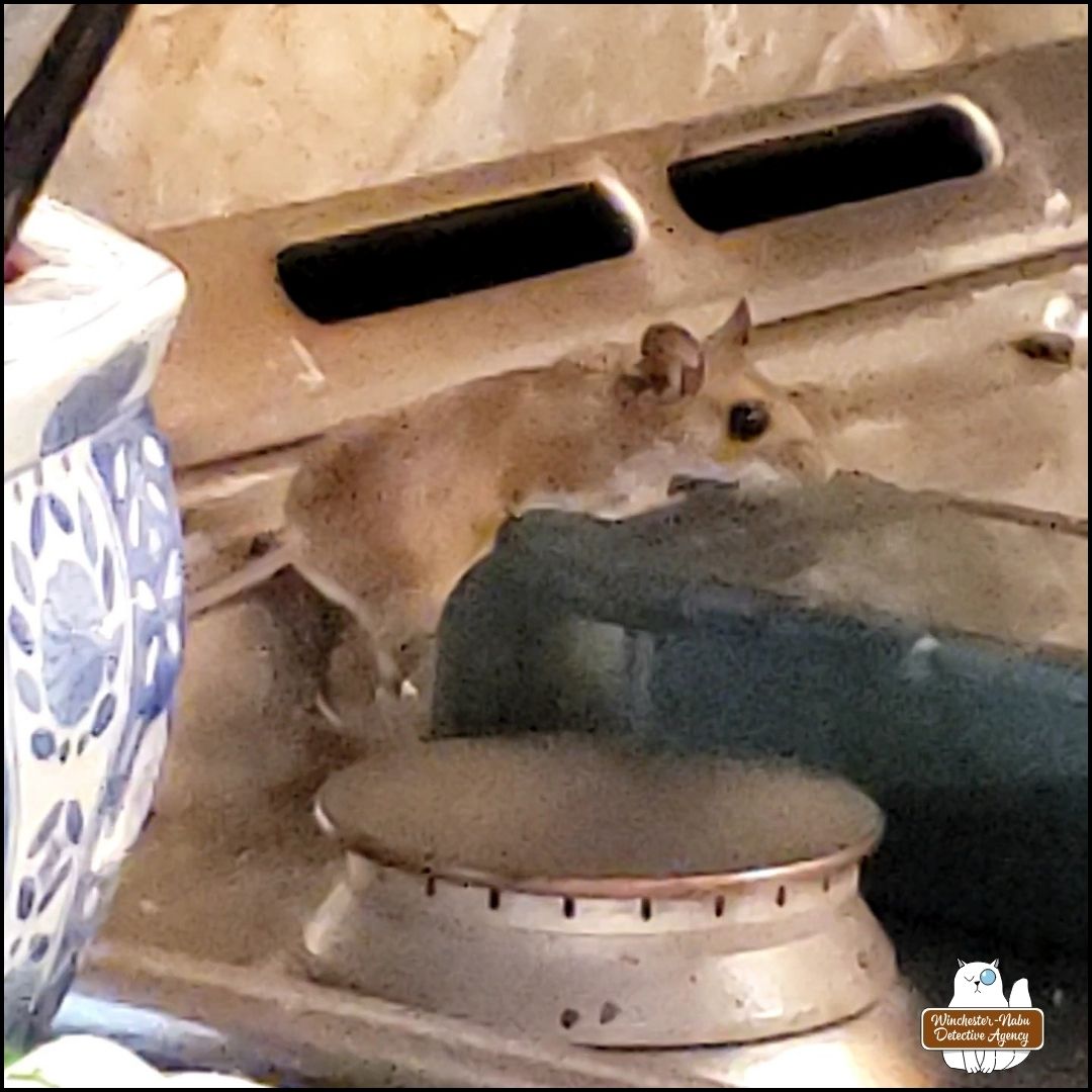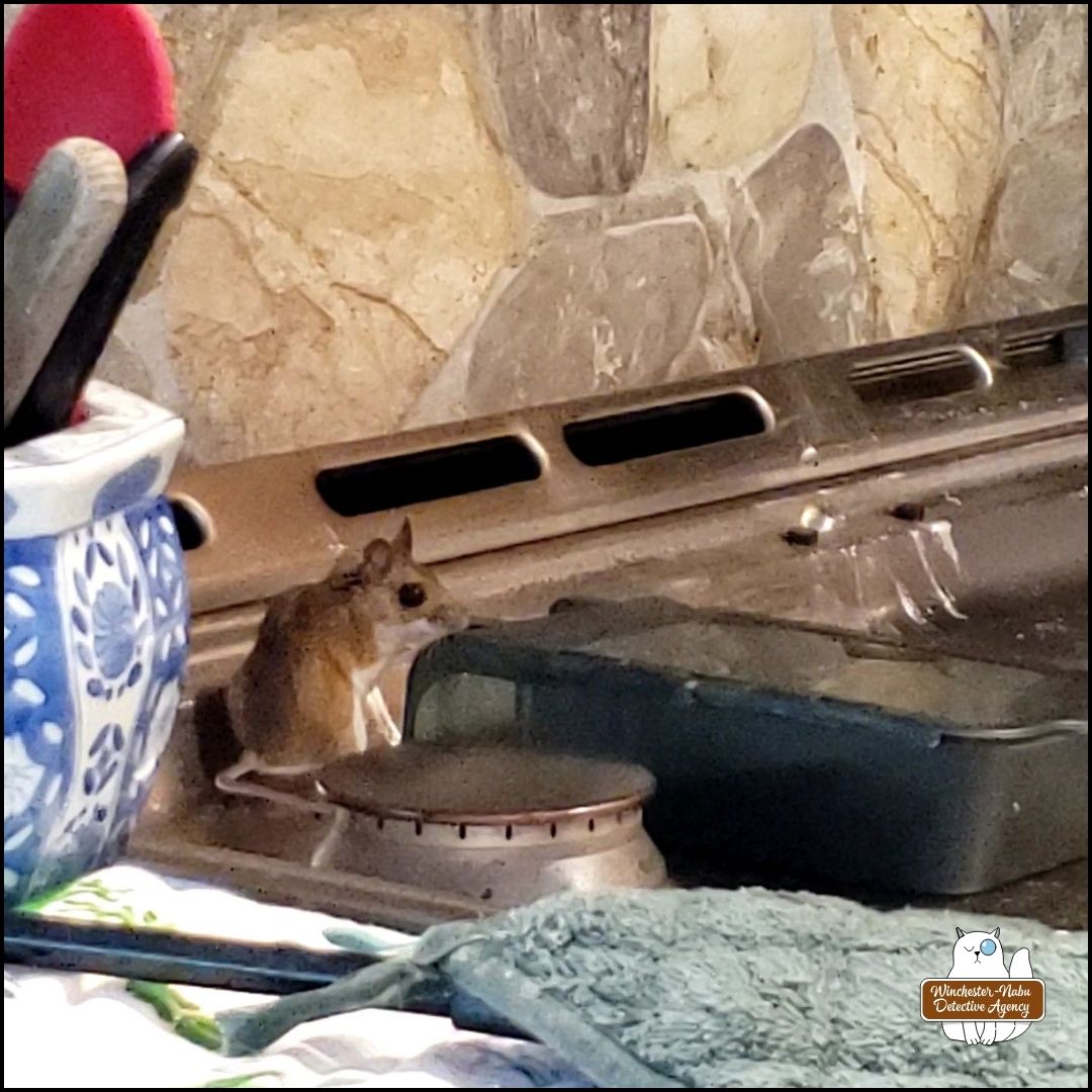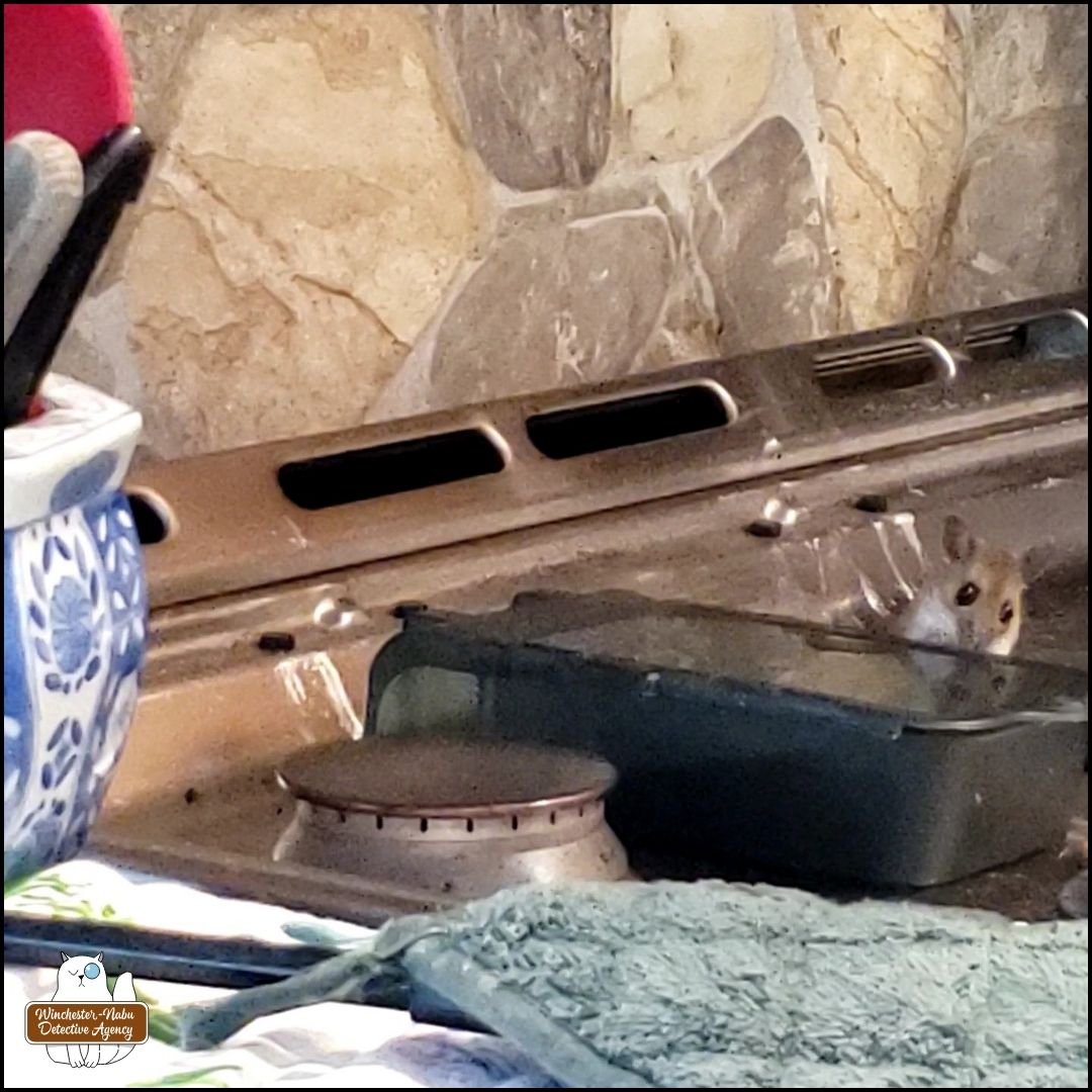I put Gus on top of the (cooled) stove after removing all the heavy burner plates and various cooking implements. He sniffed around, but didn’t take any offensive course of action to find the mouse.