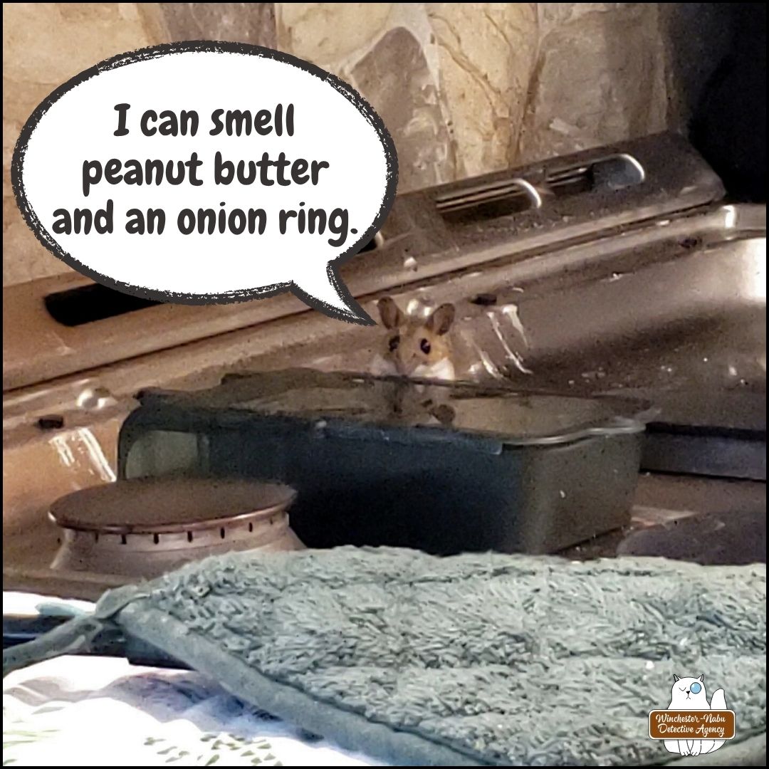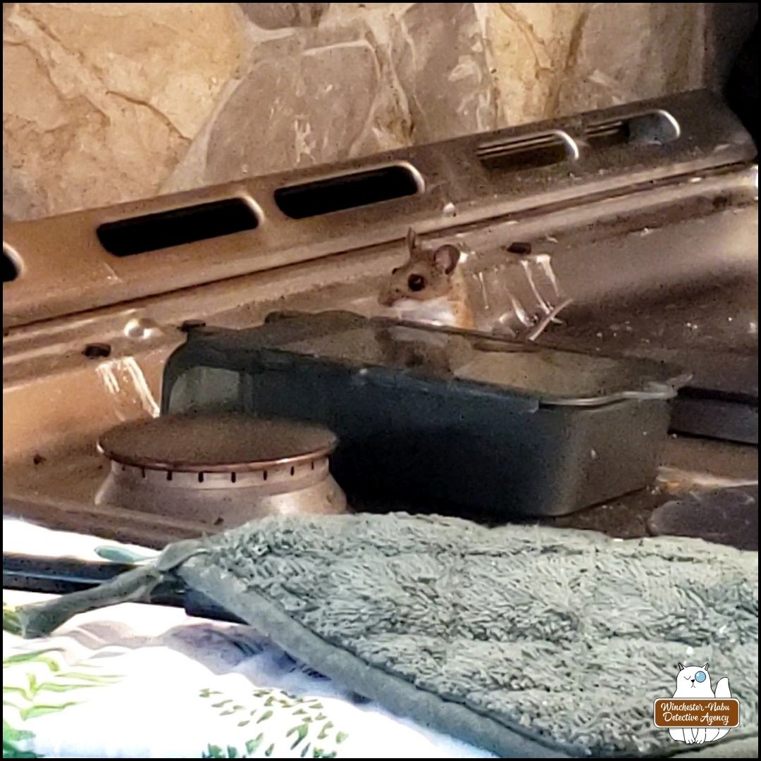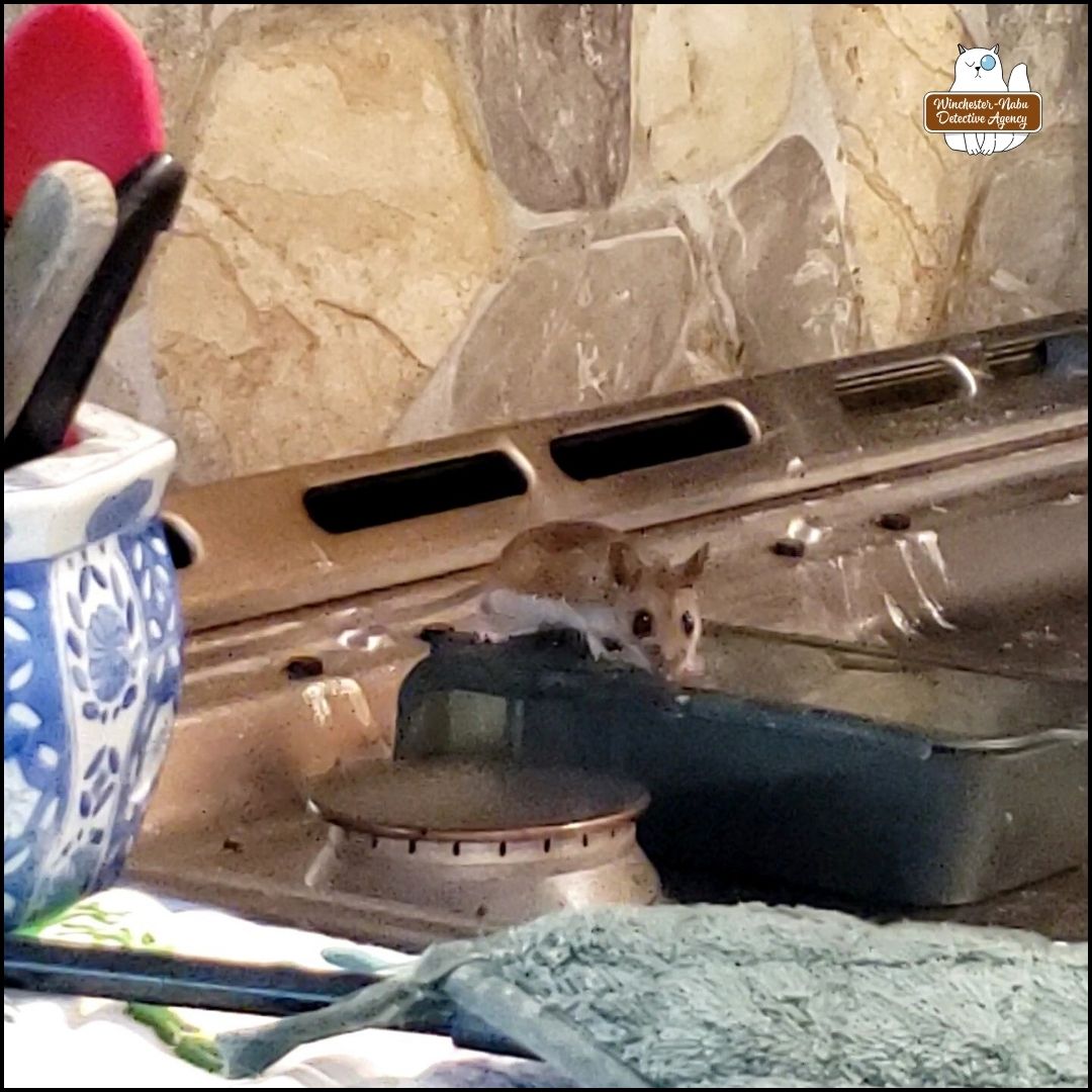 I put Gus on top of the (cooled) stove after removing all the heavy burner plates and various cooking implements. He sniffed around, but didn’t take any offensive course of action to find the mouse.