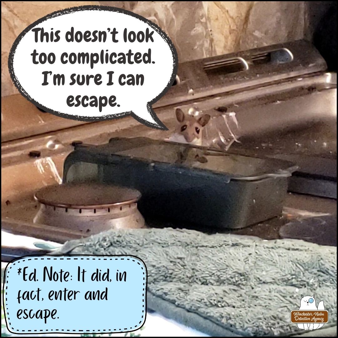 The mouse did enter the trap and escaped by thrashing off the loose roof. The Cook discovered it and put an elastic band around the whole thing to keep the roof in place. We hoped that would work and that the mouse would continue to find the trail of peanut butter and one-inch piece of seasoned onion ring irresistable.