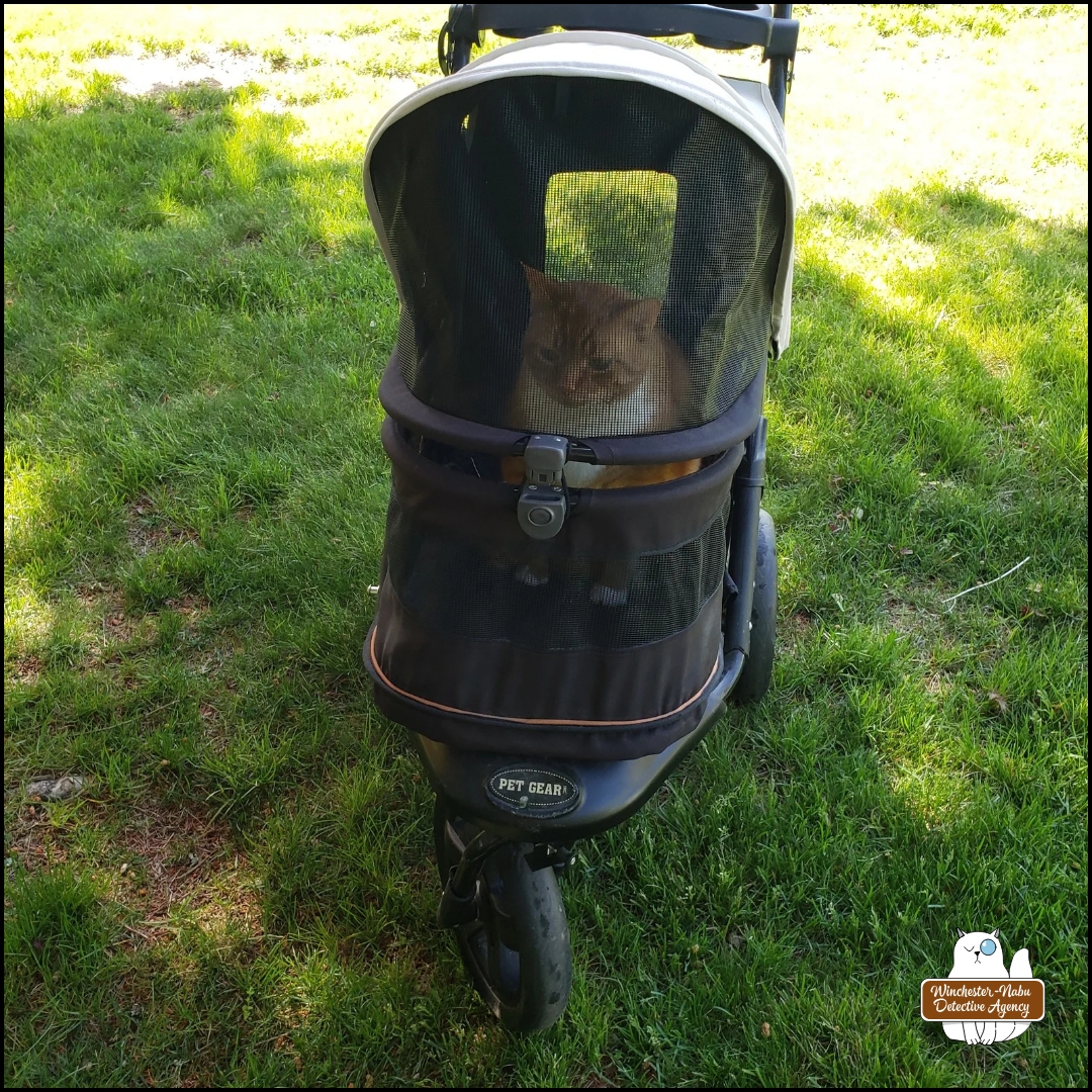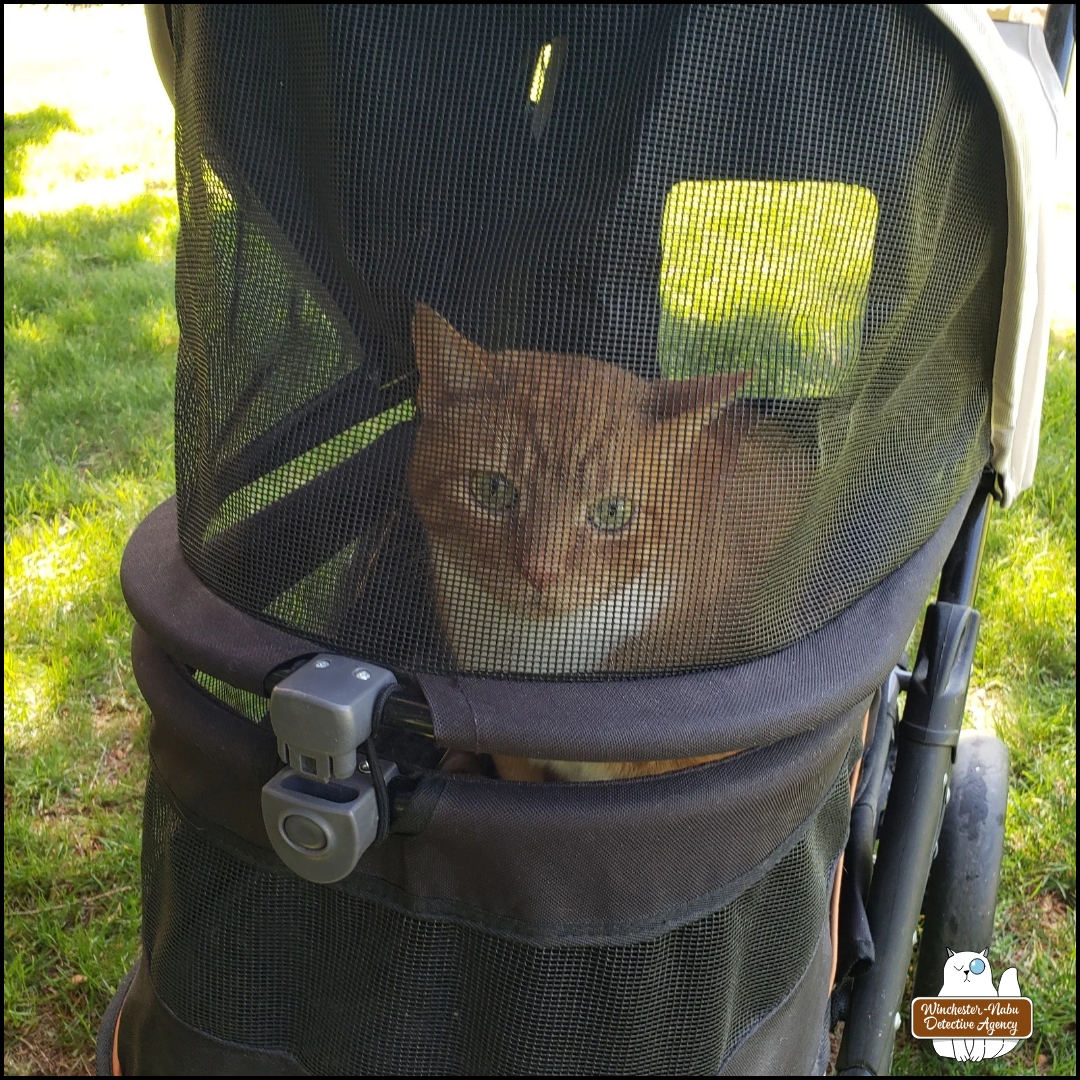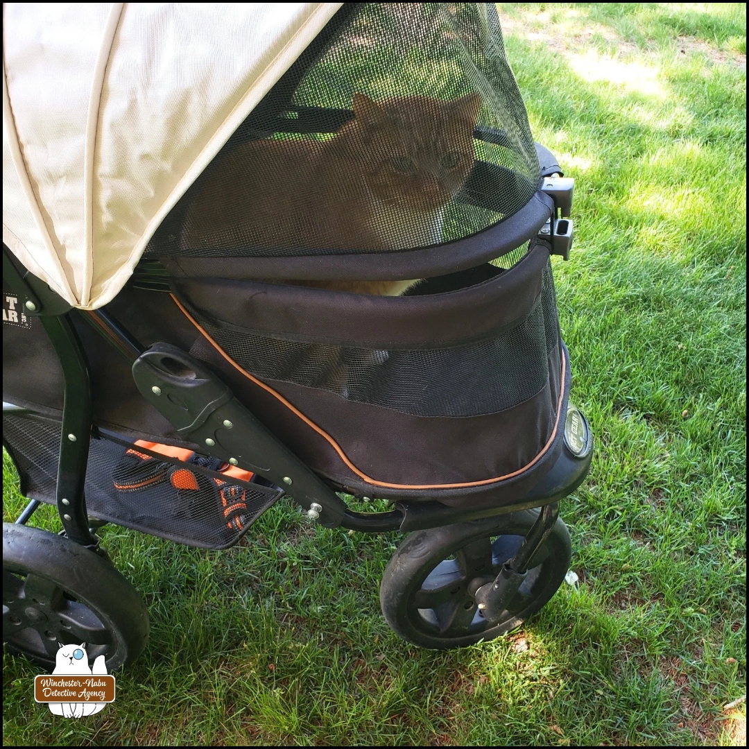 Our ginger tuxedo man walked along the side of the carriage and kept going. Gus was loudly letting me know he was ready for me to open the door, but I was still hopeful about Ollie coming with us. Oliver jumped to the table and walked to the corner where he would normally jump down into his buggy because it would be parked there.