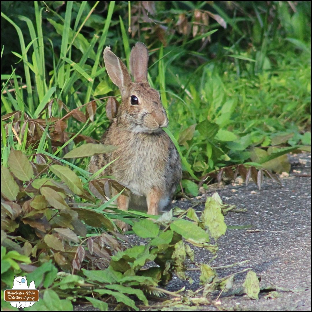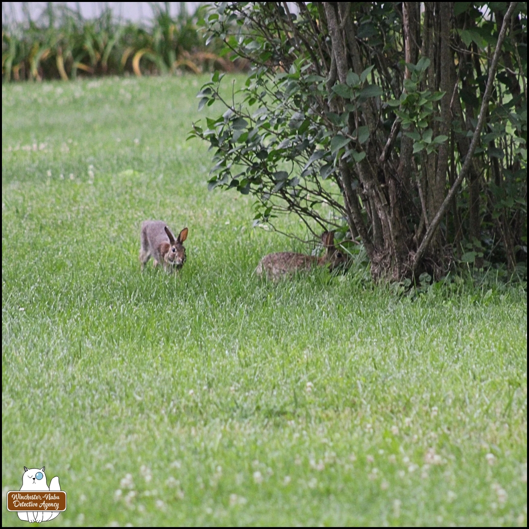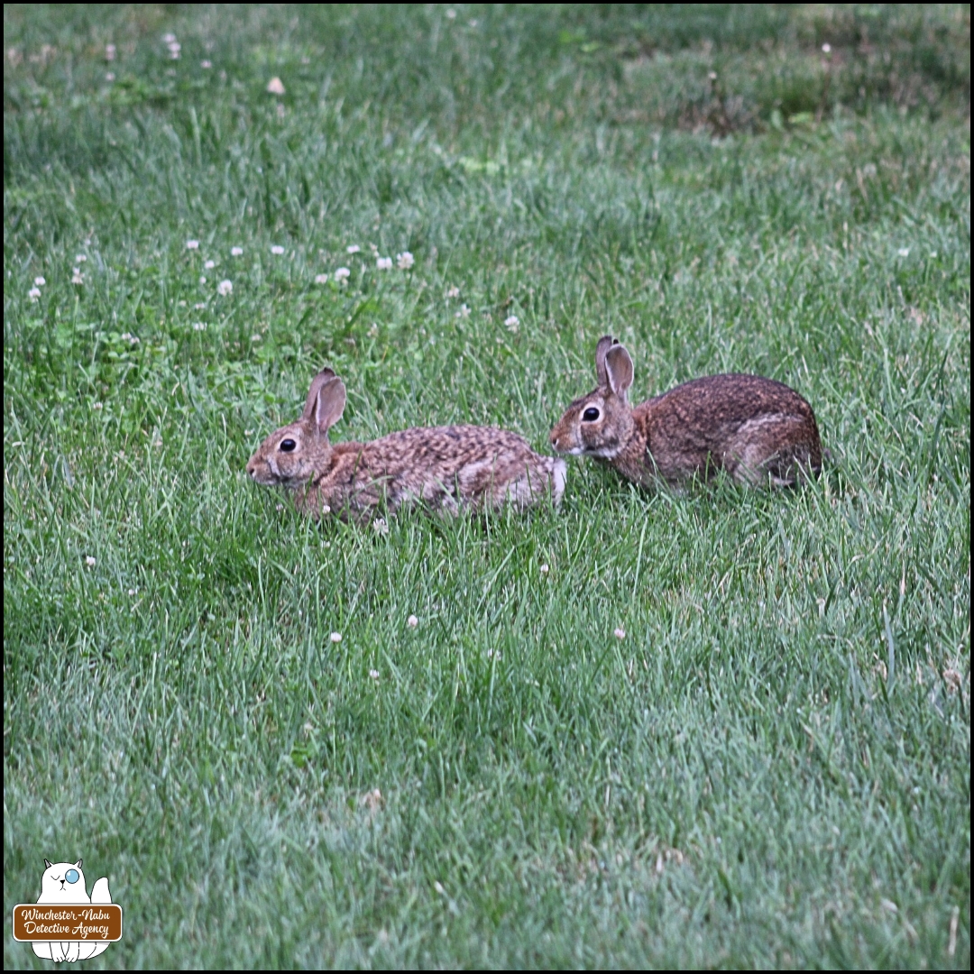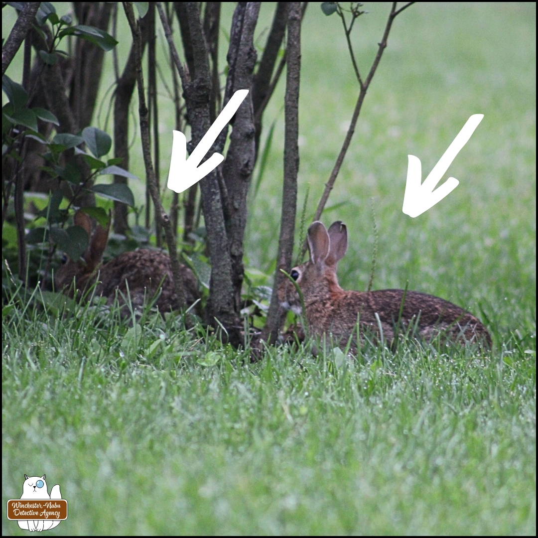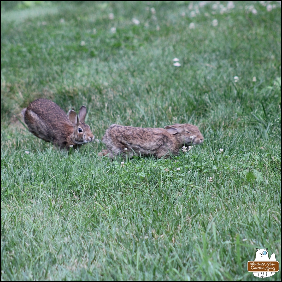 The only glimmer of hope we’ve had about the rabbit/wolpertinger population is the regular visiting by two new faces. One is lighter in color with two right ear notches. She has a peculiar pattern that looks like stitches around her face giving her a Frankenstein appearance—not scary to look at it though. She’s beautiful. She has light tan eyeliner and mottled, often patchy, coat.