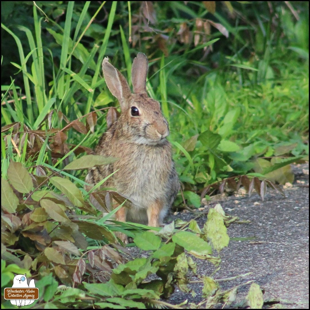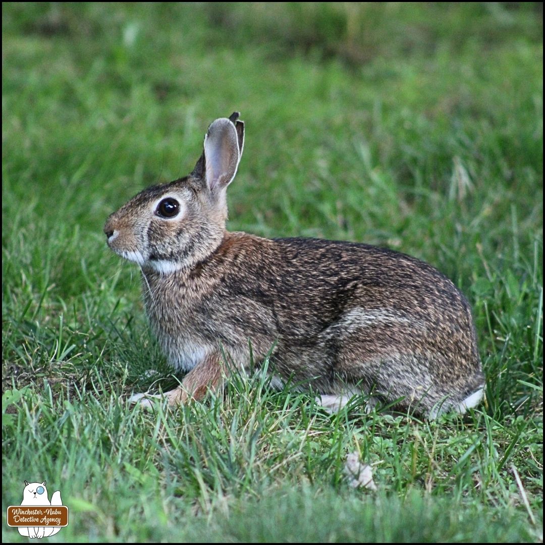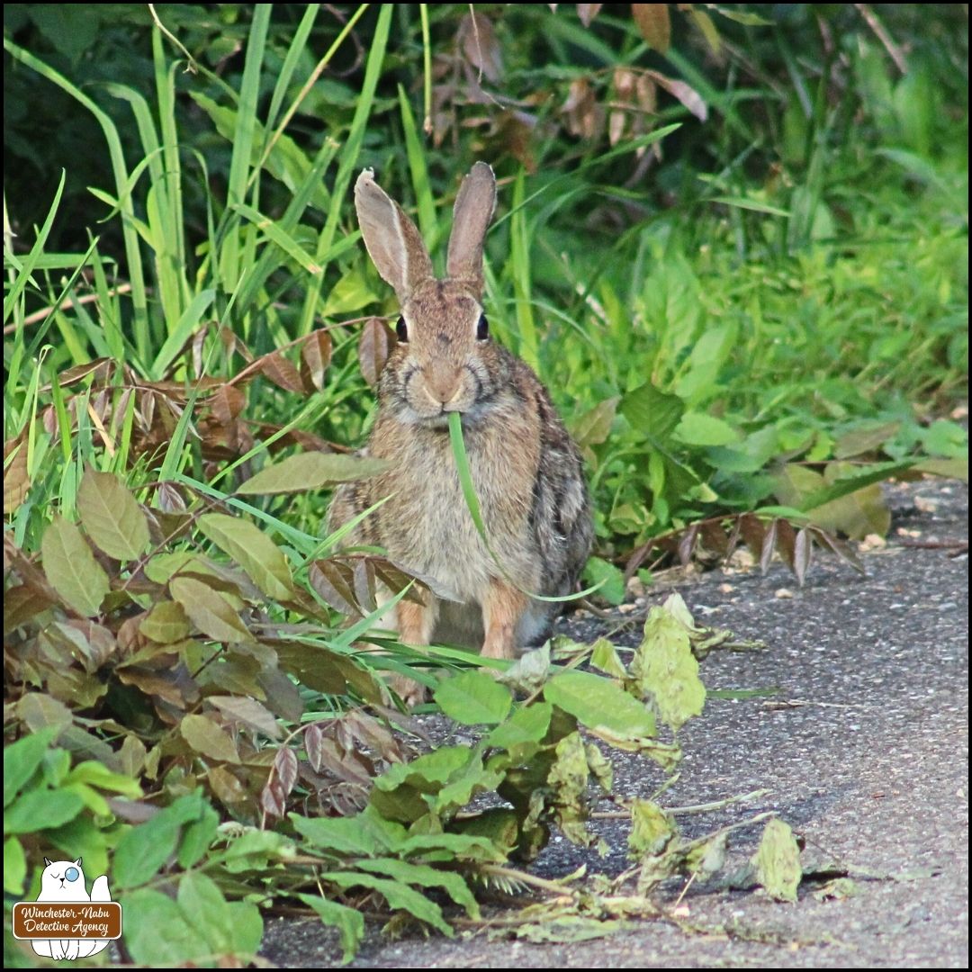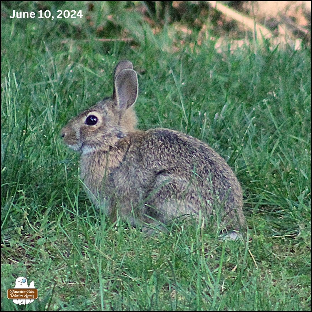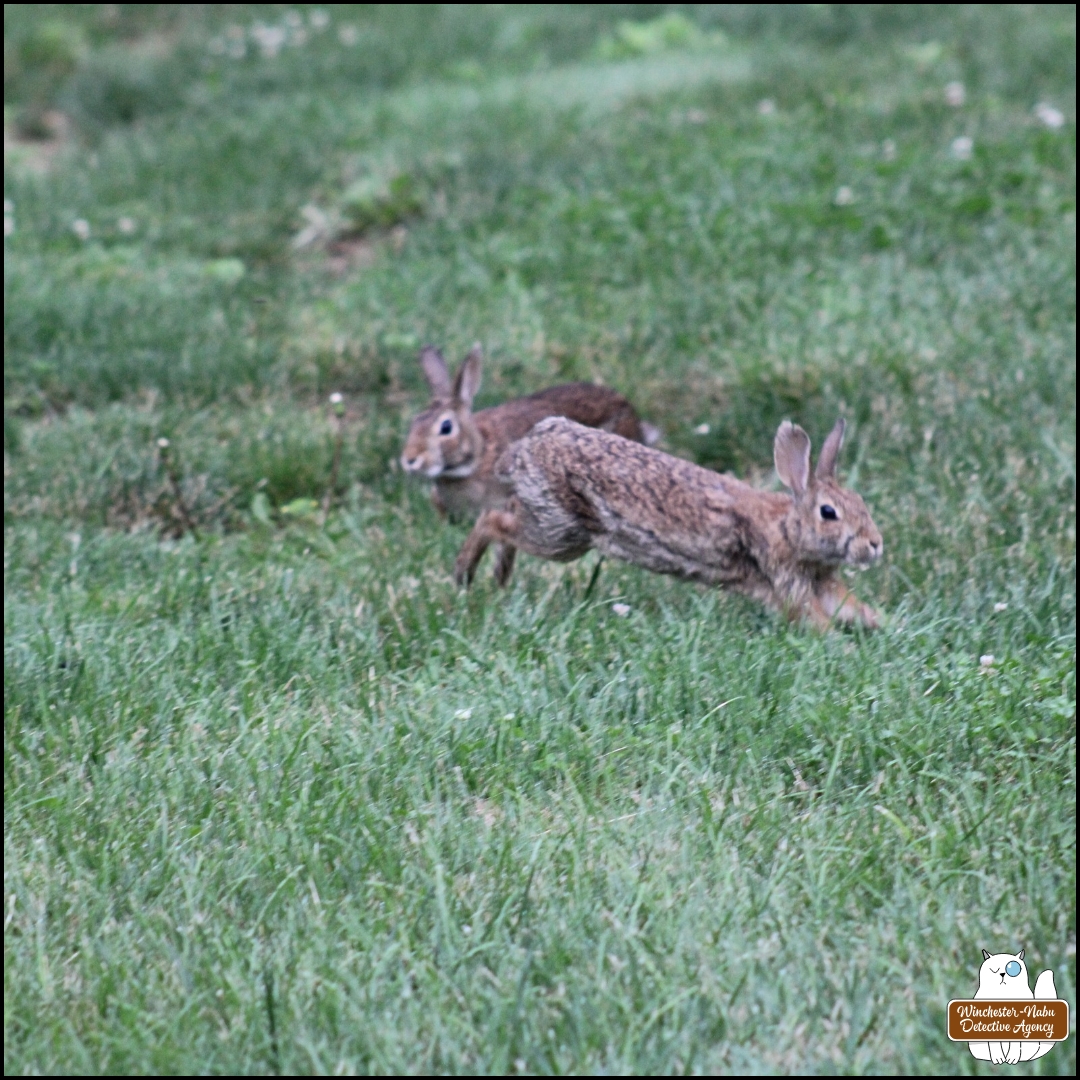 The only glimmer of hope we’ve had about the rabbit/wolpertinger population is the regular visiting by two new faces. One is lighter in color with two right ear notches. She has a peculiar pattern that looks like stitches around her face giving her a Frankenstein appearance—not scary to look at it though. She’s beautiful. She has light tan eyeliner and mottled, often patchy, coat.
