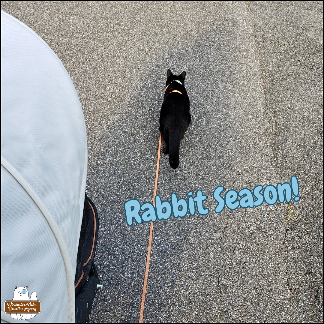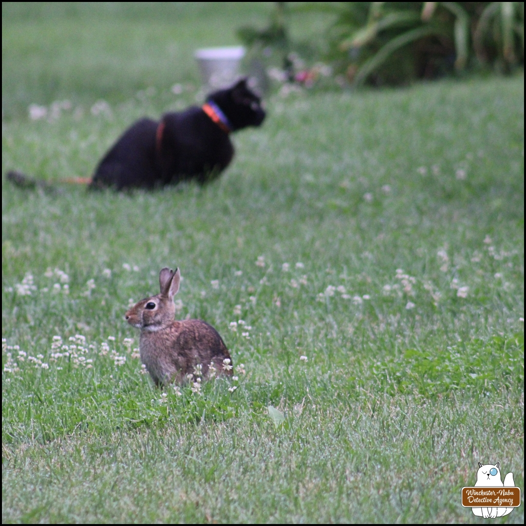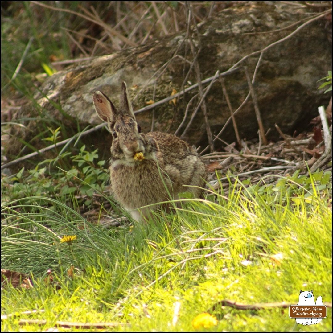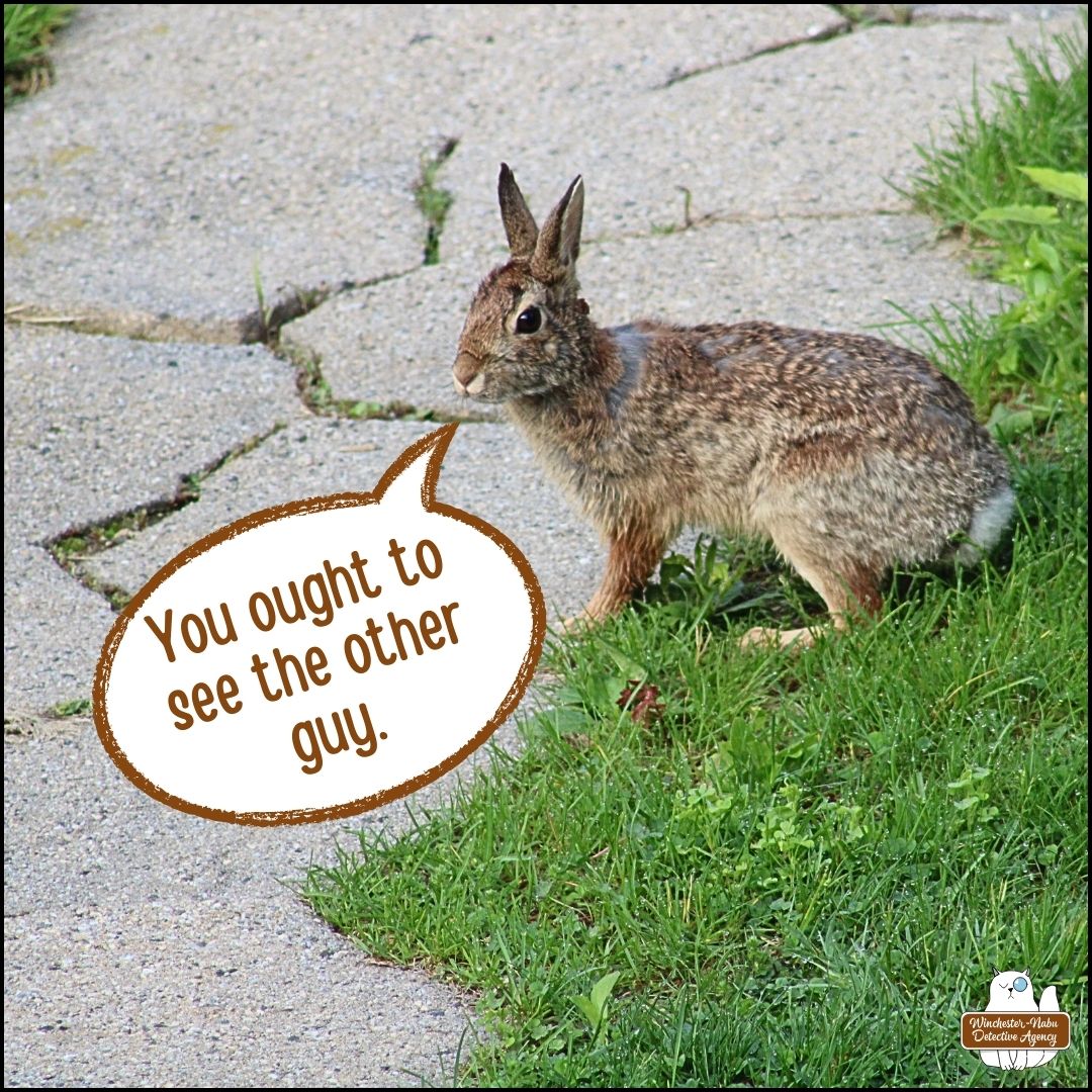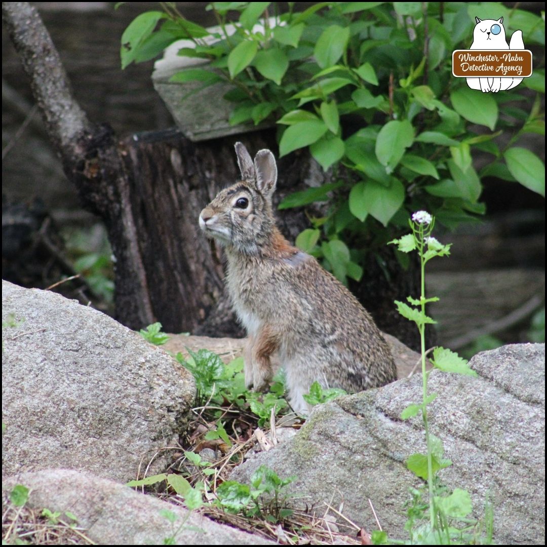 The only glimmer of hope we’ve had about the rabbit/wolpertinger population is the regular visiting by two new faces. One is lighter in color with two right ear notches. She has a peculiar pattern that looks like stitches around her face giving her a Frankenstein appearance—not scary to look at it though. She’s beautiful. She has light tan eyeliner and mottled, often patchy, coat.